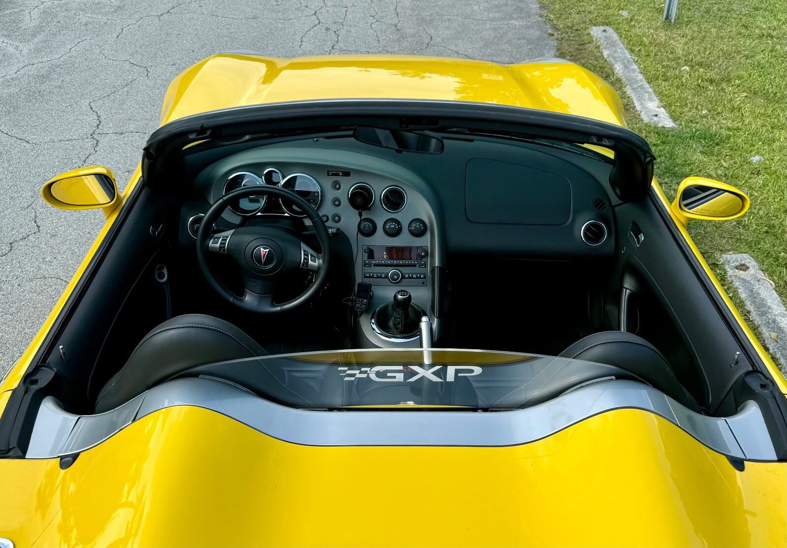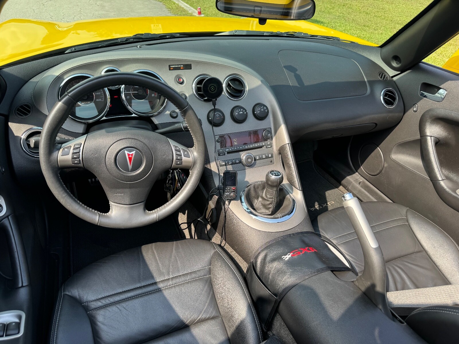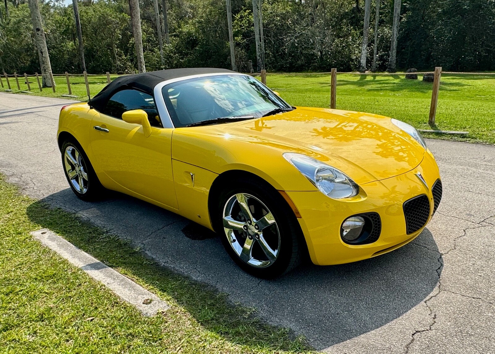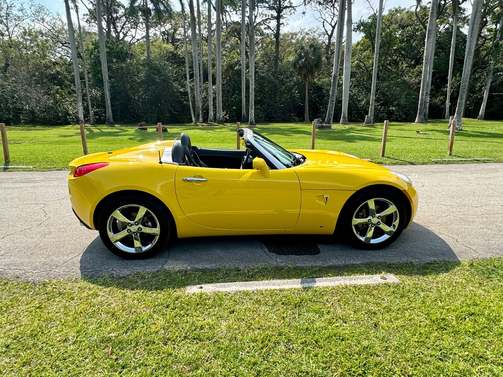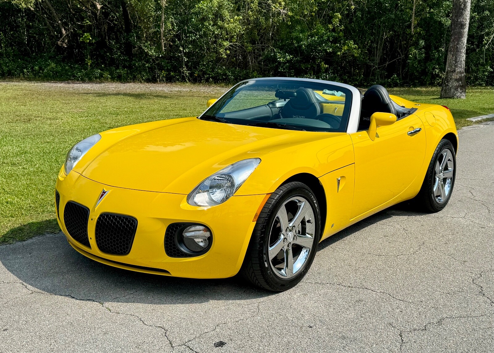 Outstanding 2007 Pontiac Solstace GXP Convertible in the signature Mean Yellow finish! This car checks all the boxes any Solstace buyer would be looking for, a very original car featuring a manual 5-speed transmission, no paintwork, no accidents, only one previous owner and a total of under 18,000 documented miles on the odometer. I purchased this Florida car with about 14,500 miles on her about three years ago and I love driving it when I have a chance. However, it is now being offered for sale to make way for a new vehicle. The vehicle has always been treated as a valuable classic, keeping in covered, clean and dry at all times. The vehicle has received several intelligent upgrades that will add to the owners driving enjoyment, while keeping the vehicle unmodified and very original. These upgrades include silicone yellow and black engine and turbo hoses, a racing backbone replaces the thin backbone that comes with the car to enhance stability, rigidity, and handling. Also a high-performance fuel filter was installed to prevent bad gas from entering the engine. Other important upgrades include a remote control battery kill switch, an always-on airbag bypass that activates driver and passanger airbags in the event of a crash, original equipment trunk spoiler, etched glass wind restrictor with multi-color LED lighting remote control, outstanding SIRIUS ready sound system with a stubby radio antenna, bluetooth phone and streaming music ready, saddle bags storage for center console, original books, maintenance records, two keys with remote controls, two of battery kill switch remote controls, assorted spare parts, accessories, and all original parts that had been upgraded.