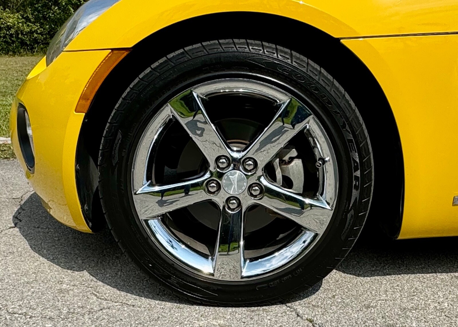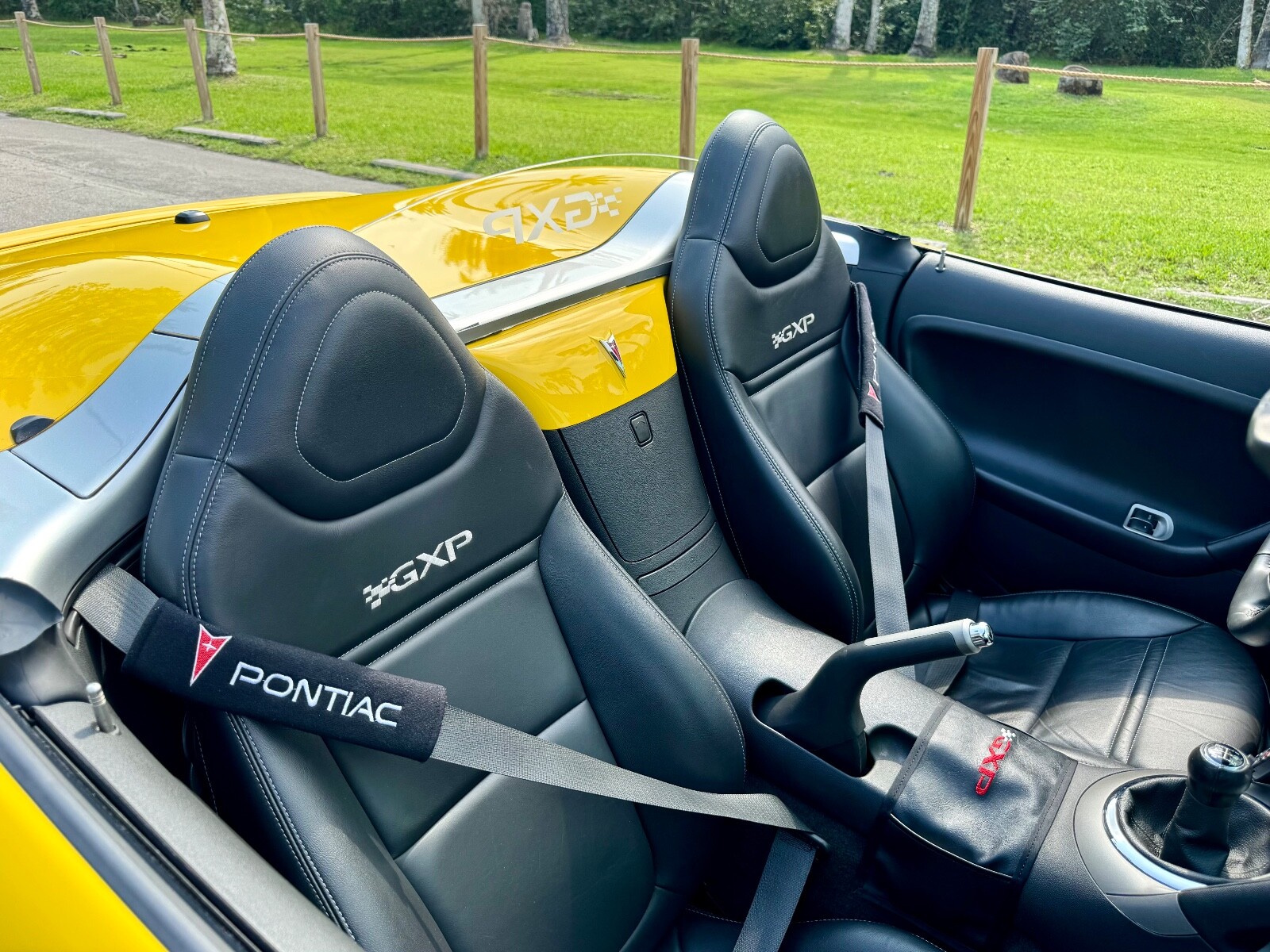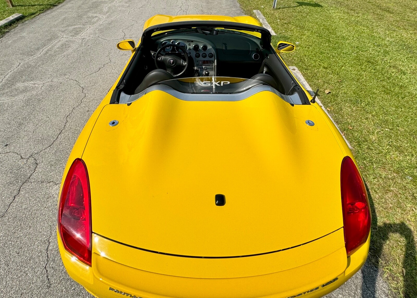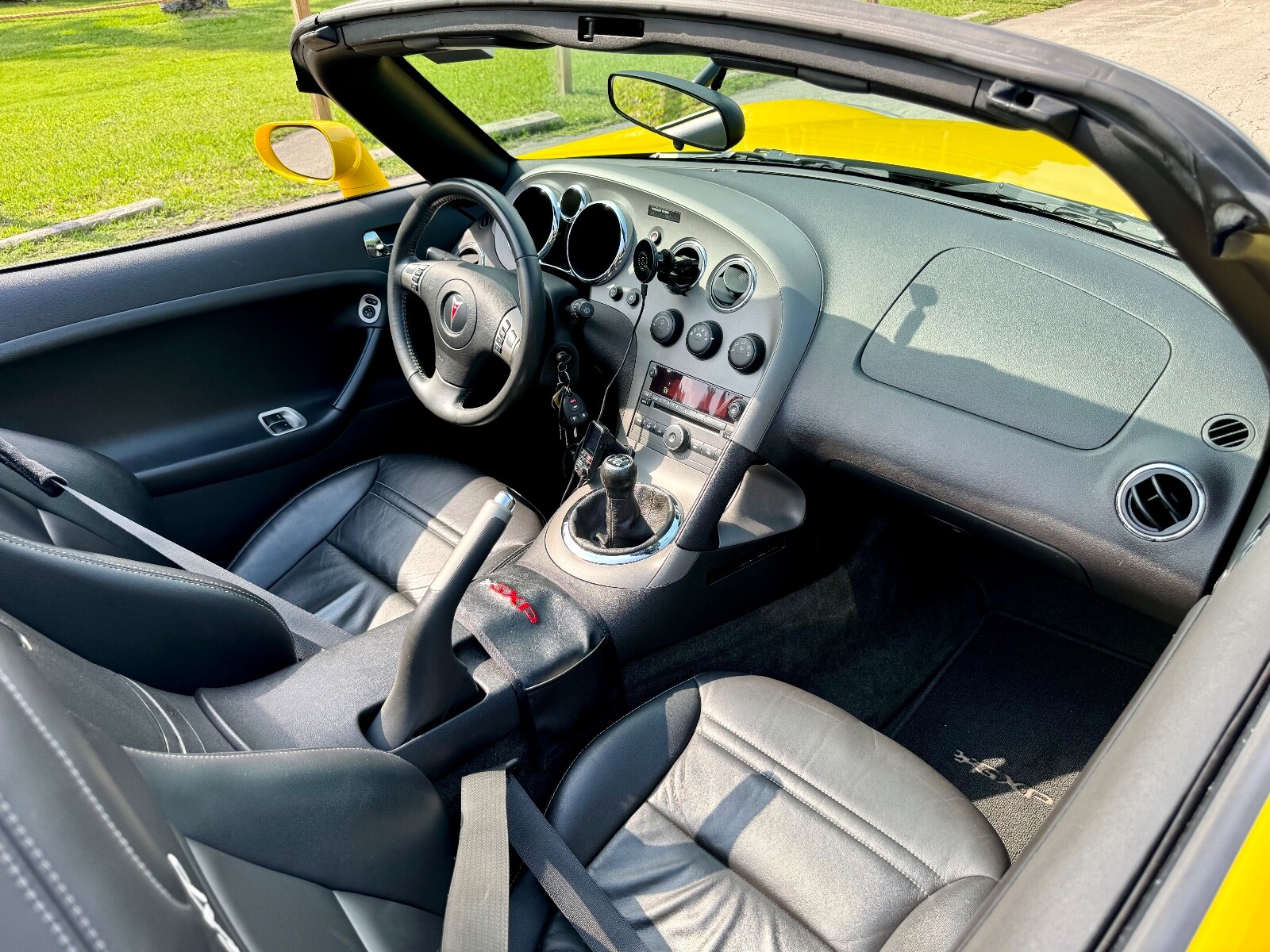 Outstanding 2007 Pontiac Solstace GXP Convertible in the signature Mean Yellow finish! This car checks all the boxes any Solstace buyer would be looking for, a very original car featuring a manual 5-speed transmission, no paintwork, no accidents, only one previous owner and a total of under 18,000 documented miles on the odometer. I purchased this Florida car with about 14,500 miles on her about three years ago and I love driving it when I have a chance. However, it is now being offered for sale to make way for a new vehicle. The vehicle has always been treated as a valuable classic, keeping in covered, clean and dry at all times. The vehicle has received several intelligent upgrades that will add to the owners driving enjoyment, while keeping the vehicle unmodified and very original. These upgrades include silicone yellow and black engine and turbo hoses, a racing backbone replaces the thin backbone that comes with the car to enhance stability, rigidity, and handling. Also a high-performance fuel filter was installed to prevent bad gas from entering the engine. Other important upgrades include a remote control battery kill switch, an always-on airbag bypass that activates driver and passanger airbags in the event of a crash, original equipment trunk spoiler, etched glass wind restrictor with multi-color LED lighting remote control, outstanding SIRIUS ready sound system with a stubby radio antenna, bluetooth phone and streaming music ready, saddle bags storage for center console, original books, maintenance records, two keys with remote controls, two of battery kill switch remote controls, assorted spare parts, accessories, and all original parts that had been upgraded.