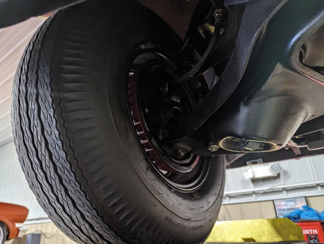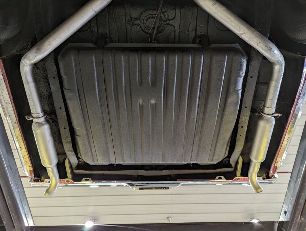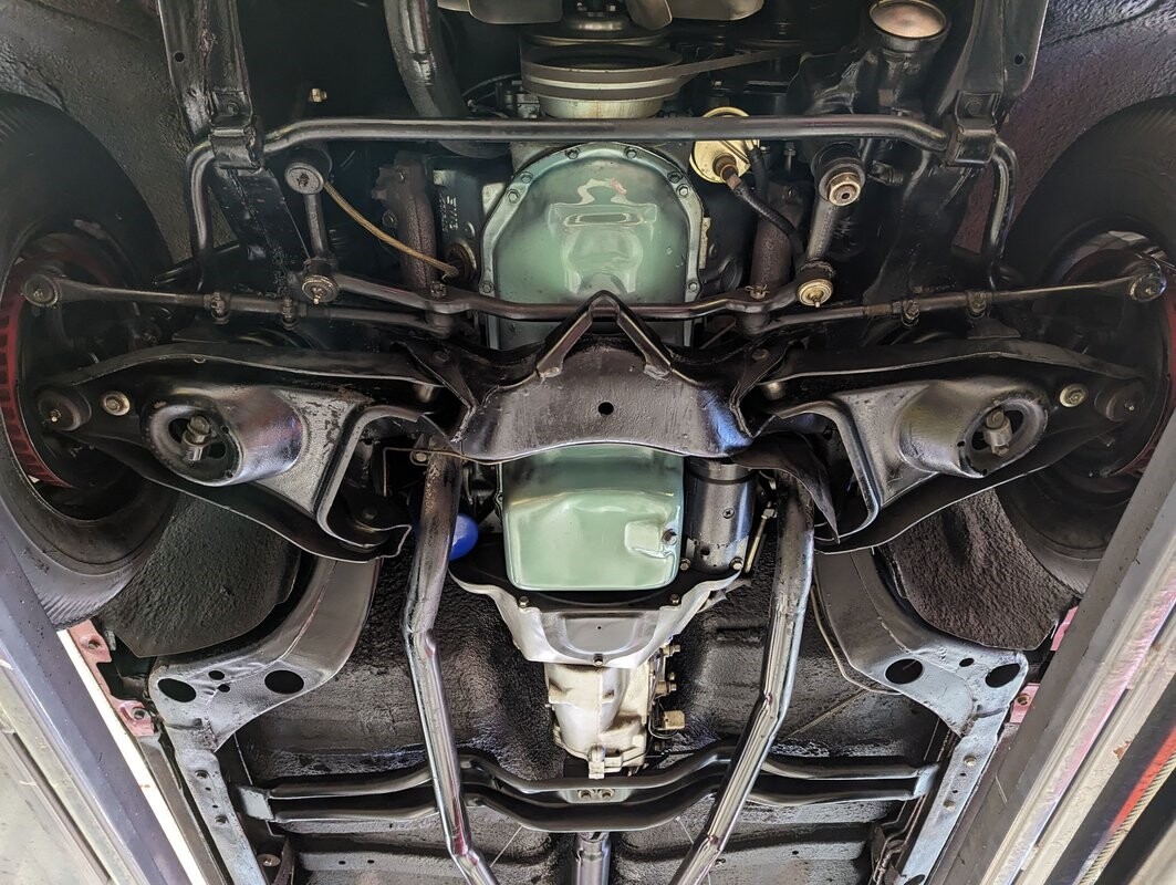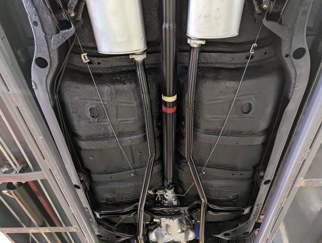 UNDERSIDE: The body was off the frame during restoration. All rock solid floors has the factory undercoat, it was cleaned and freshened up with some black paint. The chassis was all stripped down, repainted then rebuilt. The steering and suspension were redone, it even has correct spiral shocks. The brake system has been thoroughly gone through. It has optional metallic brake linings on the finned drums at all four wheels, e-brake is hooked up. Correct style dual exhaust with the offset mufflers and resonators in the tailpipes. Looking up at the motor it is very fresh, has correct starter. The correct Muncie 4-speed is also fresh with a Hurst shift linkage. Restored drive shaft with the assembly line markings reapplied. Correct 3.55 posi rear end.
