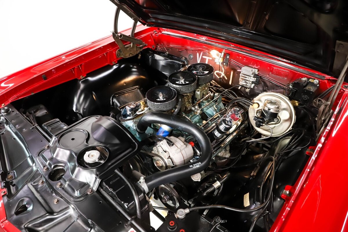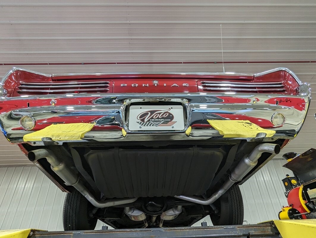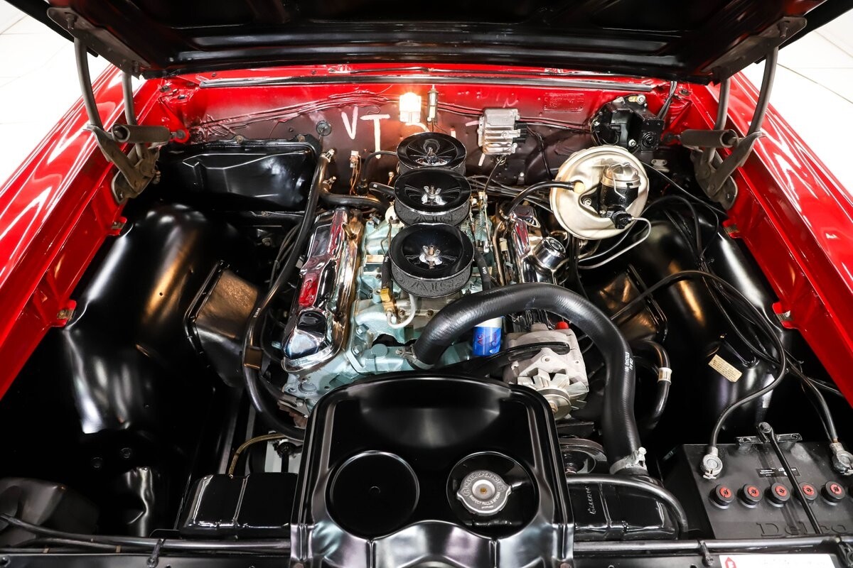 ENGINE COMPARTMENT: Rebuilt original 389-360 hp Tri-Power engine. Correct casting code and date, correct WS code and the unit number matches the protect-o-plate. It has correct big valve 093 heads, 068 intake and large venturi carbs. It also has the correct chrome valve covers and air cleaner lids, correct foam filters, choke, fuel lines, fuel filter etc. The entire engine compartment is detailed to the way that specific factory would have done it: proper overspray on the firewall with the assembly line markings. It also has reproduction hoses, clamps, spring clamp battery cables and Delco battery topper. Other options include transistor ignition, power steering, power brakes and under hood lamp. Everything looks proper: the battery is secured, windshield washers are hooked up.