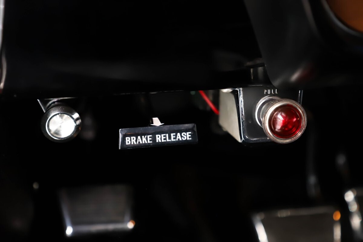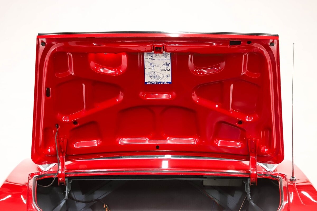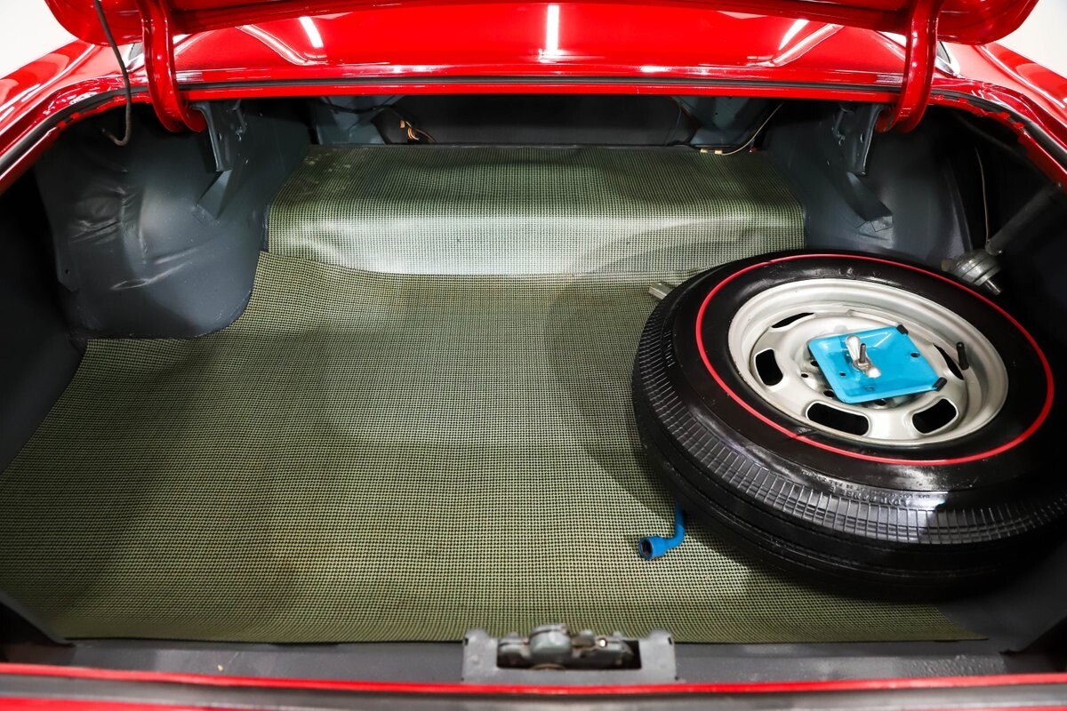 TRUNK COMPARTMENT: You actually pump a plunger in the glovebox and that pops the trunk! Yes, that's a factory option. It also has an optional trunk light that works. Reproduction weatherstrip and 2 piece trunk mat. It is complete with a matching reproduction redline tire on a Rally 1 wheel and correct jack assembly. Inside is clean metal with a spatter paint.