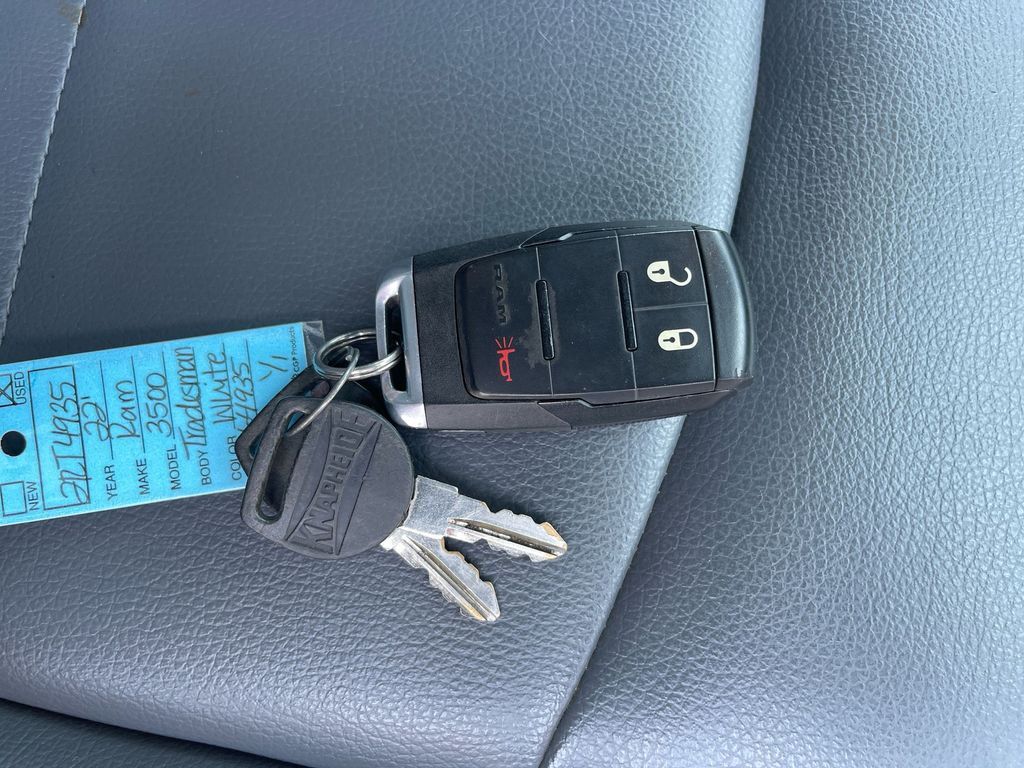 THIS VEHICLE INCLUDES THE FOLLOWING FEATURES AND OPTIONS: Cold Weather Group (Engine Block Heater), Heavy Duty Snow Plow Prep Group, Max Tow Package (12.0 Dual Wheel Rear Axle and Add 4.10 Axle Ratio), Quick Order Package 2YA Tradesman (Matte Black Grille Surround), Safety Group (Adaptive Steering System), 3500 Tradesman 4WD, 102 mph Maximum Speed, 2 Way Rear Headrest Seat, 220 Amp Alternator, 4-Wheel Disc Brakes, 4.10 Axle Ratio, 40/20/40 Split Bench Seat, 6 Speakers, ABS brakes, Air Conditioning, Bright Wheel Skins, Cargo & CHMSL Lamp, Center Hub, Compass, Cruise Control, Delay-off headlights, Driver door bin, Dual front impact airbags, Dual Rear Wheels, Electric Shift-On-The-Fly Transfer Case, Electronic Stability Control, Emergency communication system: SiriusXM Guardian, Front anti-roll bar, Front Armrest w/Cupholders, Front Center Armrest w/Storage, Front License Plate Bracket, Fully automatic headlights, Global Telematics Box Module (TBM), GPS Antenna Input, HD Vinyl 40/20/40 Split Bench Seat, Heated door mirrors, Integrated Voice Command w/Bluetooth, Manual Adjust 4-Way Driver Seat, Manual Adjust 4-Way Front Passenger Seat, Manufacturer's Statement of Origin, MOPAR Front & Rear Rubber Floor Mats, MOPAR Front & Rear Rubber Floor Mats (DISC), Occupant sensing airbag, Outside temperature display, Overhead console, ParkSense Rear Park Assist System, ParkView Rear Back-Up Camera, Passenger door bin, Passenger vanity mirror, Power door mirrors, Power steering, Power windows, Radio data system, Radio: Uconnect 3 w/5 Display, Rear anti-roll bar, Rear Folding Seat, Rear Window Defroster, Remote Keyless Entry, Tachometer, Temperature & Compass Gauge, Tilt steering wheel, Traction control, Trailer Brake Control, Trailer Light Check, Turn signal indicator mirrors, Variably intermittent wipers, Voltmeter, Wheels: 17 x 6.0 Argent Steel, and Wheels: 18 x 8.0 Steel.