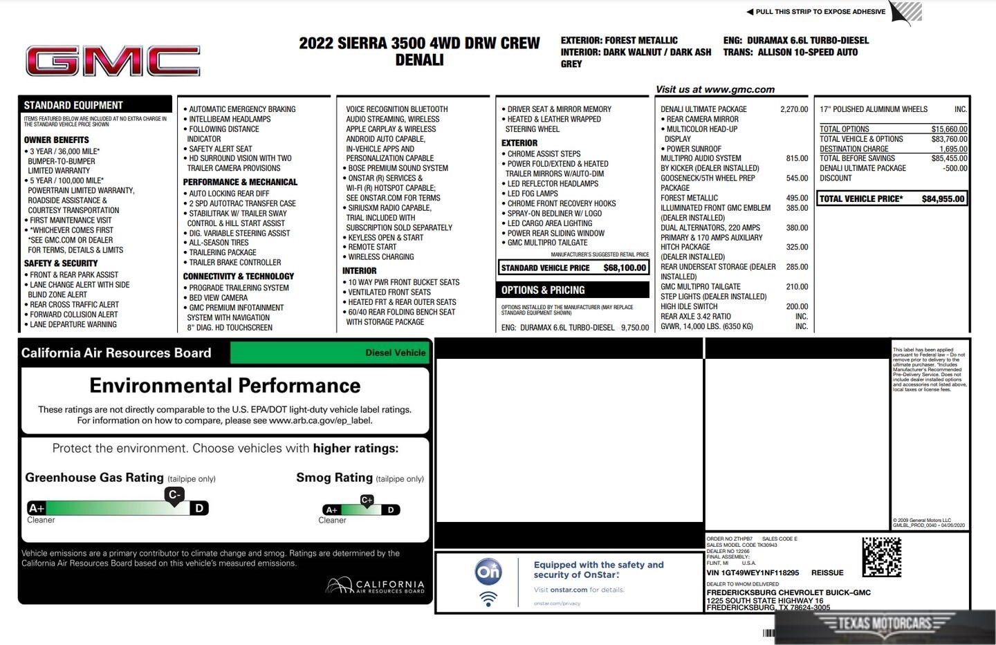 Step into the realm of unmatched power and opulence with the 2022 GMC Sierra 3500HD Denali 4x4. This spectacular truck is infectious in it's confidence, imbuing those behind the wheel with the right stuff. Equipped with a monster Duramax 6.6L Biodiesel Turbo V8 engine and Allison 10-Speed Shiftable Automatic transmission, the Sierra can do anything you ask of it. Furthering that aim is the Denali package, replete with features and add-ons that make it luxurious and convenience packed.