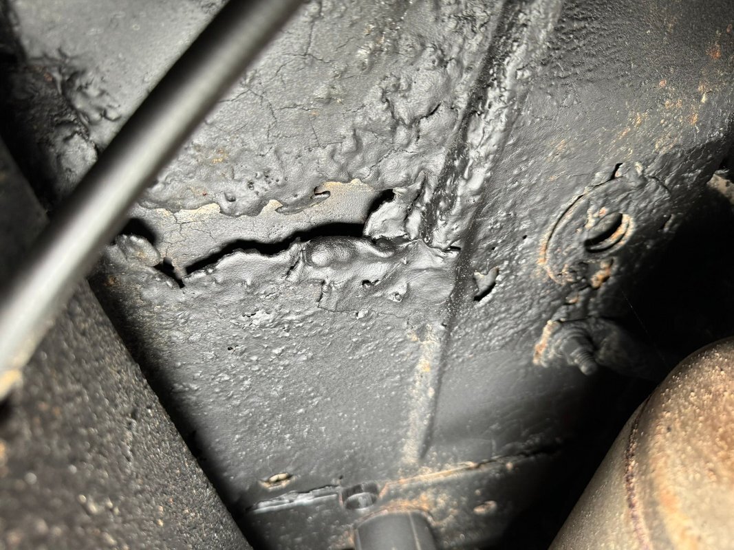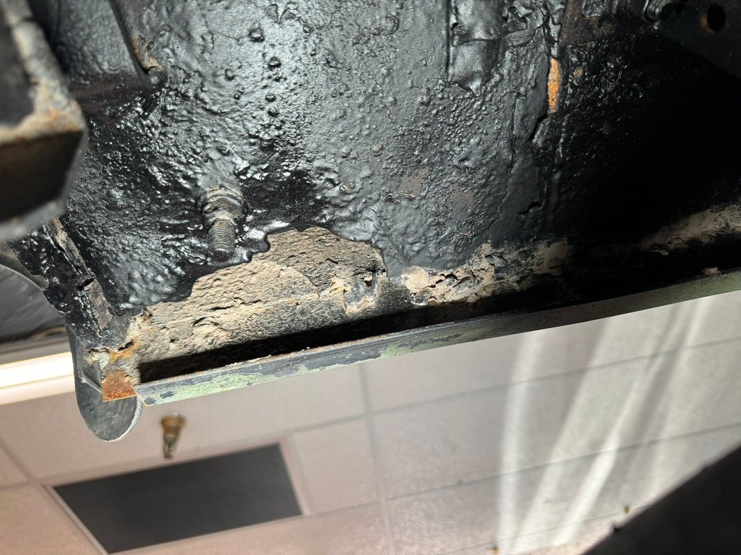 Underneath matches the body with some evidence of flooring and frame repairs along with a few areas of invasive rust still showing on the frame. I can see Moser 1 piece rear axles, sway bar disconnects, and leaf springs for all the suspension. Power disc brakes are upfront and power drums for the back. There are no catalytic converters on the dual side exit exhaust.