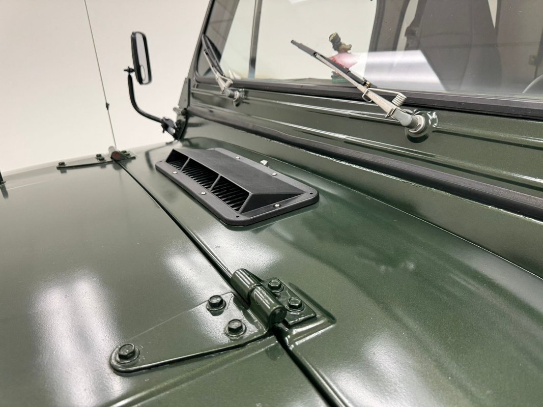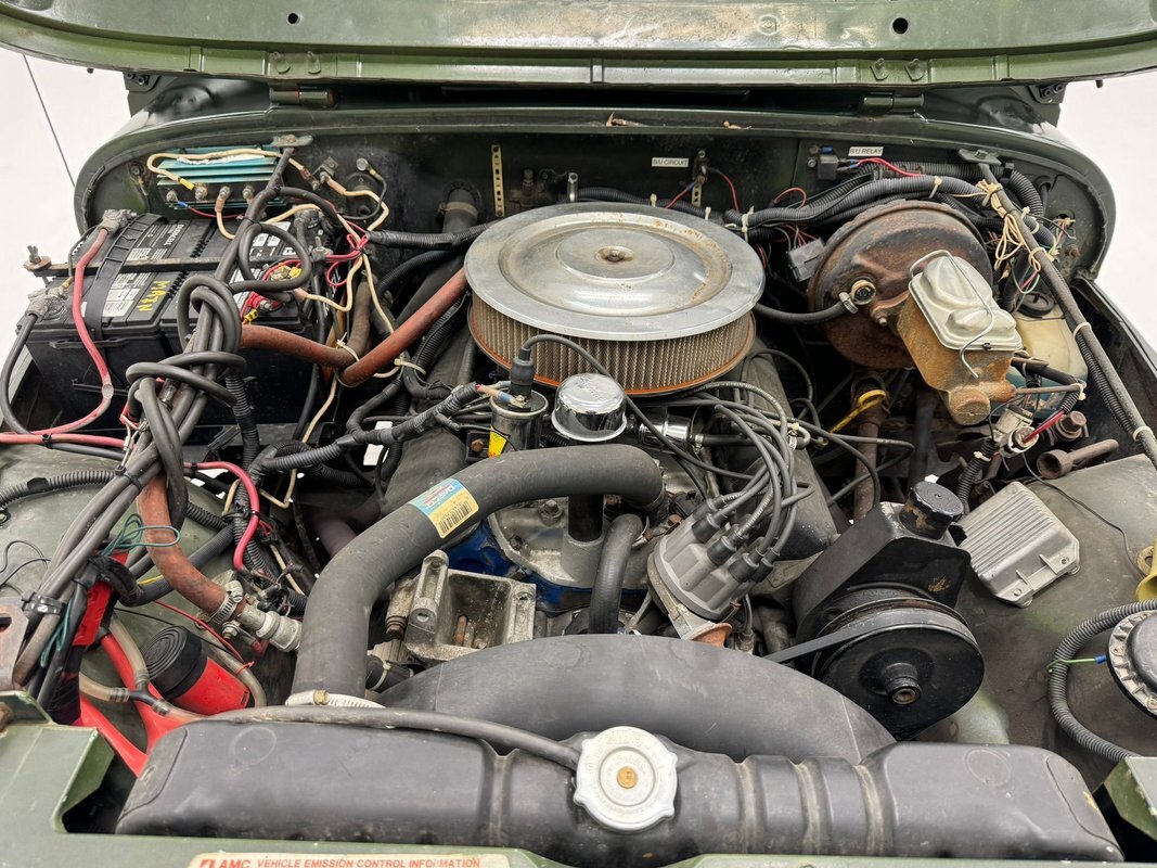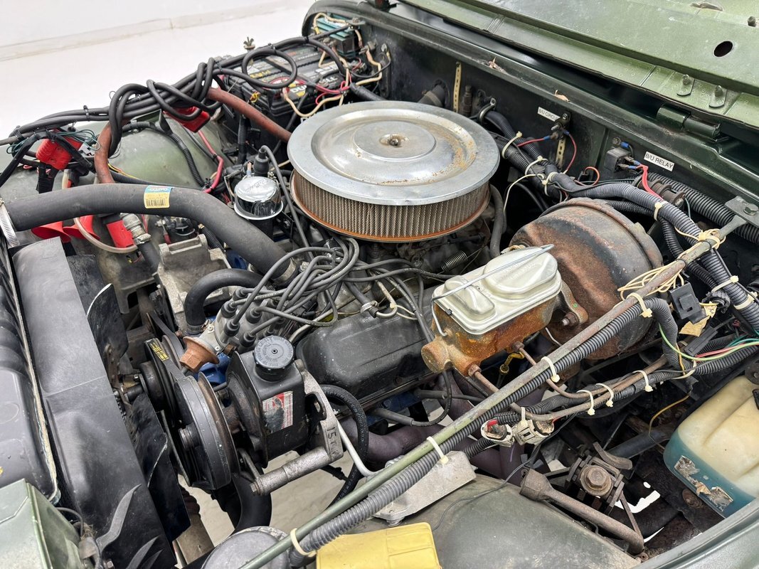 As I loosen the front lockdowns, and raise the hood, I am greeted with a slightly dusty engine bay, a gaggle of wires and hoses and a 360ci V8 which was rebuilt in 2014. It has been bored .040 over and is topped by a single Edelbrock 4-barrel carburetor. This is backed by a 4-speed manual transmission. In front there is a Dana 30 axle, and on back an Dana 20 axle and in the middle a Dana 300 twin stack transfer case. The consignor states the Jeep has a new clutch and pressure plate. It is a dual battery setup with an isolator.