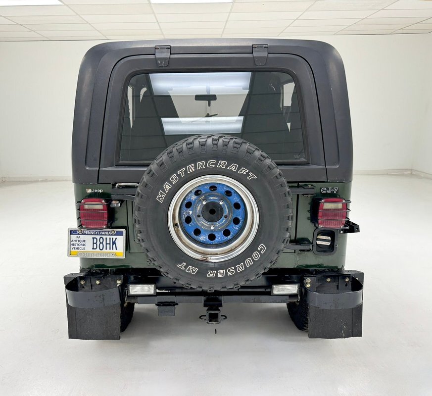 Dark ivy green covers the grille, hood, doors and side panels of this social climber. The panels are rough, showing some underlying rust, bubbles, paint fade and undulating of the steel. The Jeep's doors, fender edges and hardtop are in black, which also shows some rusting, dripping of corrosion on the door handles into the paint, and overall slight fading. There is also a soft top and bikini top that goes with this 4x4 as well as a car cover. In front there is a black bumper and perched on it are some extra KC caged protected lighting and a Warn M8274 winch. Photos show the flywheel and aluminum covering on the side of the winch are corroded but there is plenty of pulling wire to go around. Black painted side view mirrors hang off of each side. In back a swinging spare tire is mounted to the rear tailgate, and above is a lifting door for access to the upper interior. Below is another black steel bumper and some mud flaps as well as a hitch. More KC cages for the tail lights are here too. 15-inch blackened spoked wheels are wrapped with good condition knobby rubber all terrain tires.