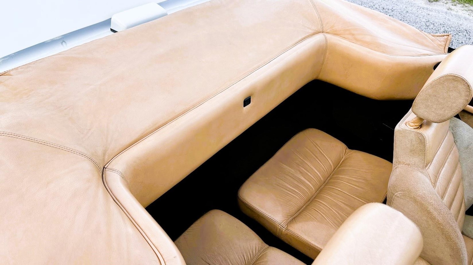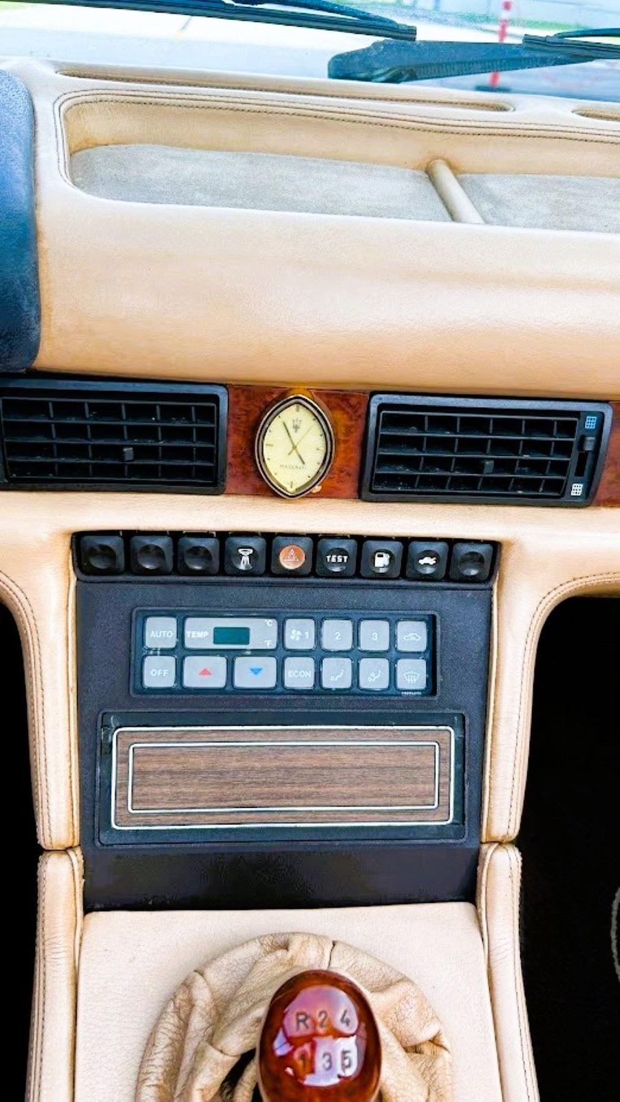 Factory Interior is really nice, the front bucket seats are upholstered in tan leather that extends to the dashboard, center console, sun visors, and door panels. Burl woodgrain trim accents the cabin, and additional appointments include air conditioning, an analog clock, and power windows. Brown four-spoke steering wheel is leather-wrapped and frames blue instrument dials including a 160-mph speedometer, a tachometer, and auxiliary gauges for boost pressure, oil pressure, water temperature, voltage, and fuel level.