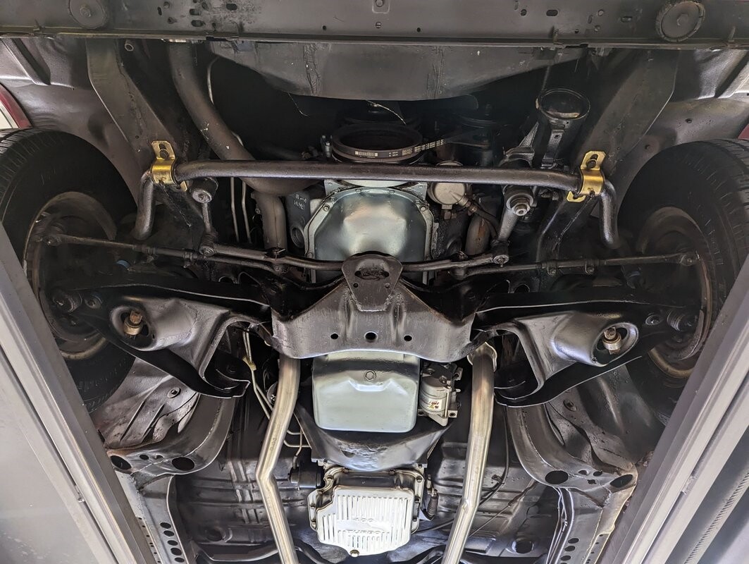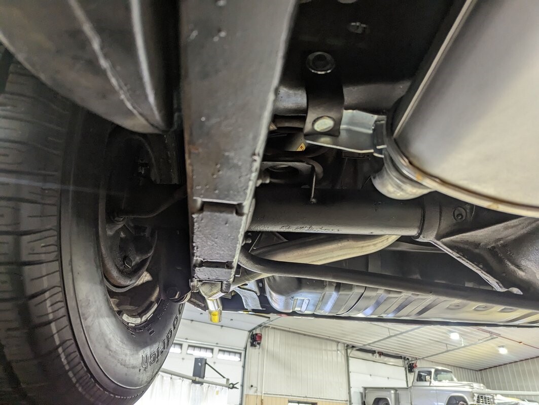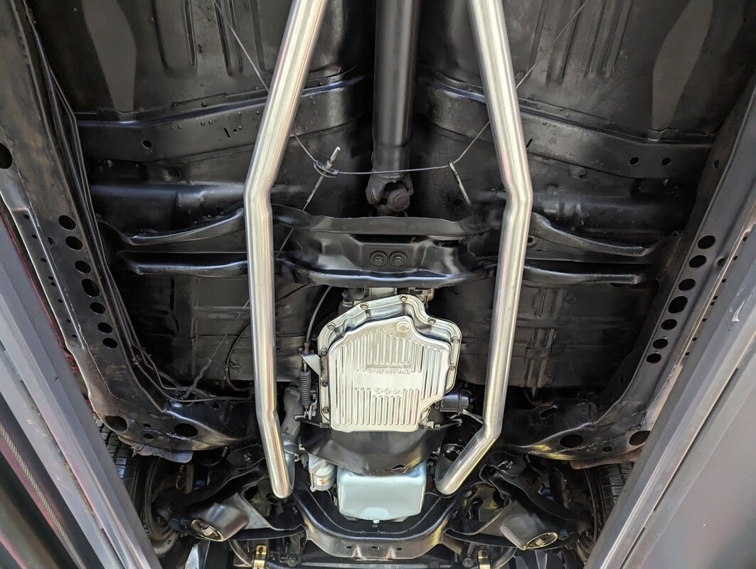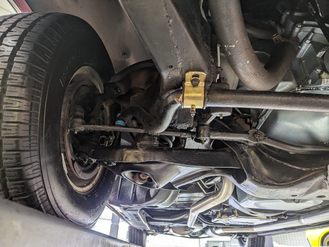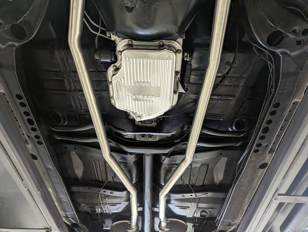 UNDERSIDE: This car has received an older restoration that's been maintained as needed since. The steering components look good and work well. It has rally suspension with front and rear sway bars. The shocks were replaced all the way around. It has four wheel power drum brakes with the lines replaced. The emergency brake is hooked up as well. It has a fresh looking full dual exhaust system with fresh mufflers and tailpipes that exit under the rear bumper. Looking up at the original numbers matching motor It has a high torque starter and everything looks freshly repainted. It's equipped with the correct Turbo 400 hydromatic transmission and still has its tag in place. That transfers power to the 12 bolt Eaton posi rear end. The floors are solid and have been neatly painted black.