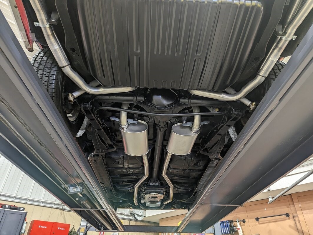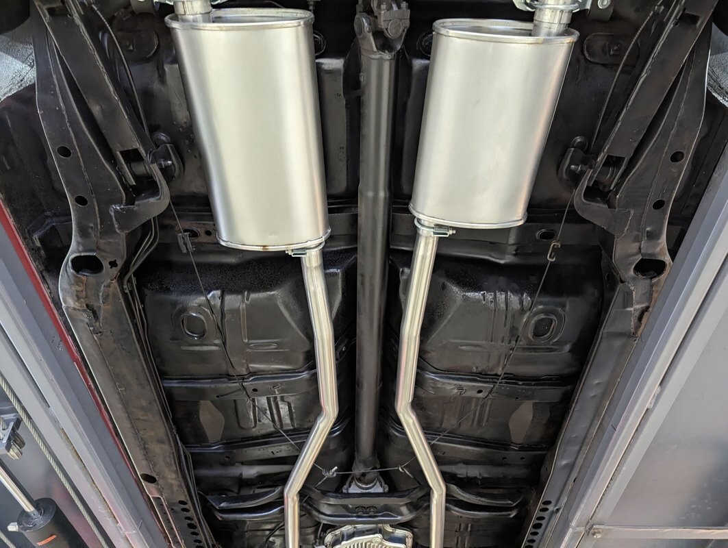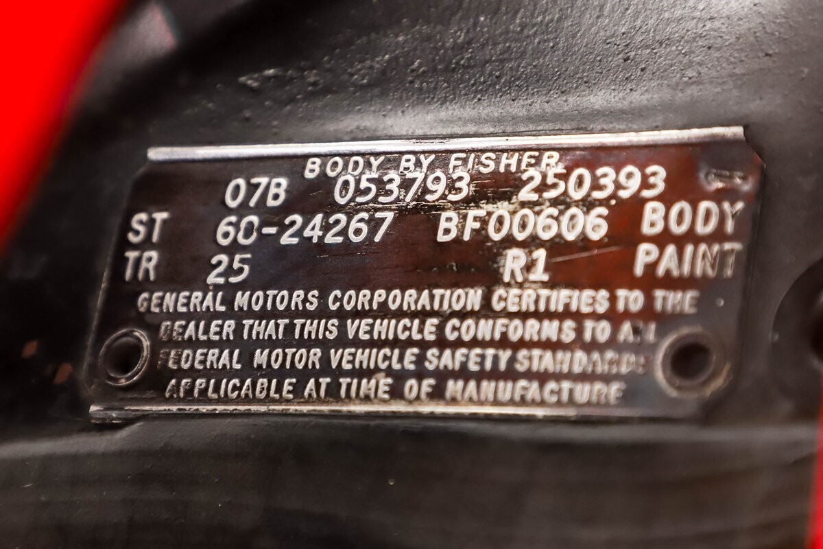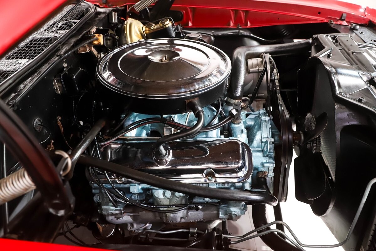 UNDERSIDE: This car has received an older restoration that's been maintained as needed since. The steering components look good and work well. It has rally suspension with front and rear sway bars. The shocks were replaced all the way around. It has four wheel power drum brakes with the lines replaced. The emergency brake is hooked up as well. It has a fresh looking full dual exhaust system with fresh mufflers and tailpipes that exit under the rear bumper. Looking up at the original numbers matching motor It has a high torque starter and everything looks freshly repainted. It's equipped with the correct Turbo 400 hydromatic transmission and still has its tag in place. That transfers power to the 12 bolt Eaton posi rear end. The floors are solid and have been neatly painted black.