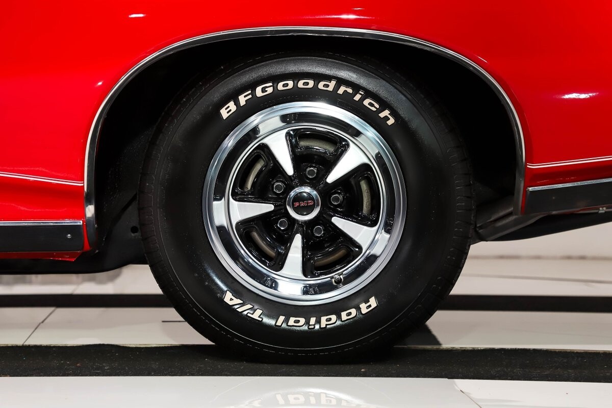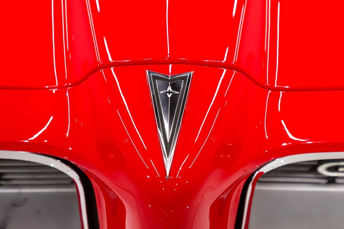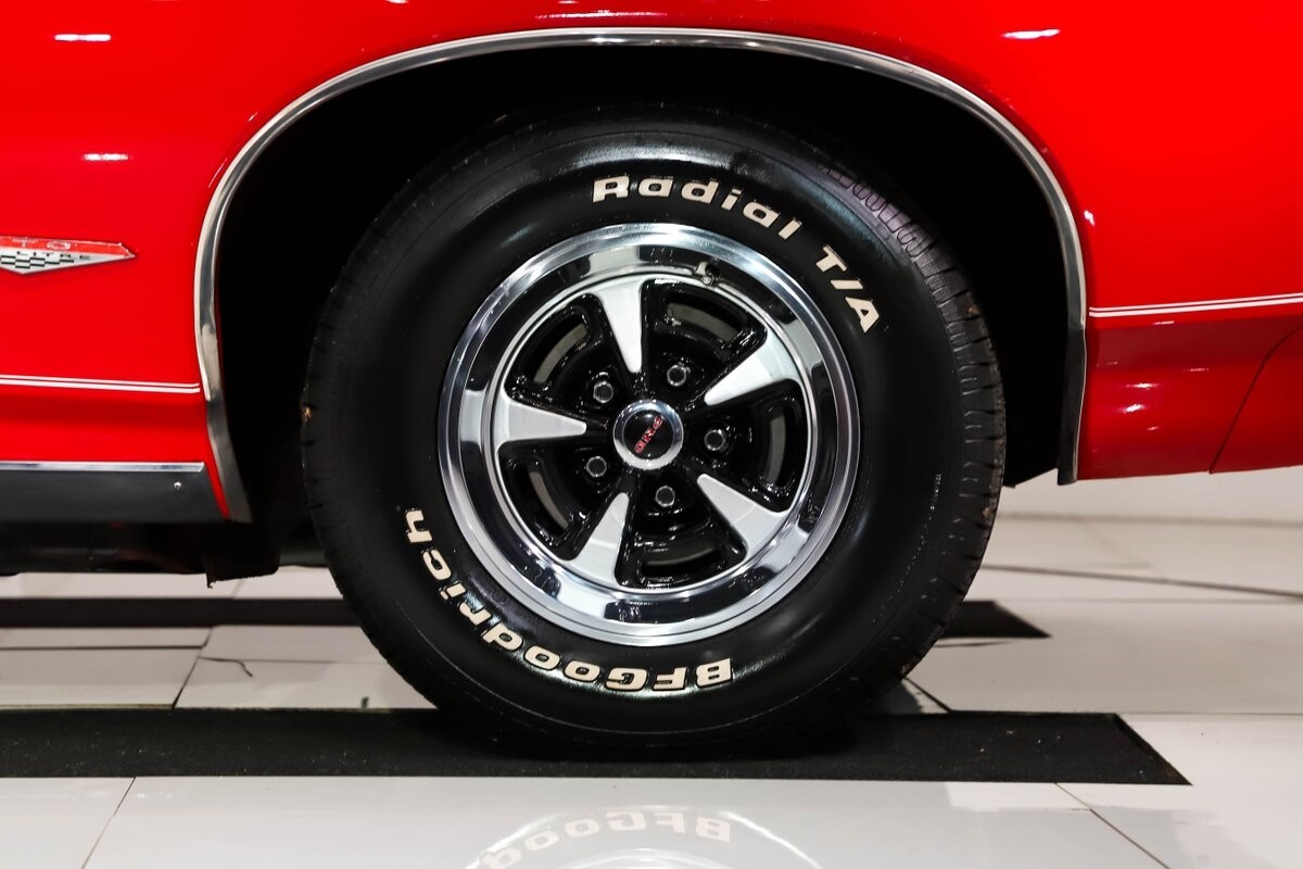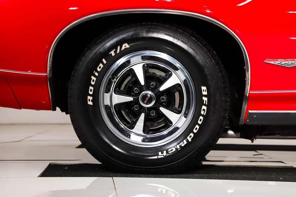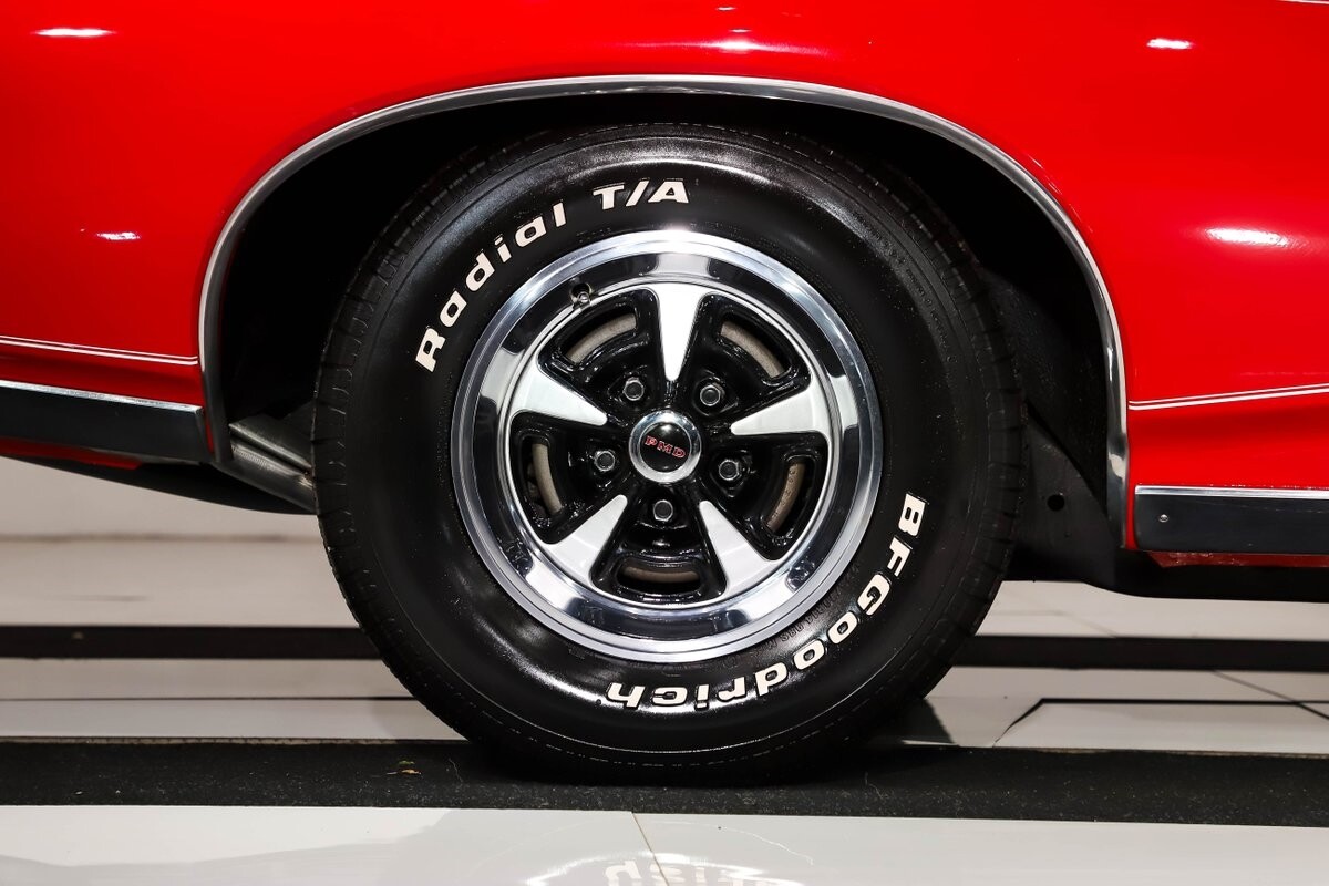 EXTERIOR: What a looker! And it's equipped with the very rare hideaway headlights from the factory! The car has been repainted its correct Solar red color on a solid body that is free of any rust. It has a very glossy and reflective finish. There are a couple imperfections and touch ups, but it still looks fantastic. It has the correct dual scoop hood that is looking sweet. The doors close like a new car. The windshield has been replaced but has original molding. All the other glass looks original. The rear bumper looks rechromed. The front grill with working hideaway headlights looks original but in great shape as well. It has a new white vinyl top with a red boot. It's sitting on Pontiac rally rims wrapped in size 225/70R14 BFGoodrich radial TA tires.
