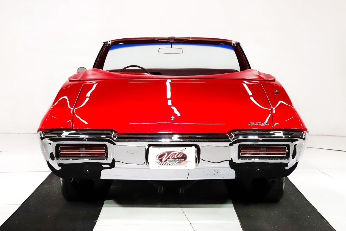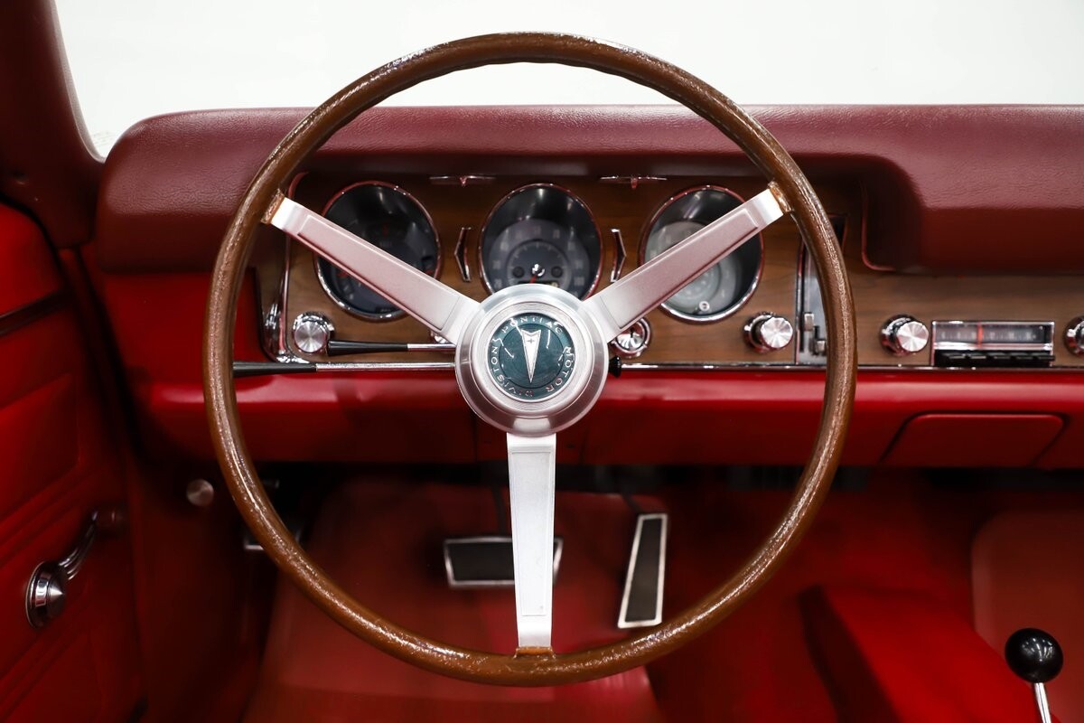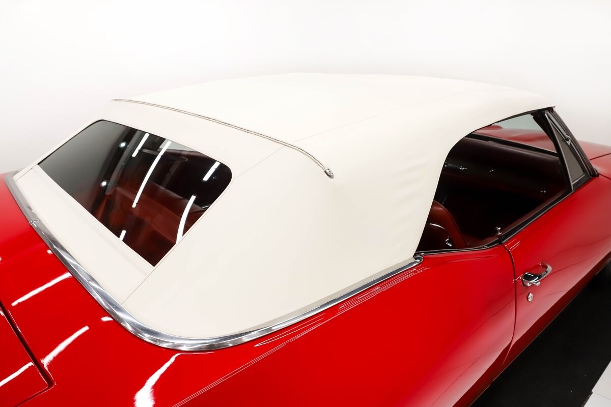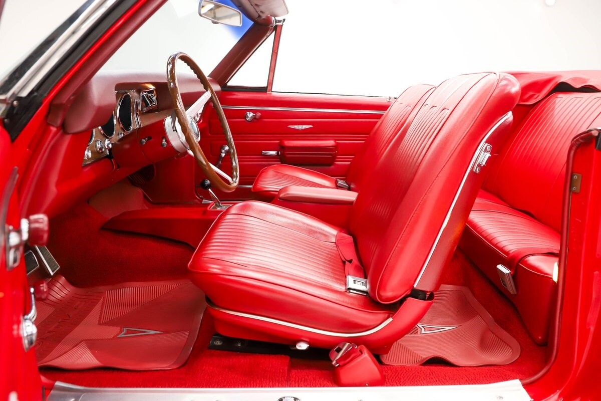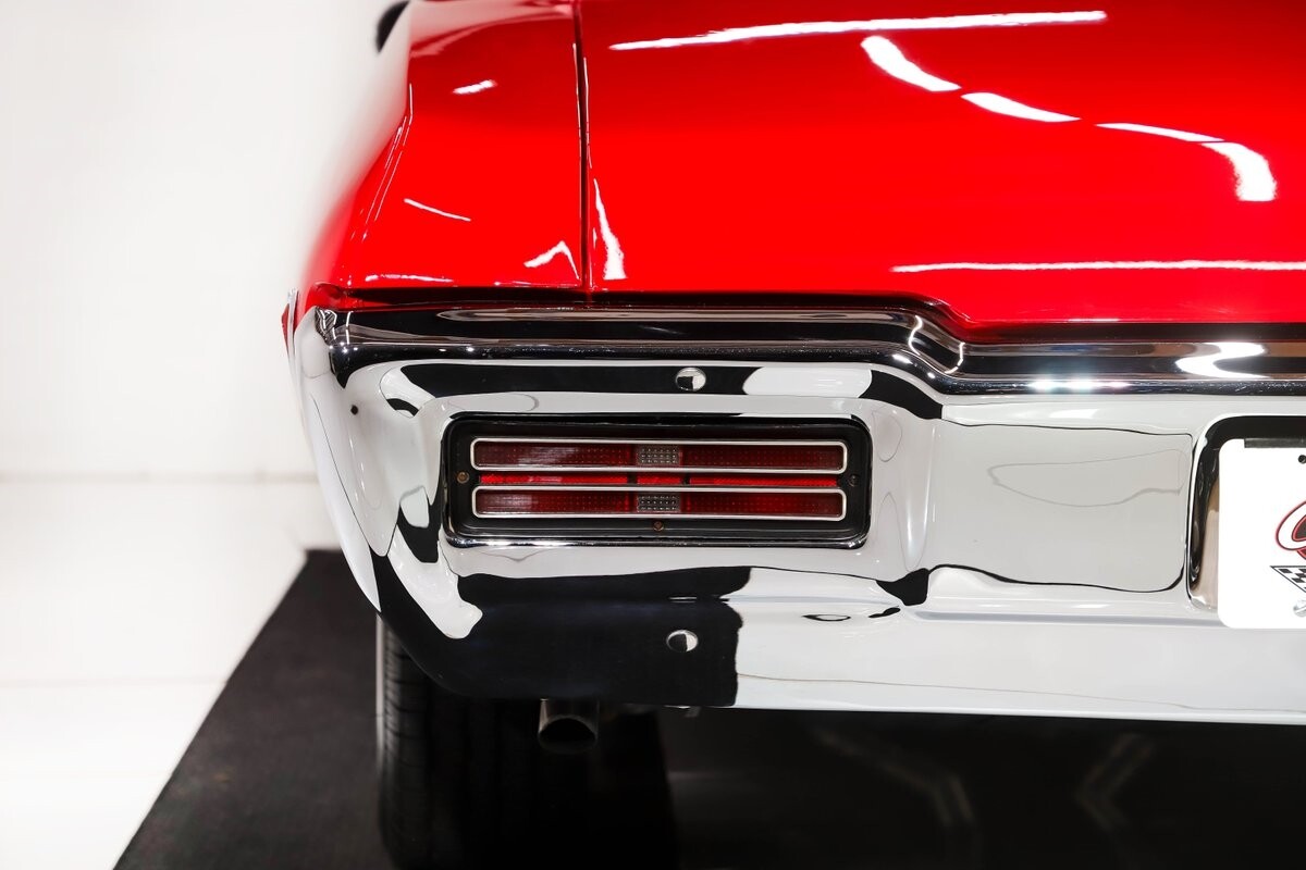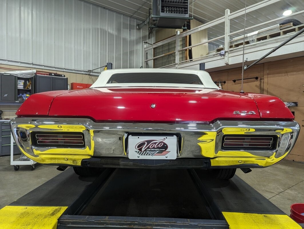 EXTERIOR: What a looker! And it's equipped with the very rare hideaway headlights from the factory! The car has been repainted its correct Solar red color on a solid body that is free of any rust. It has a very glossy and reflective finish. There are a couple imperfections and touch ups, but it still looks fantastic. It has the correct dual scoop hood that is looking sweet. The doors close like a new car. The windshield has been replaced but has original molding. All the other glass looks original. The rear bumper looks rechromed. The front grill with working hideaway headlights looks original but in great shape as well. It has a new white vinyl top with a red boot. It's sitting on Pontiac rally rims wrapped in size 225/70R14 BFGoodrich radial TA tires.
