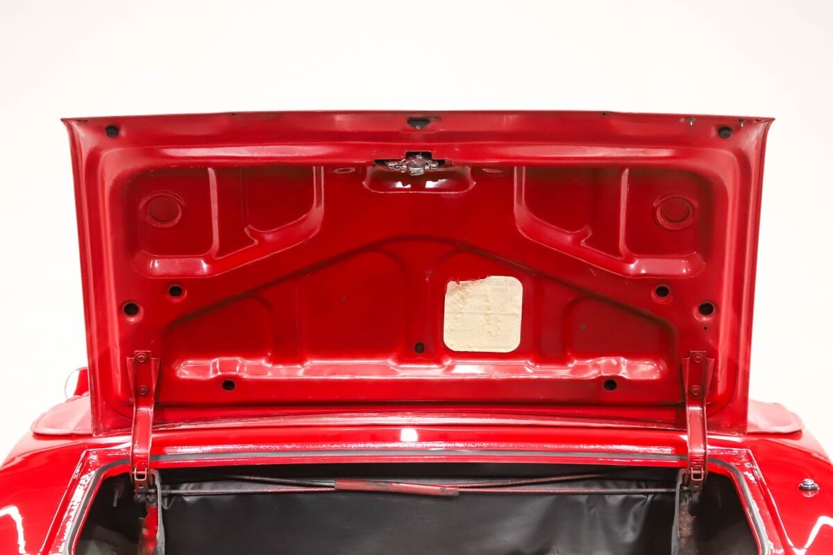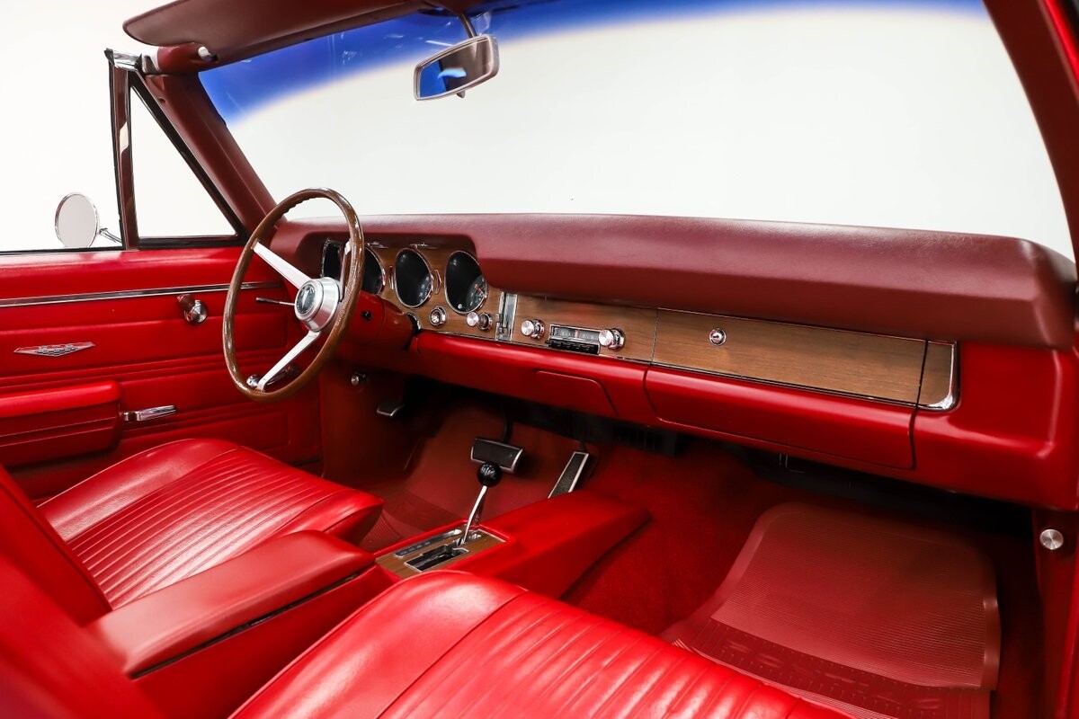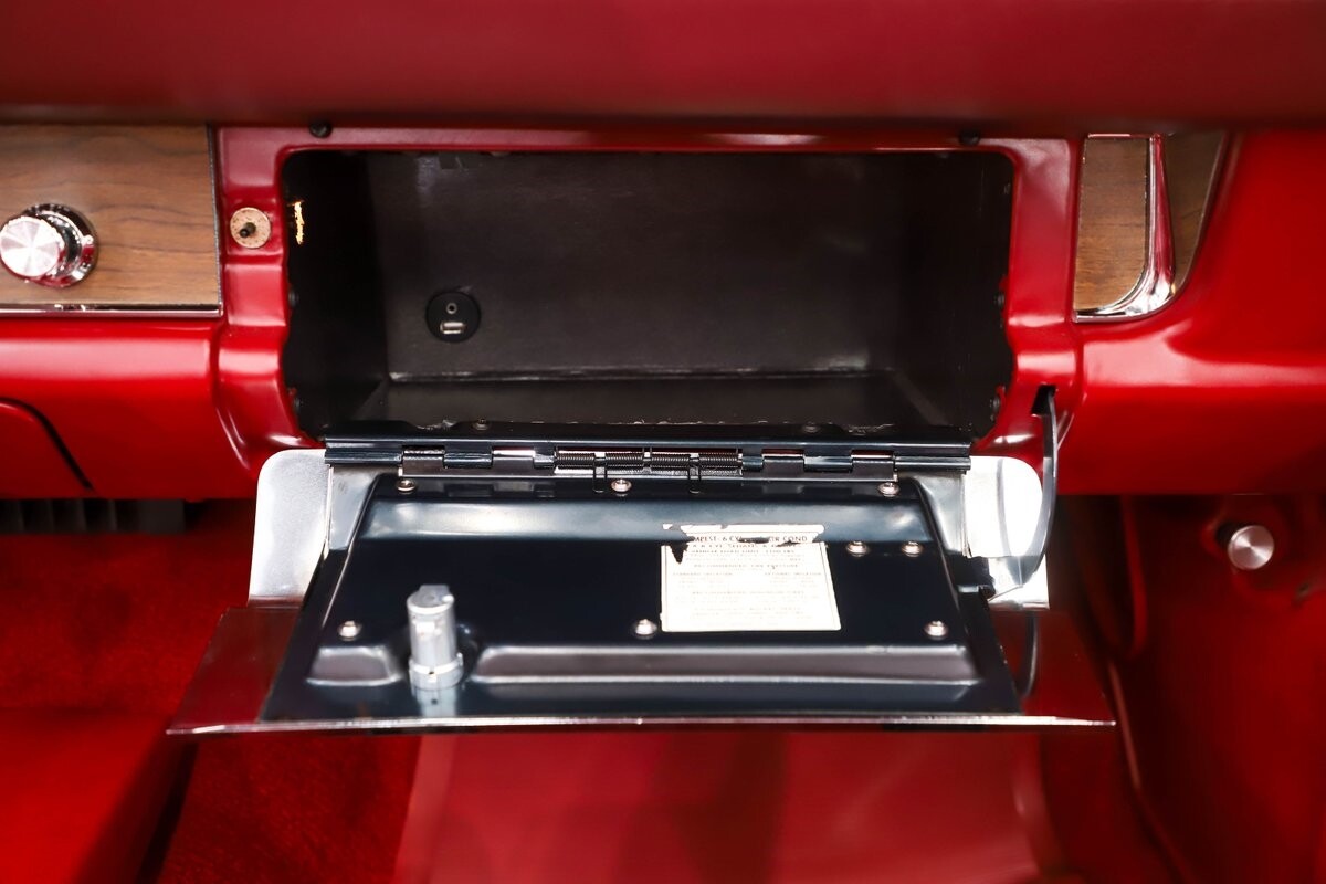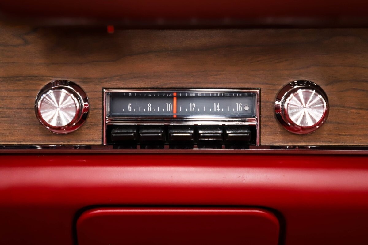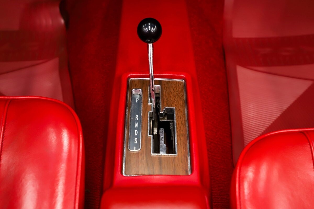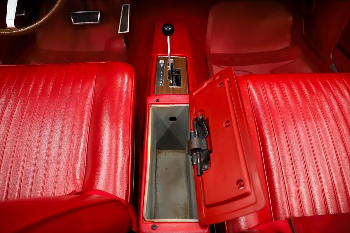 INTERIOR: Is red your favorite color? Inside the jams are painted slick just like the exterior and the door panels have been replaced. The front bucket seats have been reupholstered and look great. It has a center console and Hurst dual gate shifter that are in good shape and appear to be original. The sun visors and review mirror look original as well. All the interior lights are working including the glove box light. The dash pad has been replaced and all the gauges are original. The factory clock is working. The original radio has been professionally rebuilt and has Bluetooth capabilities with an auxiliary cable to plug in your devices that is hidden in the ashtray. The original tilt steering column and steering wheel are in great shape. The rear seat has been reupholstered to match the front. All the carpeting has been replaced and it has rubber floor mats.