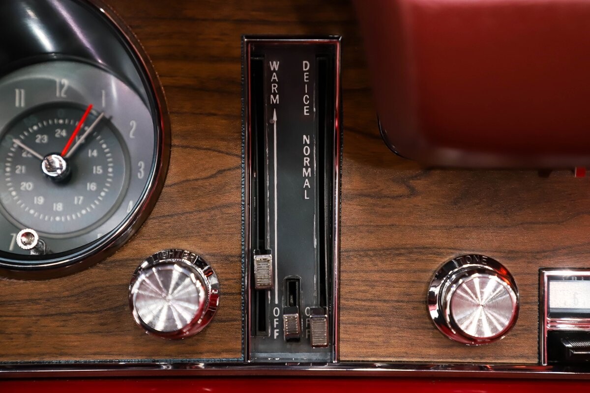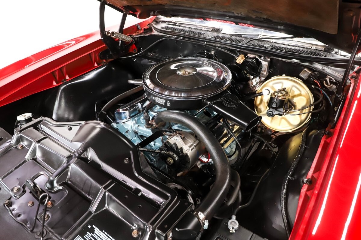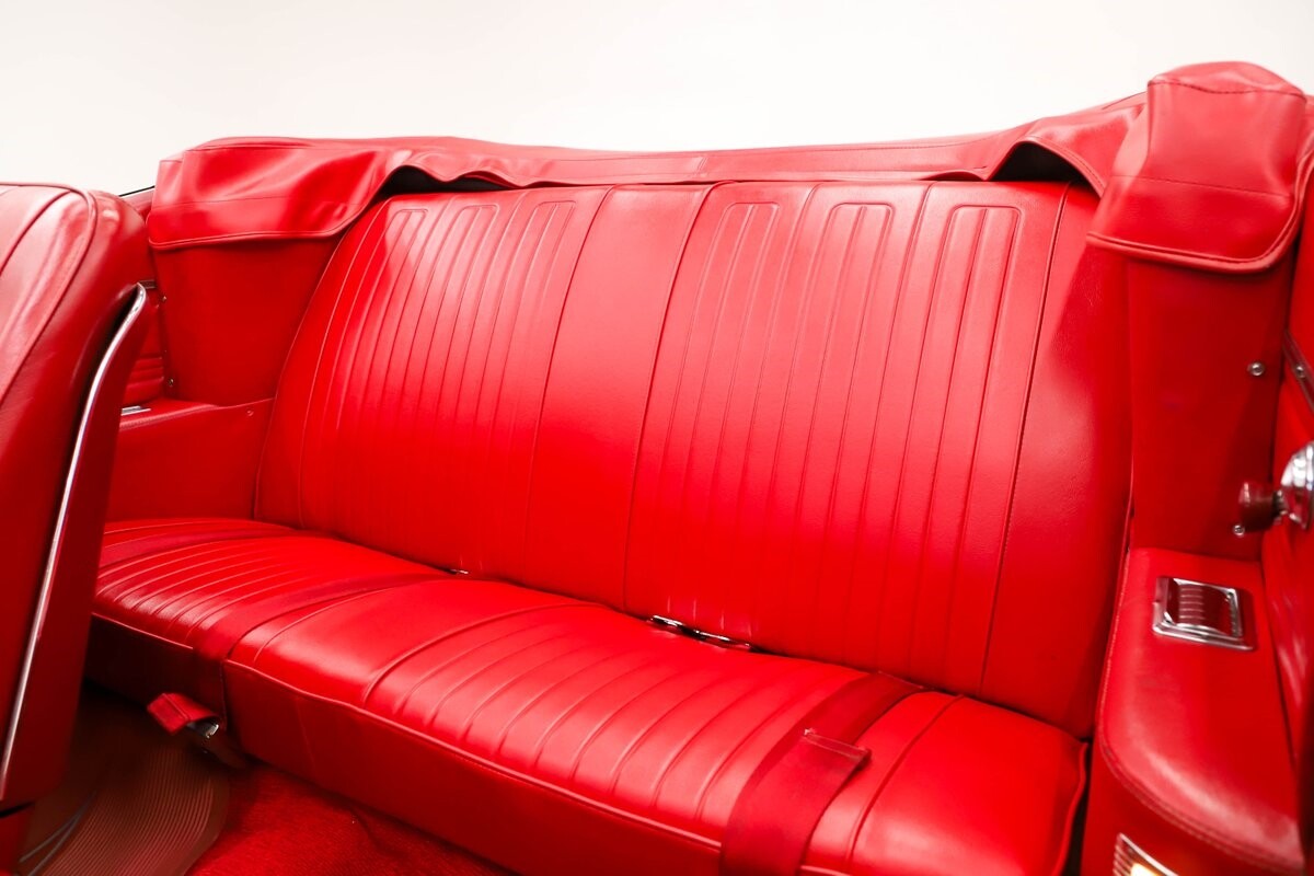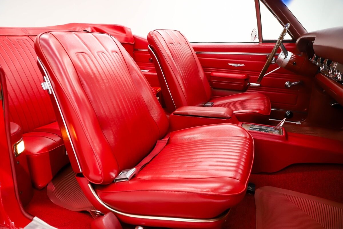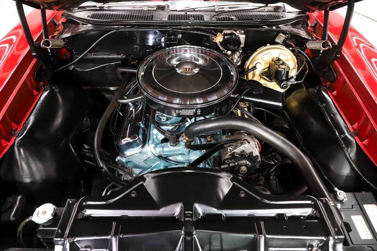 INTERIOR: Is red your favorite color? Inside the jams are painted slick just like the exterior and the door panels have been replaced. The front bucket seats have been reupholstered and look great. It has a center console and Hurst dual gate shifter that are in good shape and appear to be original. The sun visors and review mirror look original as well. All the interior lights are working including the glove box light. The dash pad has been replaced and all the gauges are original. The factory clock is working. The original radio has been professionally rebuilt and has Bluetooth capabilities with an auxiliary cable to plug in your devices that is hidden in the ashtray. The original tilt steering column and steering wheel are in great shape. The rear seat has been reupholstered to match the front. All the carpeting has been replaced and it has rubber floor mats.