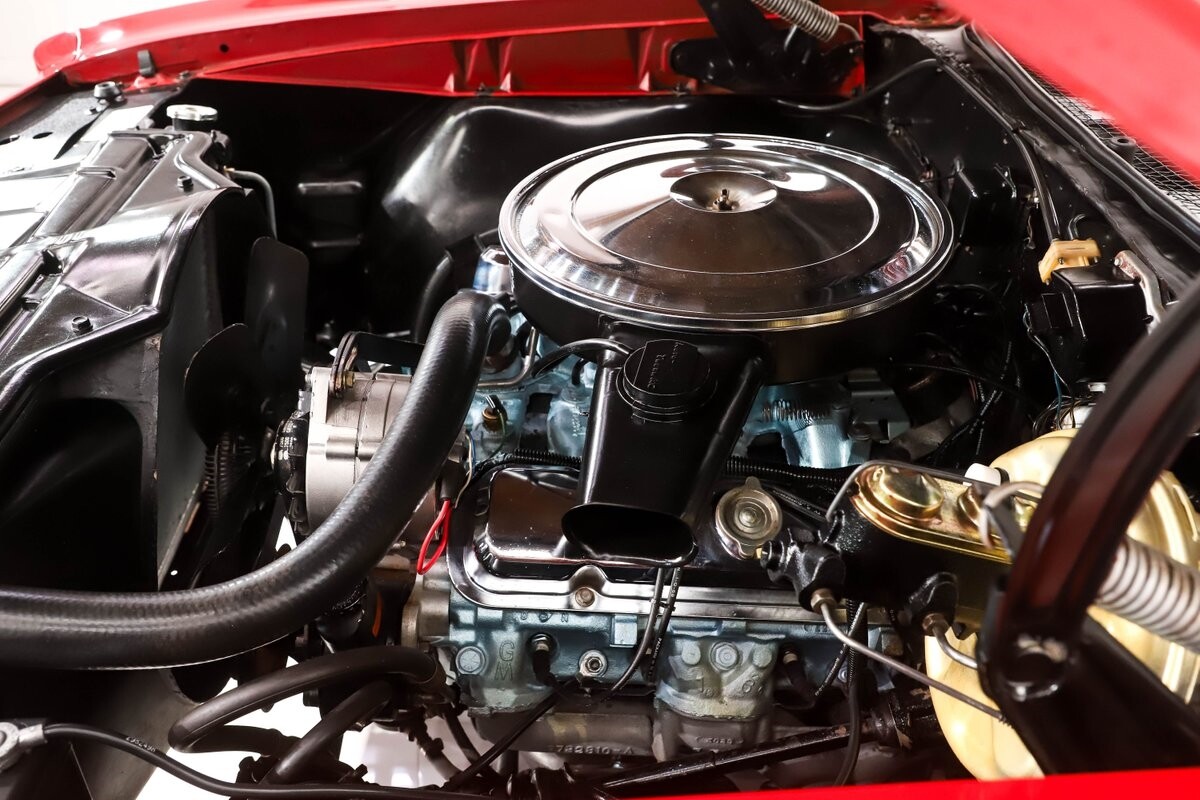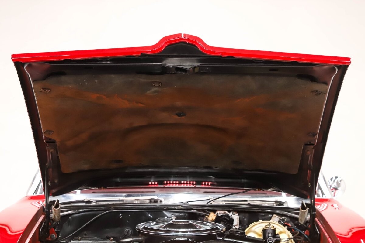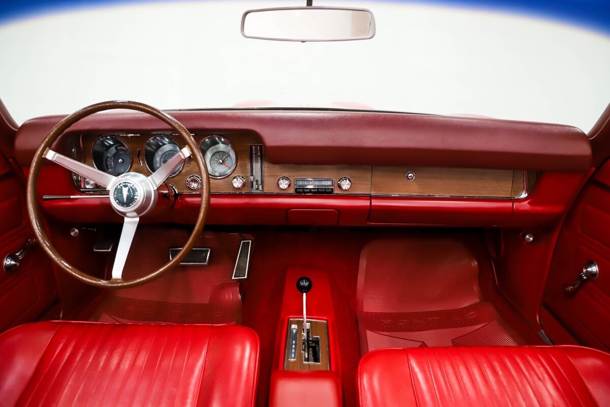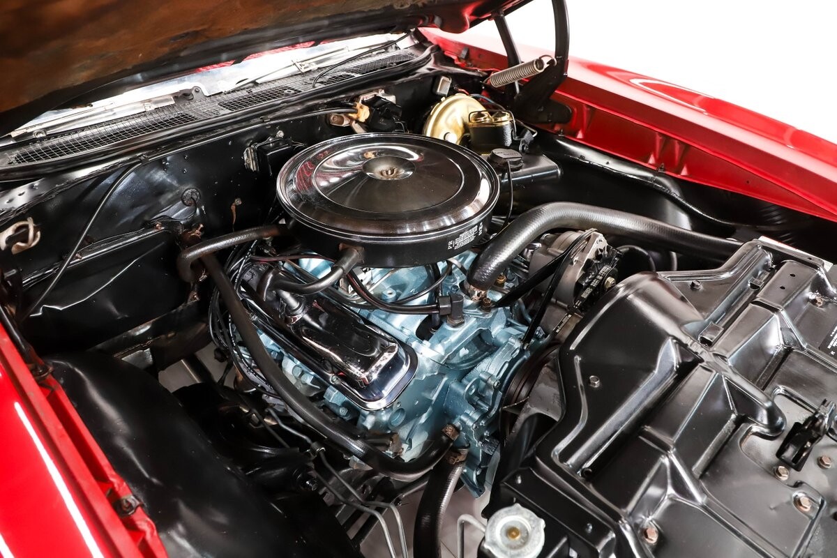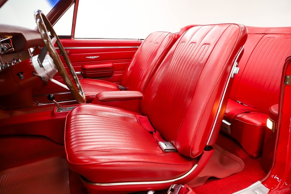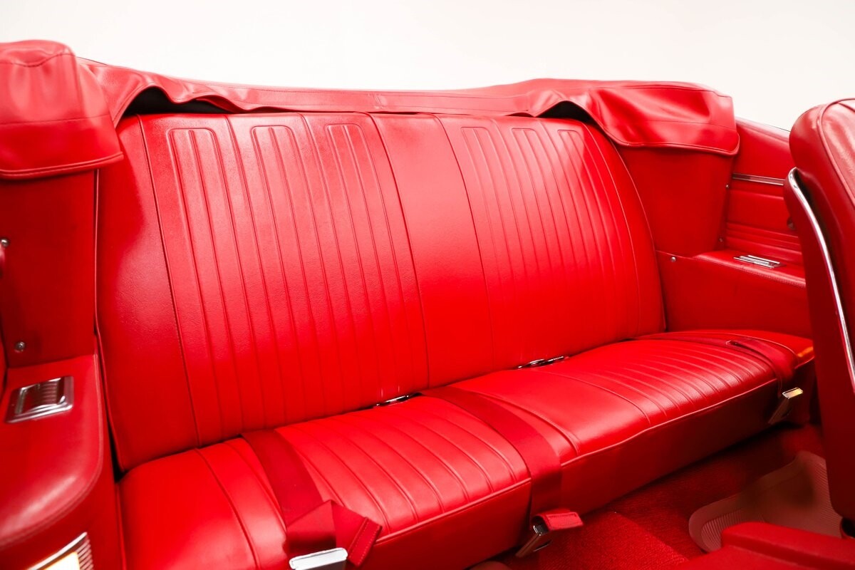 INTERIOR: Is red your favorite color? Inside the jams are painted slick just like the exterior and the door panels have been replaced. The front bucket seats have been reupholstered and look great. It has a center console and Hurst dual gate shifter that are in good shape and appear to be original. The sun visors and review mirror look original as well. All the interior lights are working including the glove box light. The dash pad has been replaced and all the gauges are original. The factory clock is working. The original radio has been professionally rebuilt and has Bluetooth capabilities with an auxiliary cable to plug in your devices that is hidden in the ashtray. The original tilt steering column and steering wheel are in great shape. The rear seat has been reupholstered to match the front. All the carpeting has been replaced and it has rubber floor mats.