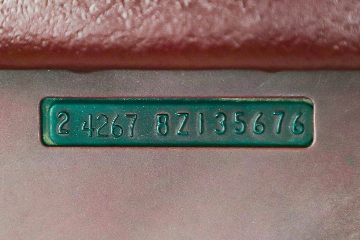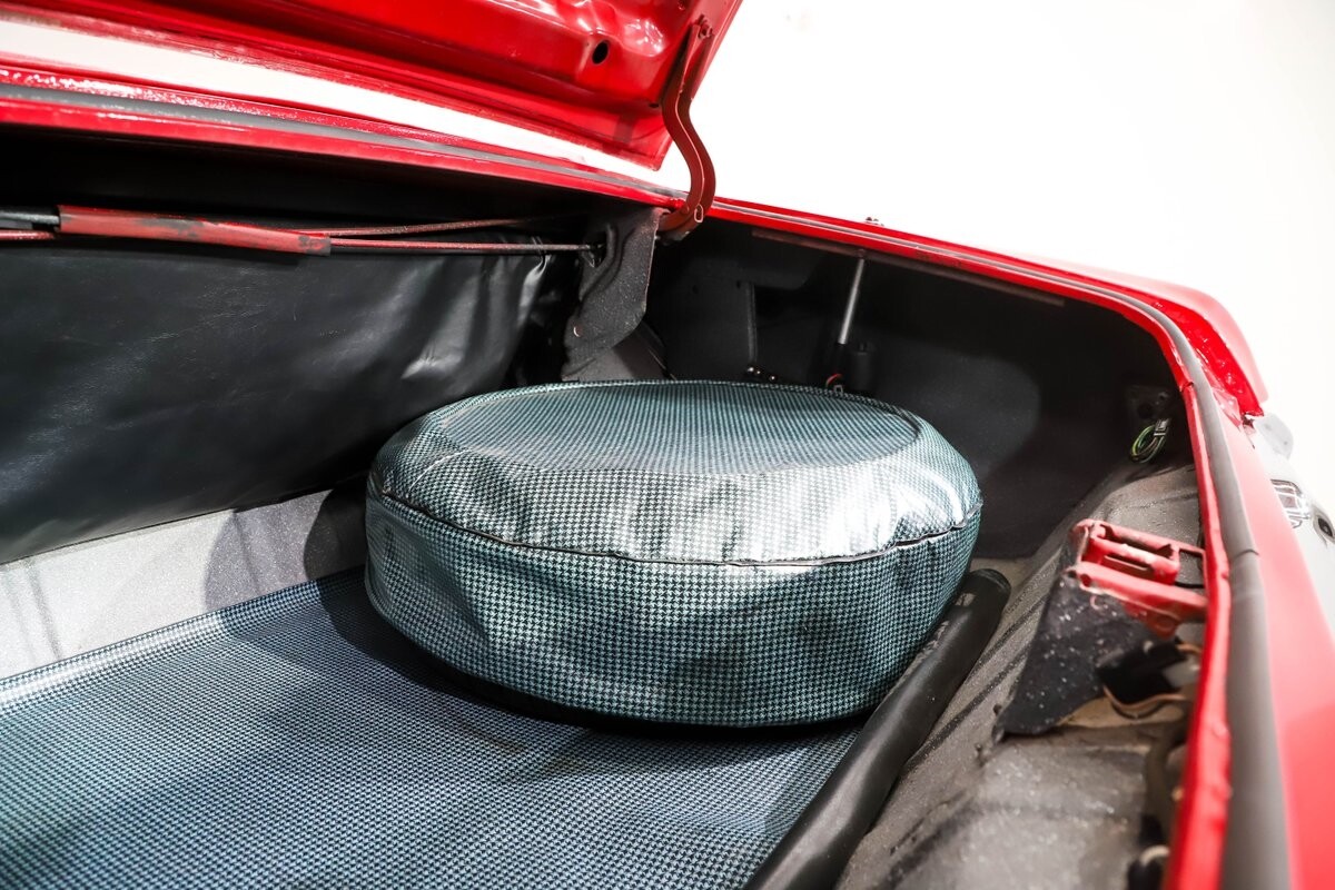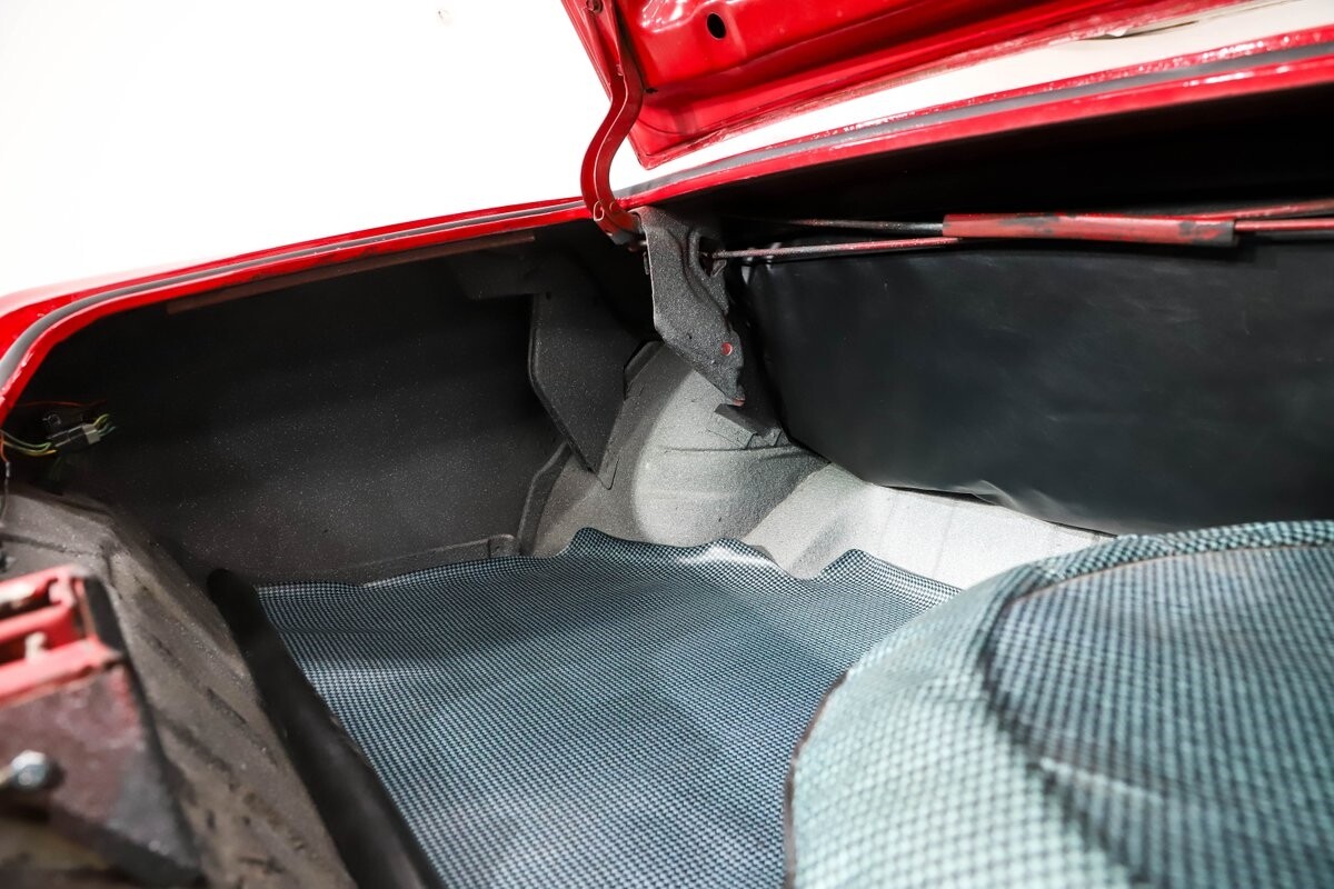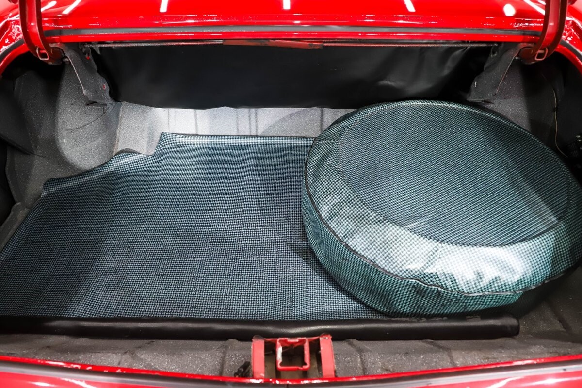 TRUNK COMPARTMENT: Under the trunk lid and has original paint with its original sticker. The trunk jamb has been repainted slick just like the body. It has solid trunk floor pan metal with neatly applied spatter finish paint. It also has a power antenna. Included is a full size spare tire on a rally rim with a vinyl. And a rubberized mat for the trunk floor too.