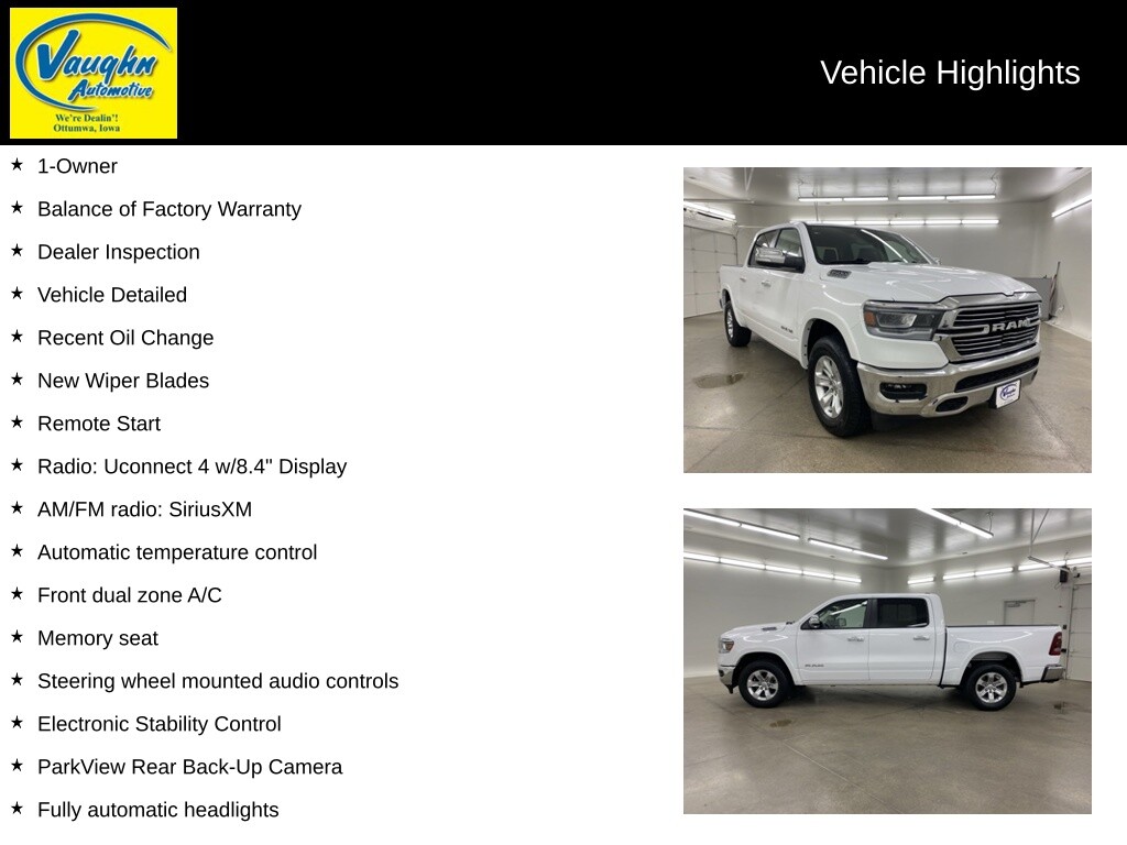 1-Owner, Balance of Factory Warranty, Dealer Inspection, Vehicle Detailed, Recent Oil Change, New Wiper Blades, Remote Start, 8-Speed Automatic, 4WD, Black w/Leather Trim 40/20/40 Bench Seat or Leather Trimmed Bucket Seats, AM/FM radio: SiriusXM, Apple CarPlay/Android Auto, Automatic temperature control, Electronic Stability Control, Front dual zone A/C, Fully automatic headlights, Garage door transmitter, Heated Front Seats, Heated steering wheel, Memory seat, ParkView Rear Back-Up Camera, Radio: Uconnect 4 w/8.4 Display, Steering wheel mounted audio controls, Ventilated front seats. HEMI 5.7L V8 Multi Displacement VVT Bright White Clearcoat 2021 Ram 1500 Laramie Priced below KBB Fair Purchase Price! Odometer is 13561 miles below market average!