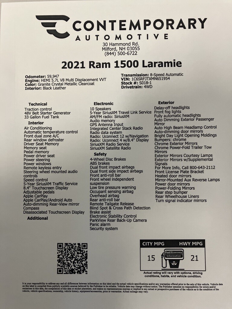 Recent Arrival! CONTEMPORARY CHRYSLER DODGE JEEP RAM is proud to present you with another True Market Priced Pre-Owned Vehicle. This 2021 Ram 1500 Laramie is loaded with the following Factory Options:25H Laramie, 3.92 Rear Axle Ratio, Trailer Brake Control, Chrome Appearance Group (Bright Day Light Opening Moldings, Chrome Tow Hooks, and Wheel to Wheel Side Steps), Laramie Level 1 Equipment Group (DISC) (Auto Dimming Exterior Passenger Mirror, Auto High Beam Headlamp Control, Blind Spot & Cross Path Detection, ParkSense Front/Rear Park Assist w/Stop, Rain Sensitive Windshield Wipers, Rear 60/40 Folding Split Recline Seat, Remote Tailgate Release, and Tailgate Ajar Warning Lamp), , and Wheels: 20 x 9 Premium Paint/Polished Chrome Appearance Group (Bright Day Light Opening Moldings, Chrome Tow Hooks, and Wheel to Wheel Side Steps), Laramie Level 1 Equipment Group (DISC) (Auto Dimming Exterior Passenger Mirror, Auto High Beam Headlamp Control, Blind Spot & Cross Path Detection, ParkSense Front/Rear Park Assist w/Stop, Rain Sensitive Windshield Wipers, Rear 60/40 Folding Split Recline Seat, Remote Tailgate Release, and Tailgate Ajar Warning Lamp), Quick Order Package 25H Laramie, 3.92 Rear Axle Ratio, Trailer Brake Control, Wheels: 20 x 9 Premium Paint/Polished, 10 Speakers, 3 Rear Seat Head Restraints, 33 Gallon Fuel Tank, 4 Way Front Headrests, 48V Belt Starter Generator, 4-Wheel Disc Brakes, 5-Year SiriusXM Traffic Service, 5-Year SiriusXM Travel Link Service, 8.4 Touchscreen Display, ABS brakes, Adjustable pedals, Air Conditioning, AM/FM radio: SiriusXM, Anti-Spin Differential Rear Axle, Apple CarPlay, Apple CarPlay/Android Auto, Audio memory, Auto-dimming door mirrors, Auto-dimming Rear-View mirror, Automatic temperature control, Brake assist, Bumpers: chrome, Chrome Exterior Mirrors, Chrome Power-Fold Trailer Tow Mirrors, Compass, Delay-off headlights, Disassociated Touchscreen Display, Driver door bin, Driver Seat Memory, Driver vanity mirror, Dual front impact airbags, Dual front side impact airbags, Electronic Stability Control, Exterior Mirrors Courtesy Lamps, Exterior Mirrors w/Supplemental Signals, For Details, Visit  , For More Info, Call855-825-3354, Front anti-roll bar, Front Center Armrest w/Storage, Front dual zone A/C, Front fog lights, Front License Plate Bracket, Front reading lights, Front Seat Back Map Pockets, Front wheel independent suspension, Fully automatic headlights, Garage door transmitter, Google Android Auto, GPS Antenna Input, Heated door mirrors, Heated Front Seats, Heated front seats, Heated Steering Wheel, Heated steering wheel, Illuminated entry, Integrated Center Stack Radio, Integrated Voice Command w/Bluetooth, Leather steering wheel, Leather Trim 40/20/40 Bench Seat, Low tire pressure warning, Memory seat, Mirror-Mounted Aux Reverse Lamps, MOPAR Front & Rear Rubber Floor Mats, Occupant sensing airbag, Outside temperature display, Overhead airbag, Overhead console, Panic alarm, ParkView Rear Back-Up Camera, Passenger door bin, Passenger vanity mirror, Pedal memory, Power 4-Way Driver Lumbar Adjust, Power 4-Way Passenger Lumbar Adjust, Power 8-Way Driver & Passenger Seats, Power door mirrors, Power driver seat, Power passenger seat, Power steering, Power windows, Power-Folding Mirrors, Radio data system, Radio: Uconnect 12 w/Navigation, Radio: Uconnect 4 w/8.4 Display, Rear anti-roll bar, Rear seat center armrest, Rear step bumper, Rear Wheelhouse Liners, Rear window defroster, Remote keyless entry, Security system, SiriusXM Radio Service, SiriusXM Satellite Radio, SiriusXM Travel Link, Speed control, Split folding rear seat, Steering wheel mounted audio controls, Tachometer, Telescoping steering wheel, Tilt steering wheel, Traction control, Trip computer, Turn signal indicator mirrors, Variably intermittent wipers, Ventilated Front Seats, Ventilated front seats, and Voltmeter!!