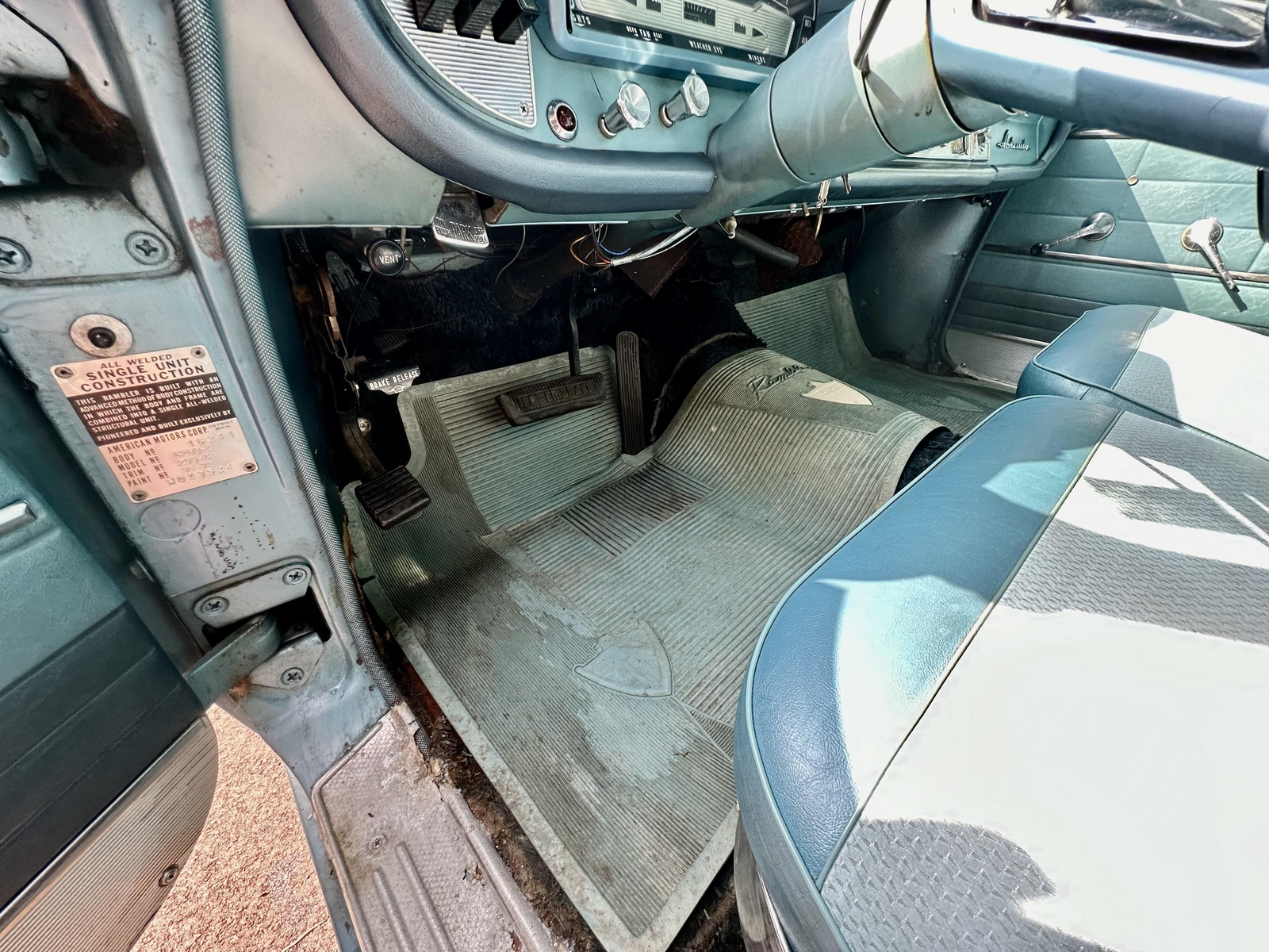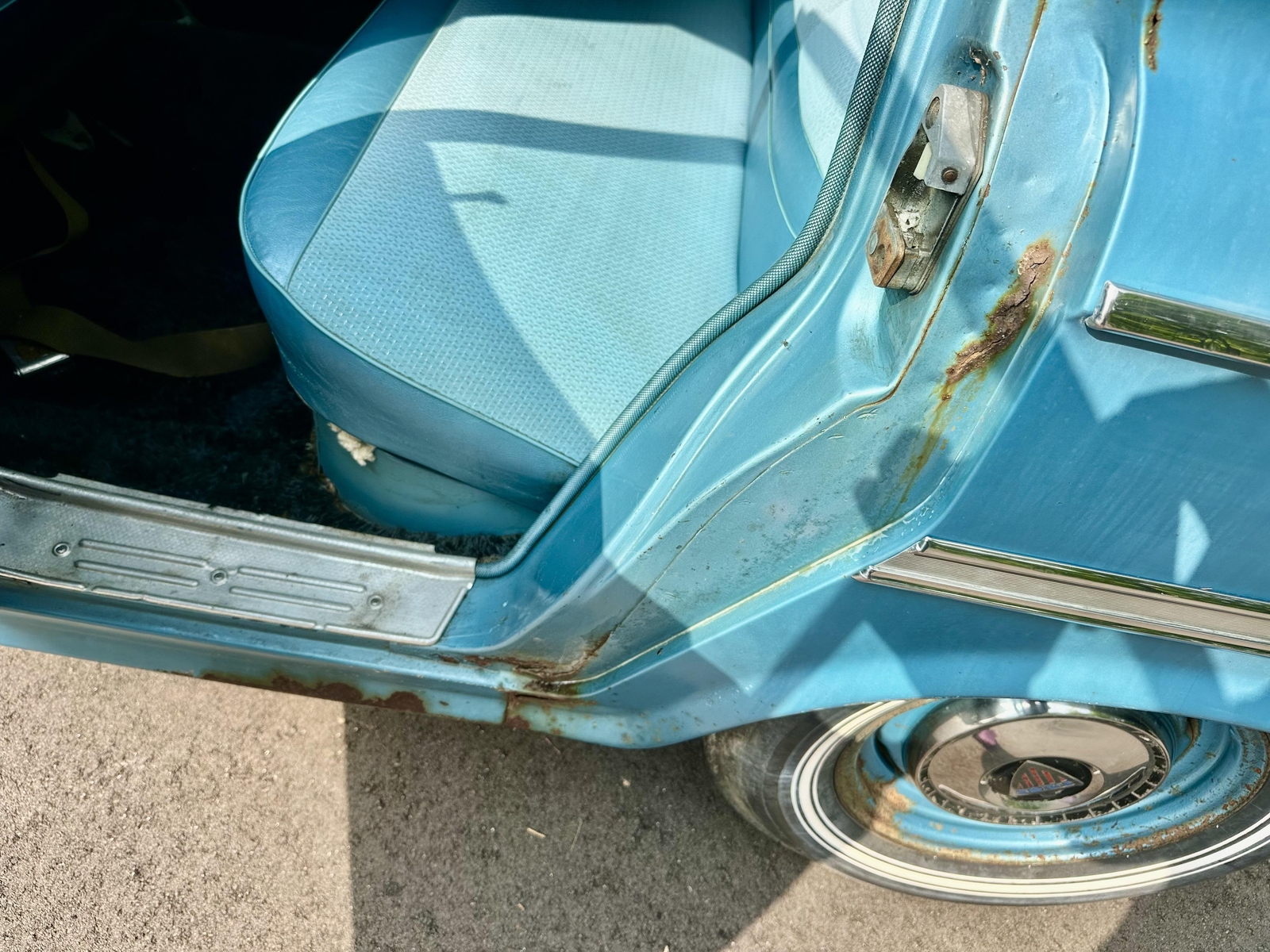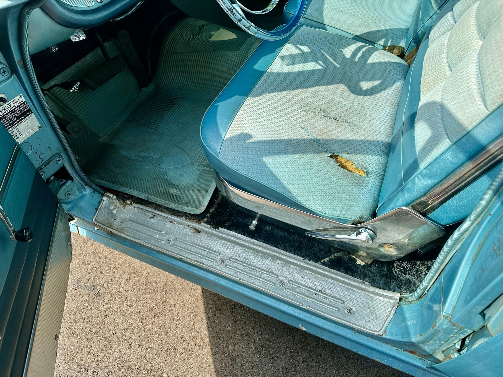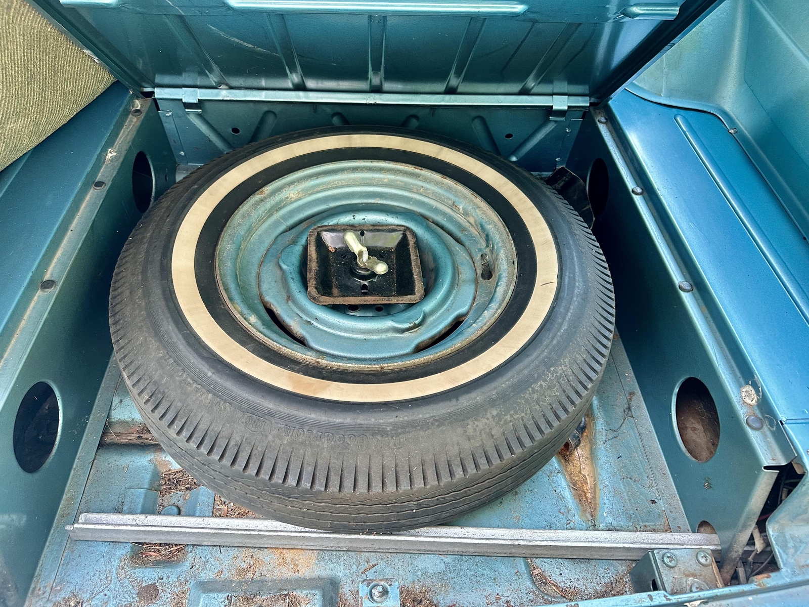 The original Blue Cloth Interior is well-preserved and full of potential. The dash, gauges, switches, and lenses are all in excellent condition. Seatbelts are intact, and the seats are fully functional. The headliner is in great shape throughout. The back seat appears unused, and the rear area is clean with a dry spare tire bay. Although the original shag carpet has been cleaned, it needs replacement. Factory floor mats are included, and all switches, including the wipers, lights, and horn, function properly.