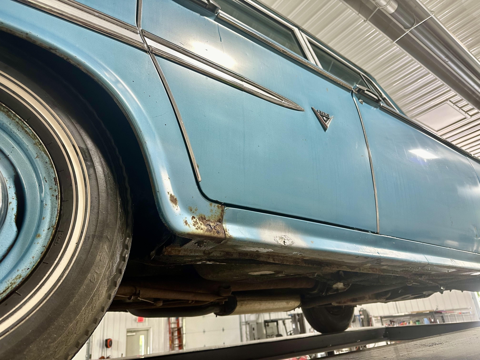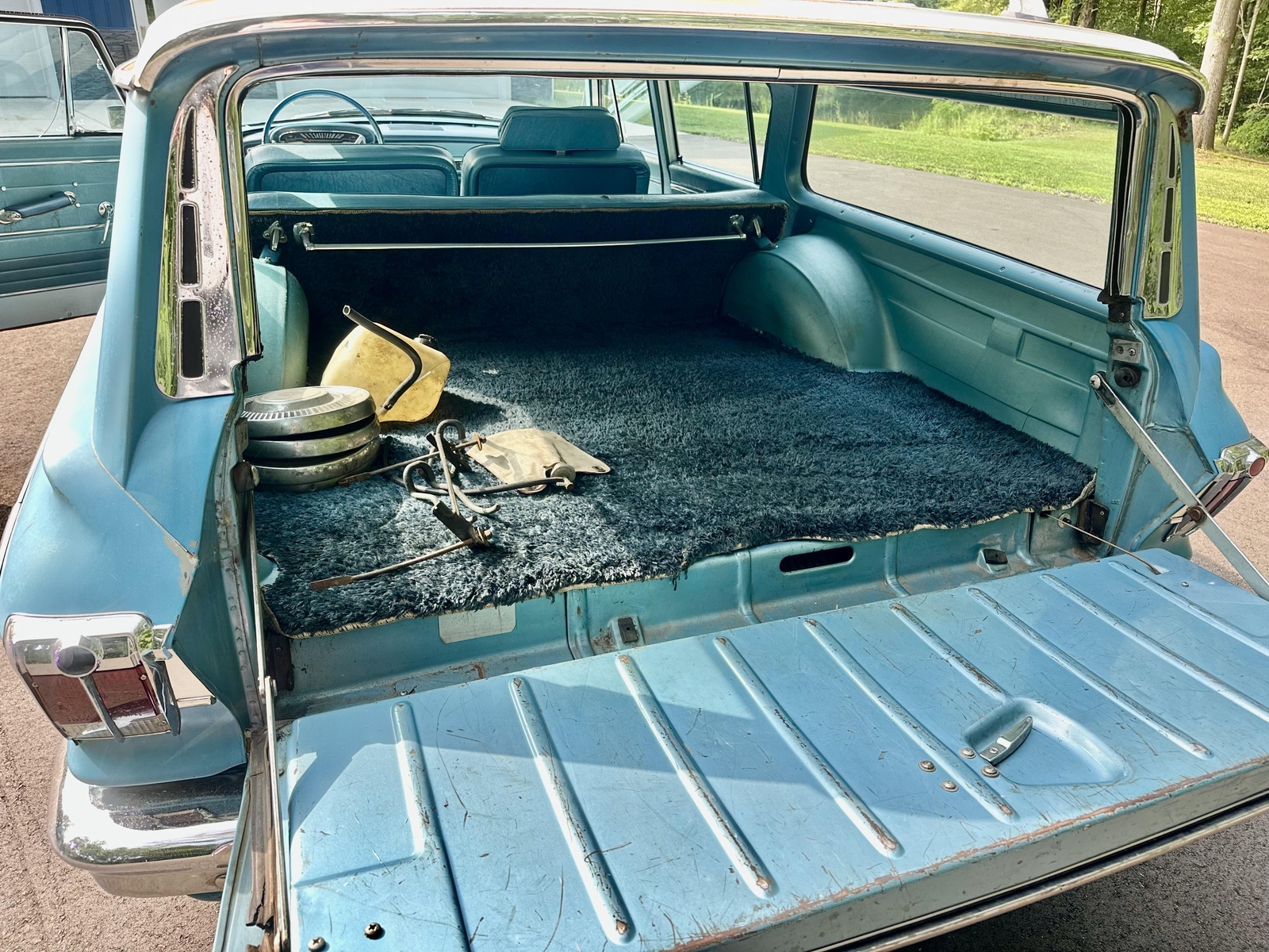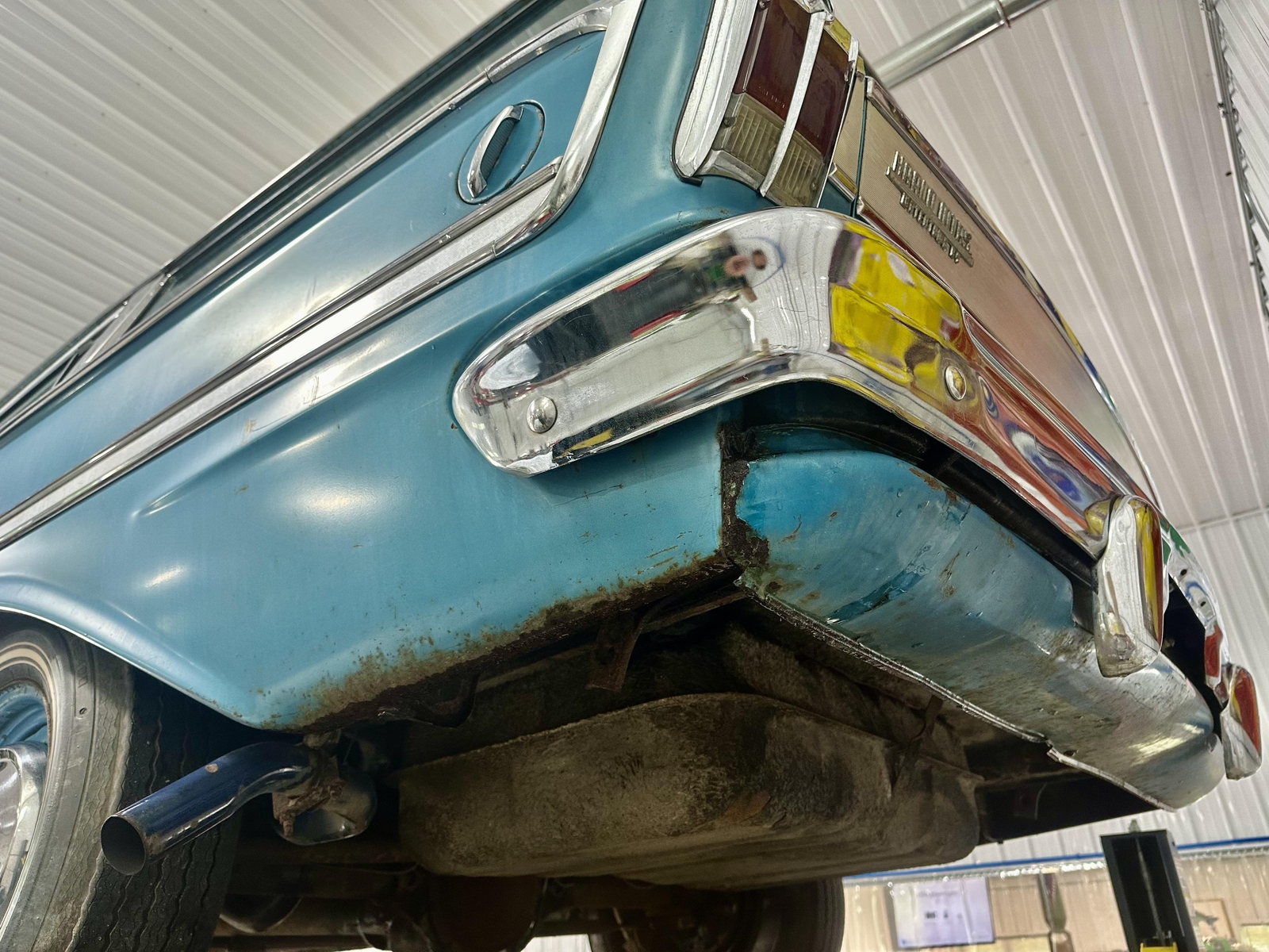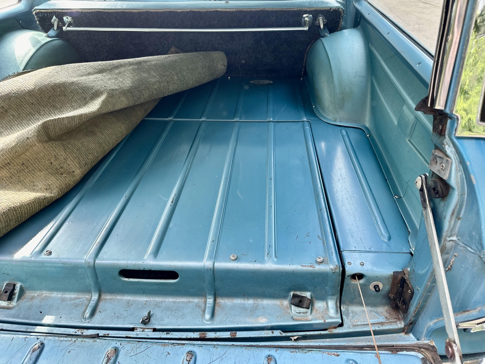 This wagon's body is straight with no signs of prior damage, featuring its original Baron Blue Metallic paint, which, although faded, retains its authenticity. All trim, hardware, and chrome are present and in good condition. The glass is clear and intact. While there are minor rust spots, the car is an excellent candidate for restoration or can be enjoyed as a cruiser in its current state.