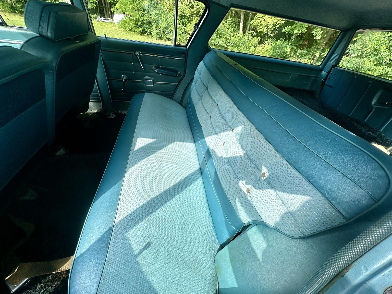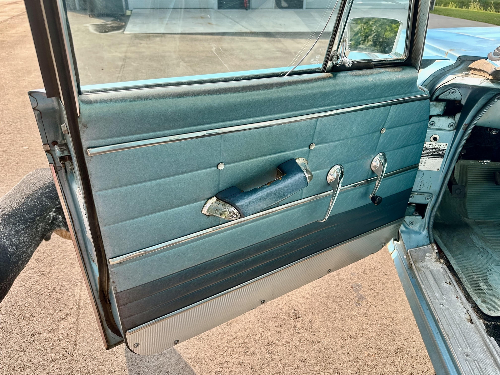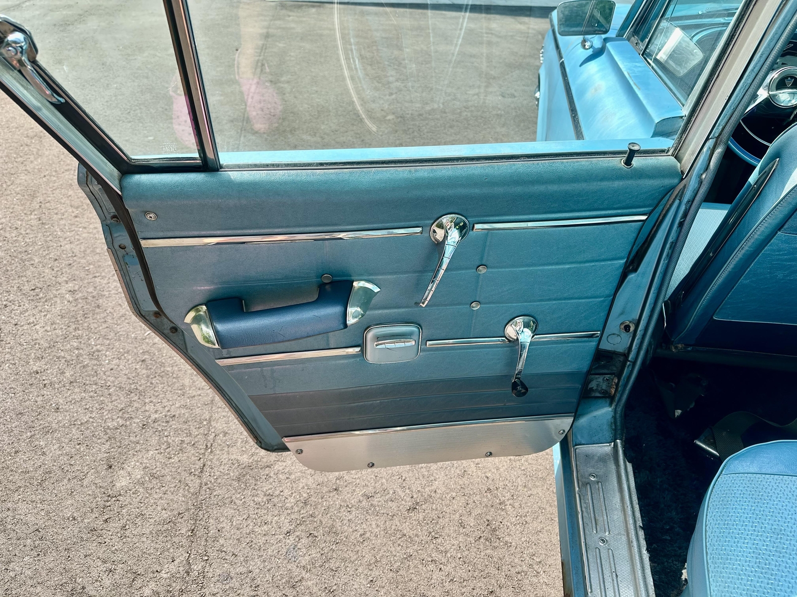 This wagon's body is straight with no signs of prior damage, featuring its original Baron Blue Metallic paint, which, although faded, retains its authenticity. All trim, hardware, and chrome are present and in good condition. The glass is clear and intact. While there are minor rust spots, the car is an excellent candidate for restoration or can be enjoyed as a cruiser in its current state.