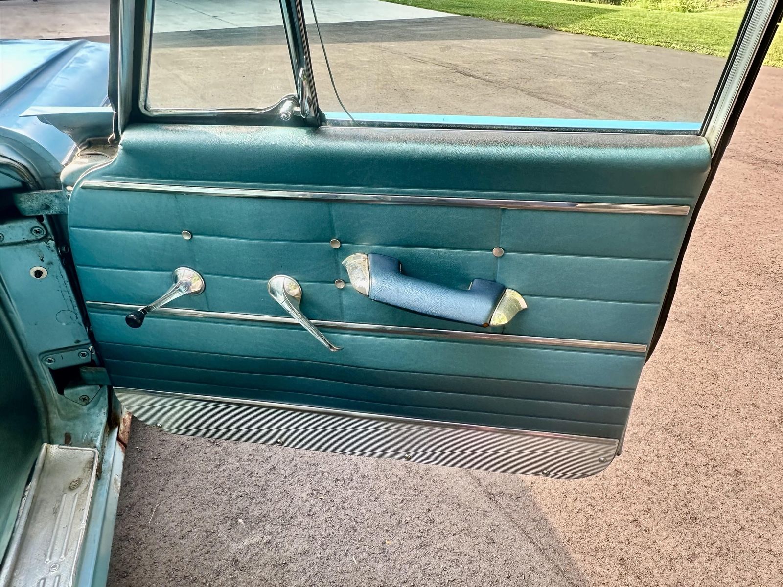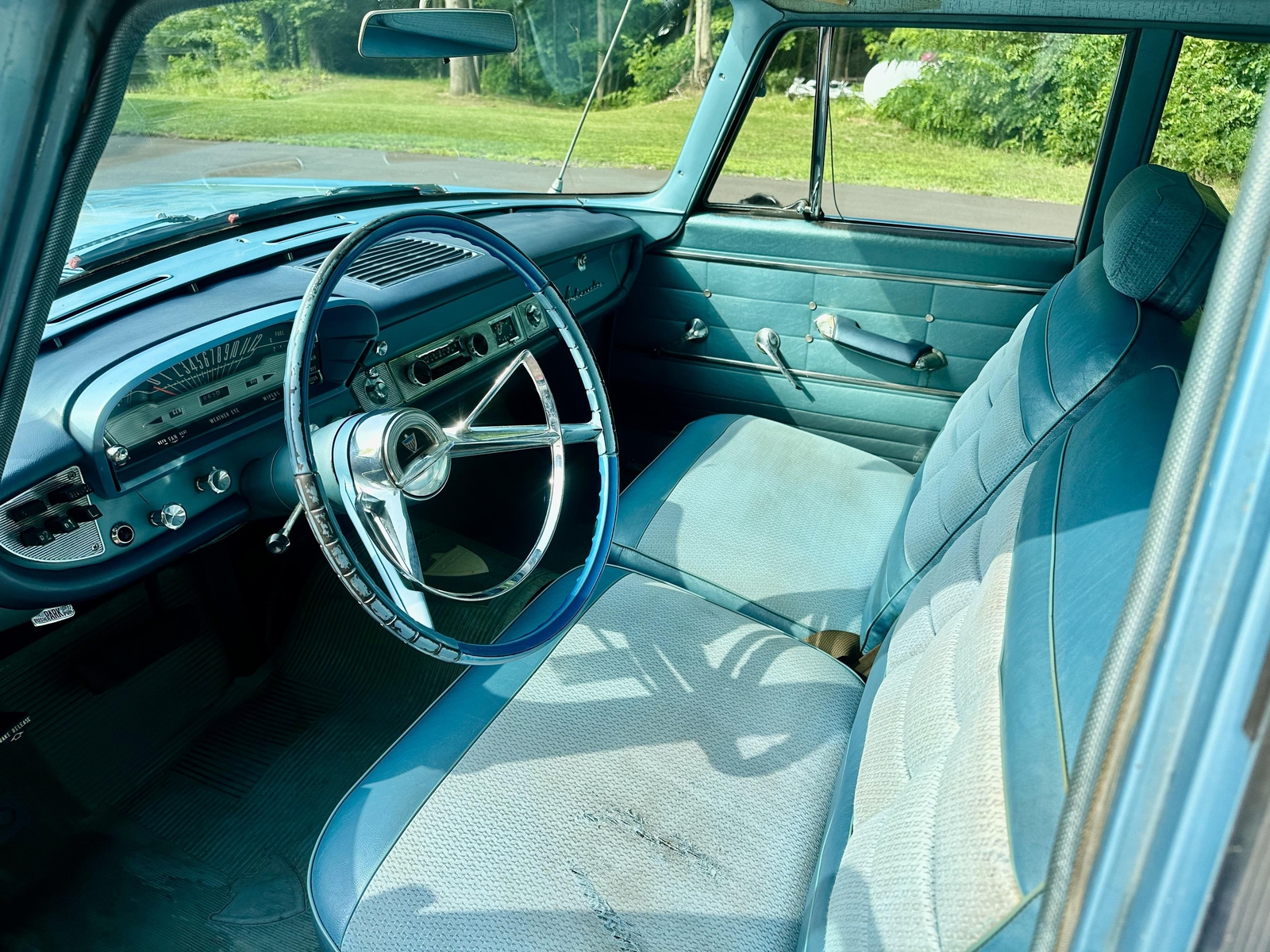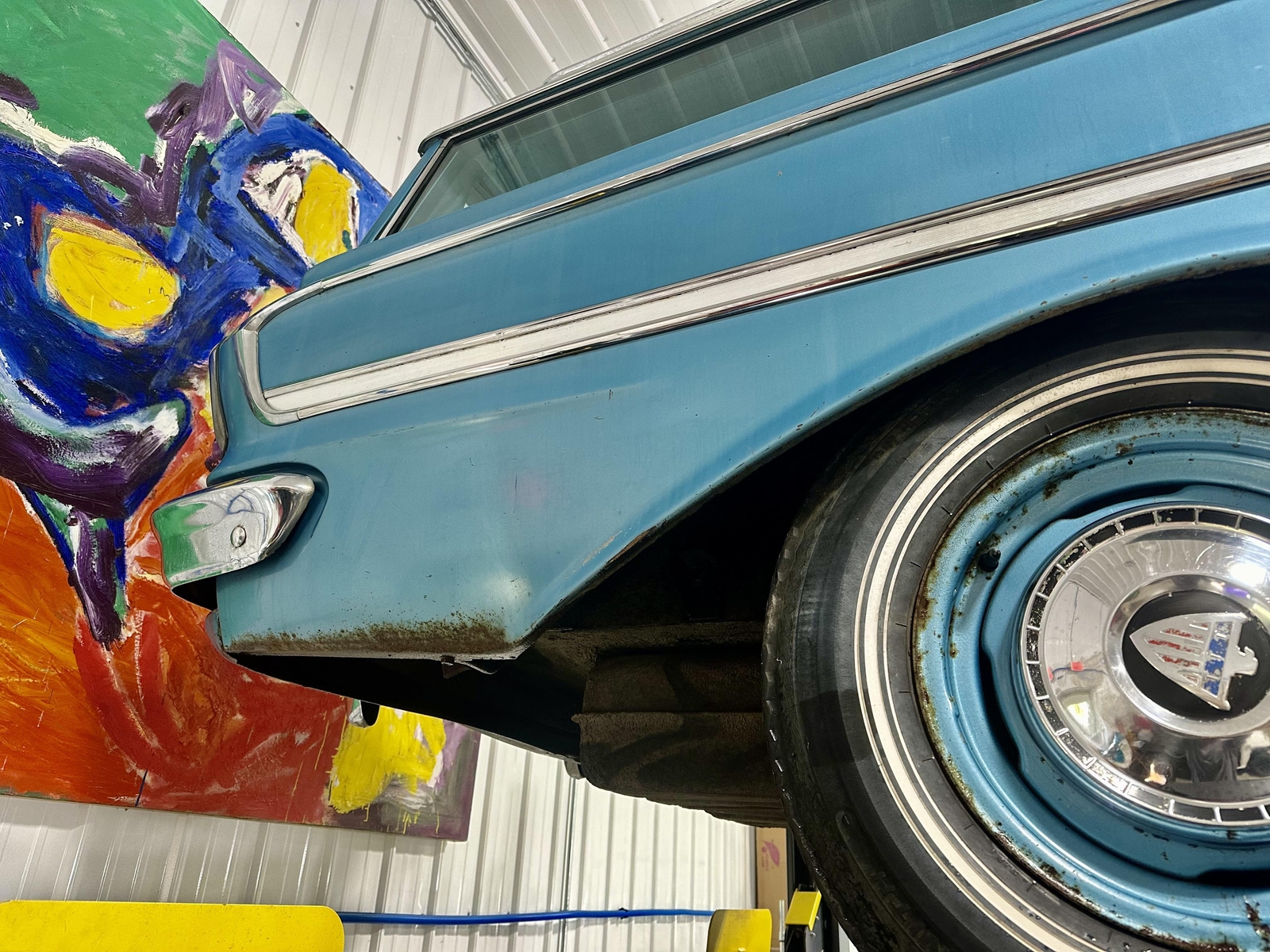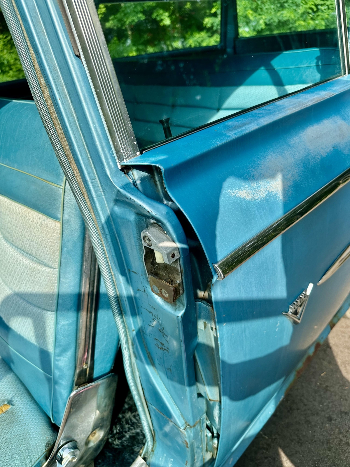 This wagon's body is straight with no signs of prior damage, featuring its original Baron Blue Metallic paint, which, although faded, retains its authenticity. All trim, hardware, and chrome are present and in good condition. The glass is clear and intact. While there are minor rust spots, the car is an excellent candidate for restoration or can be enjoyed as a cruiser in its current state.
