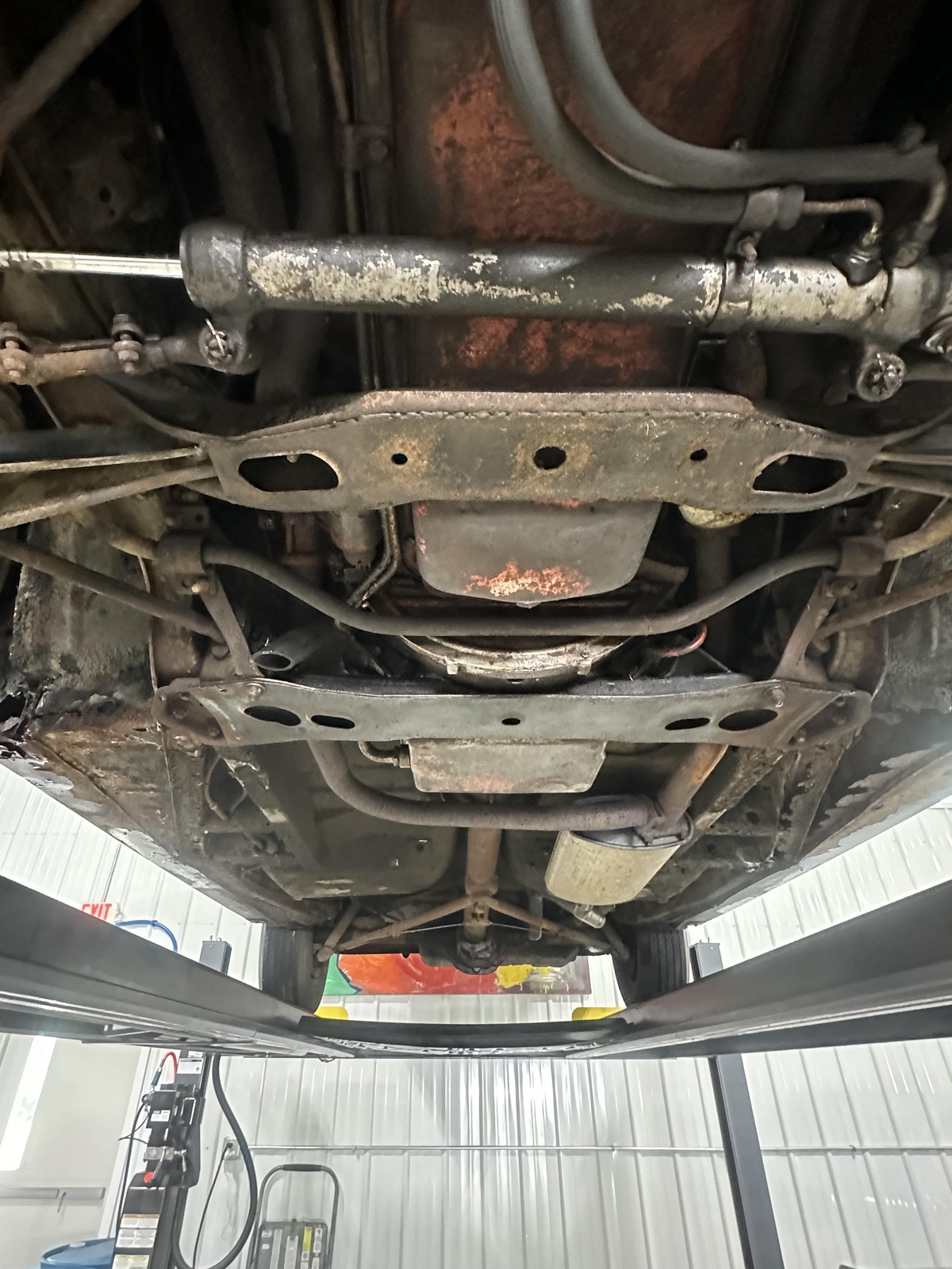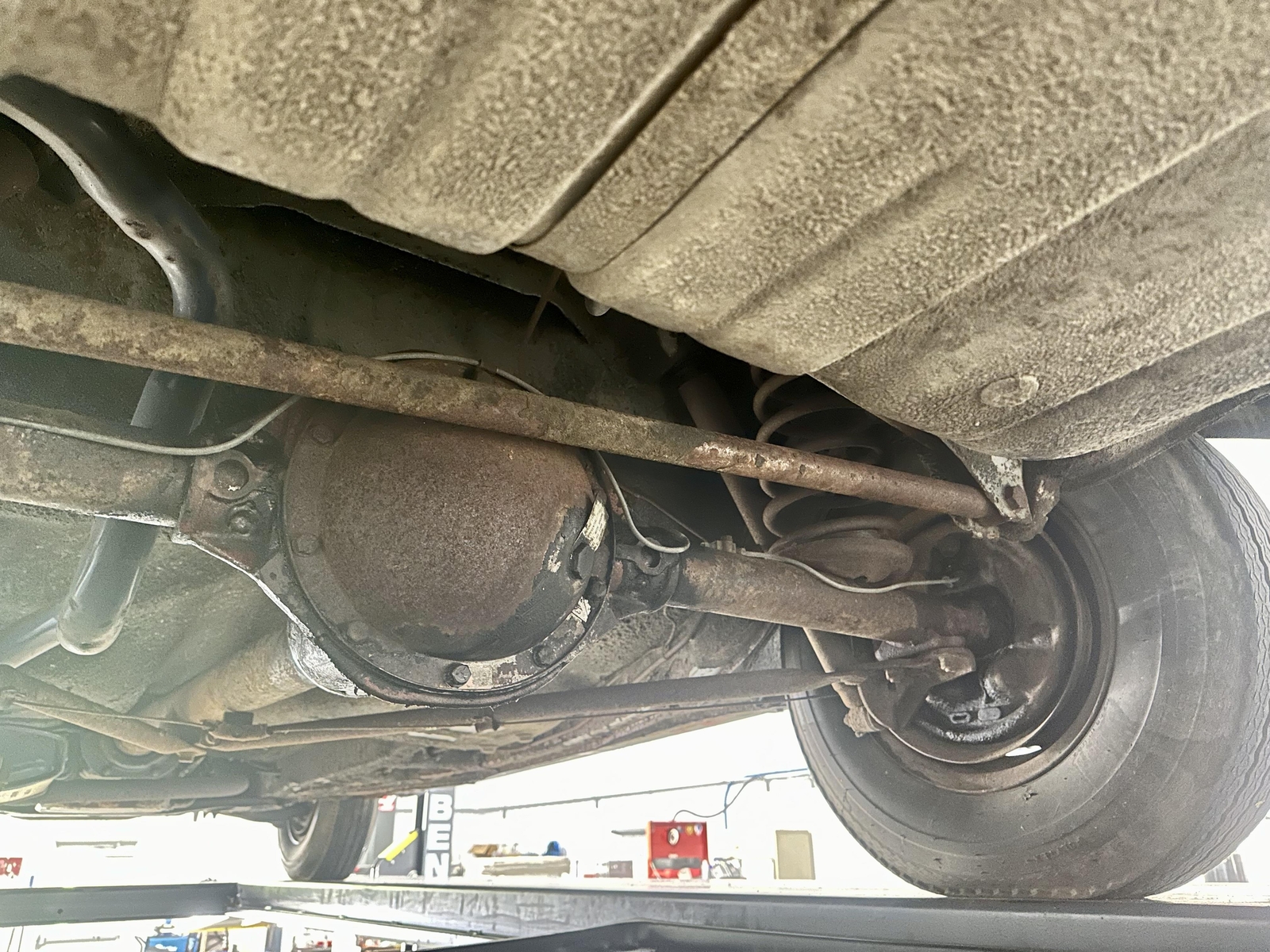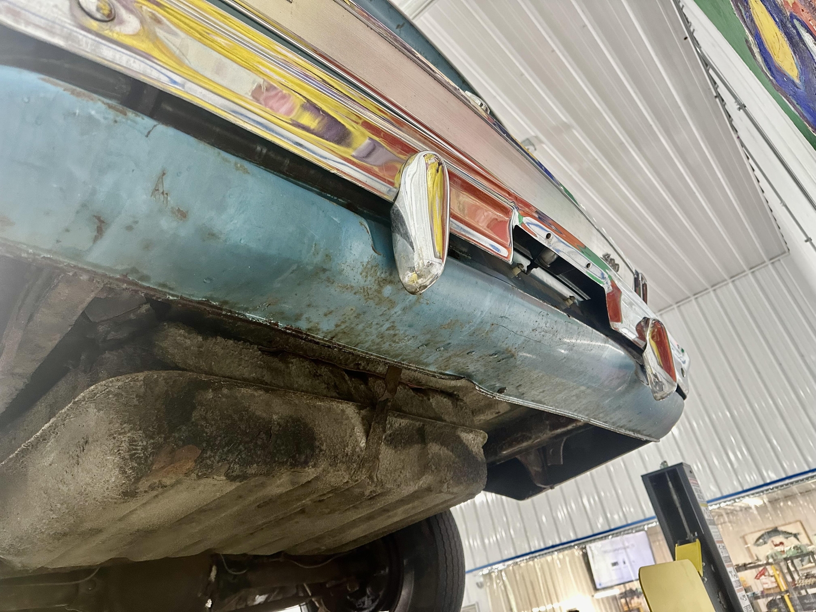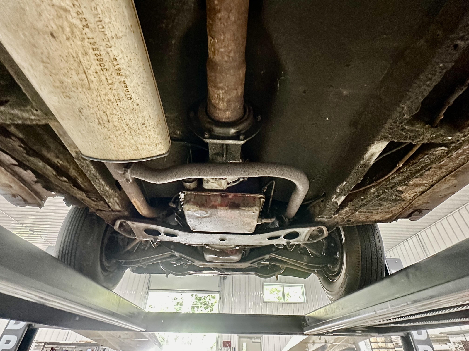Under the hood lies the original AMC 327 ci V8 engine, complete with all original components. The power steering and power brakes are operational, though the brakes are weak and could use servicing. The underbody remains largely original except for a newer exhaust and muffler setup. The car runs smoothly on its own fuel system, starting easily and maintaining a nice idle. There is some rust beneath the front seats extending into the fender liner area, but overall, the underside is solid and straight. The radiator has a lower leak but still circulates coolant effectively.