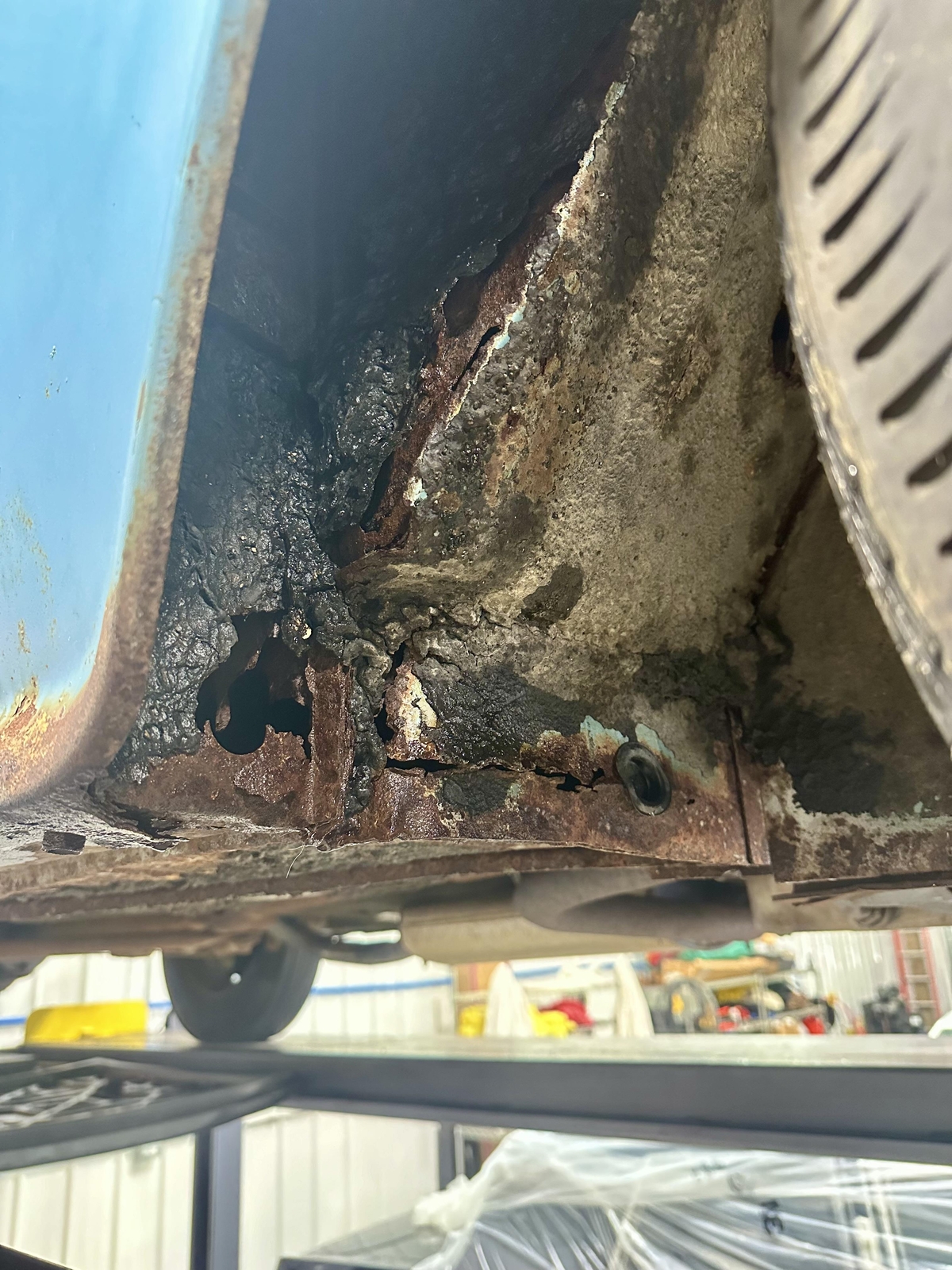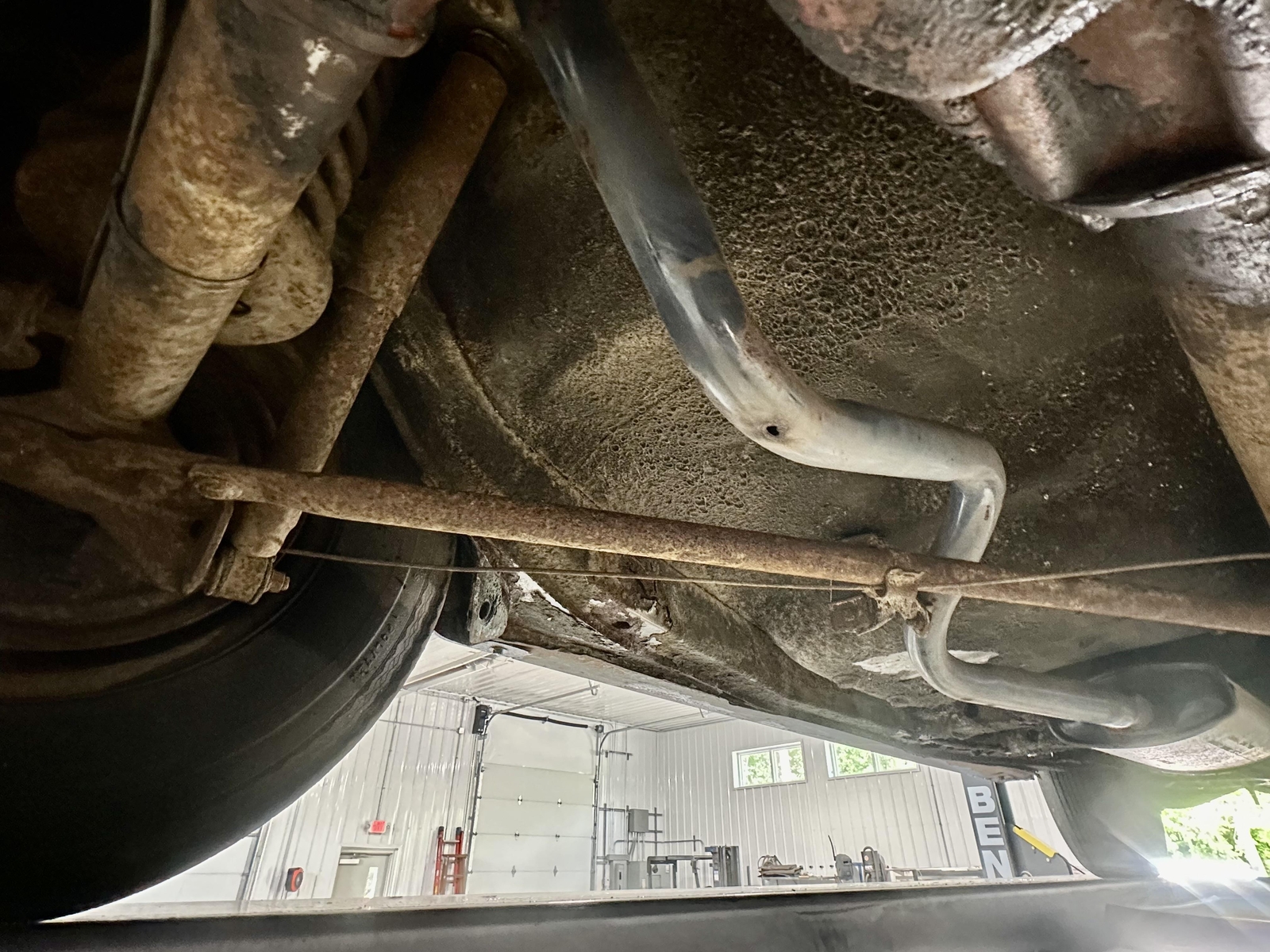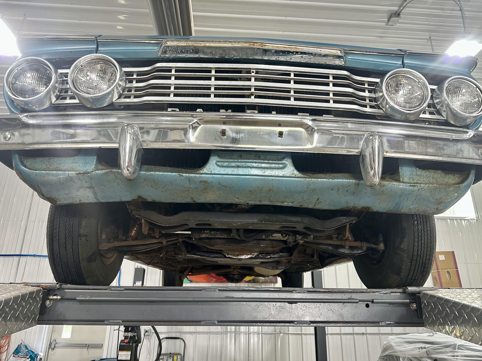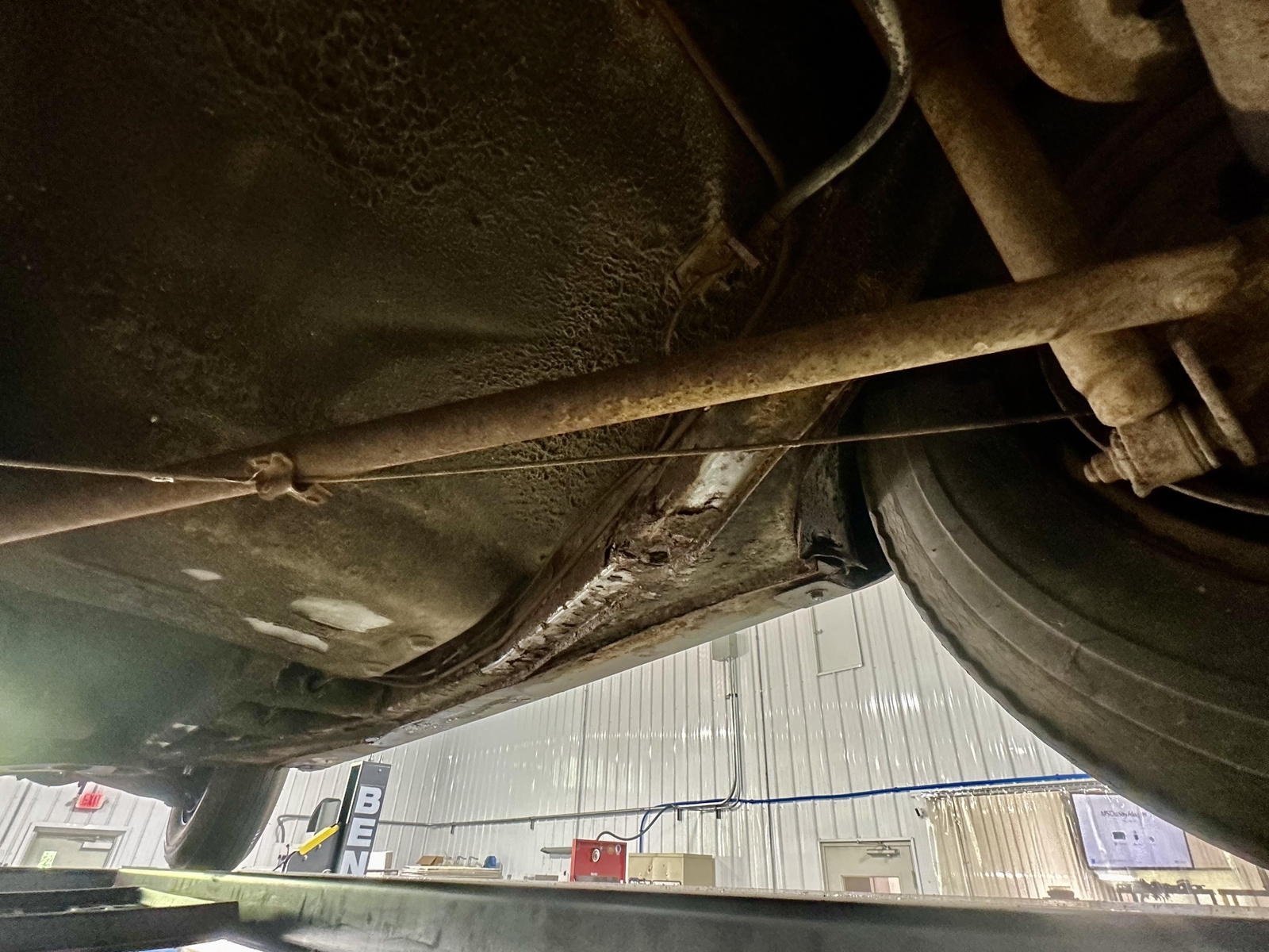 Under the hood lies the original AMC 327 ci V8 engine, complete with all original components. The power steering and power brakes are operational, though the brakes are weak and could use servicing. The underbody remains largely original except for a newer exhaust and muffler setup. The car runs smoothly on its own fuel system, starting easily and maintaining a nice idle. There is some rust beneath the front seats extending into the fender liner area, but overall, the underside is solid and straight. The radiator has a lower leak but still circulates coolant effectively.