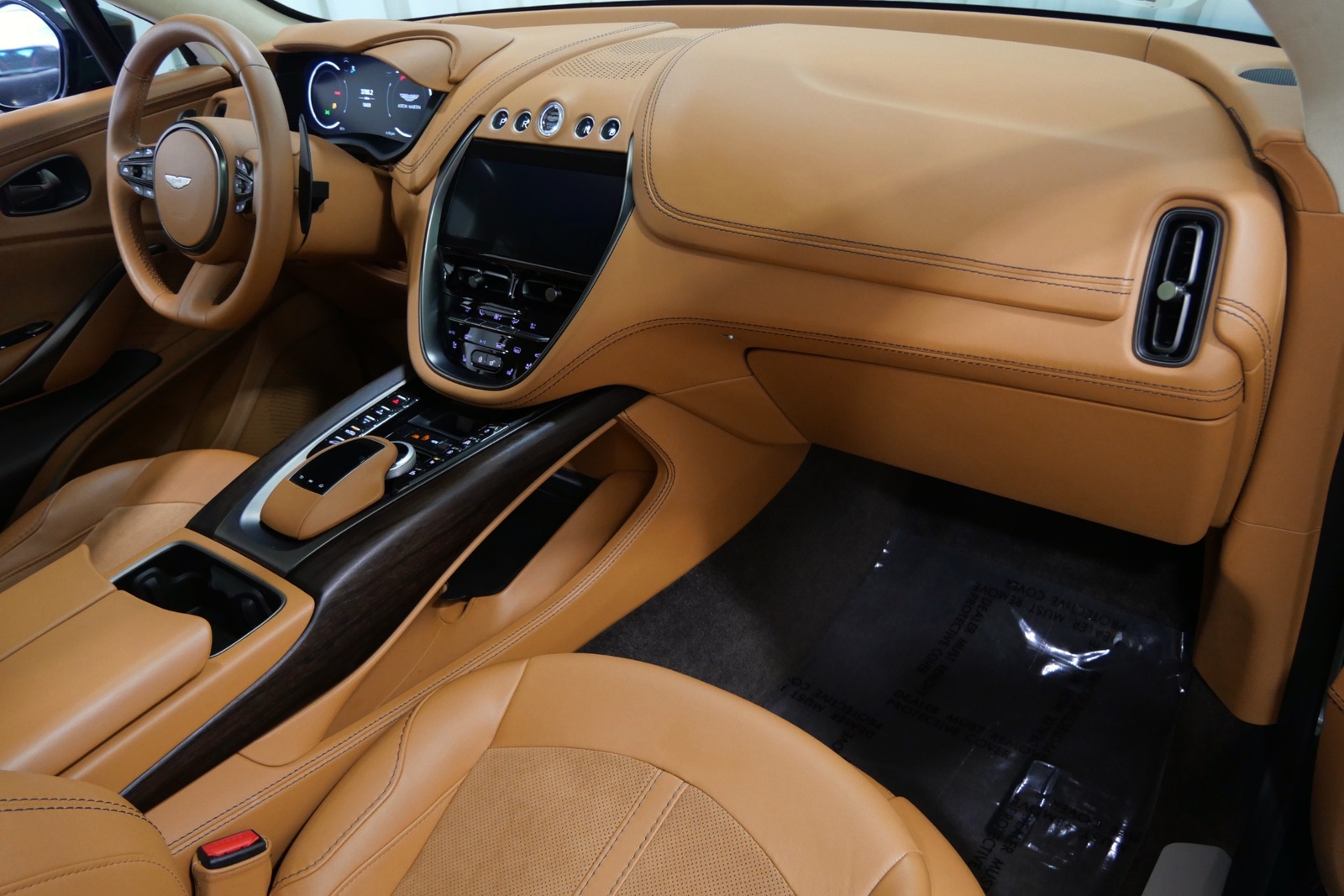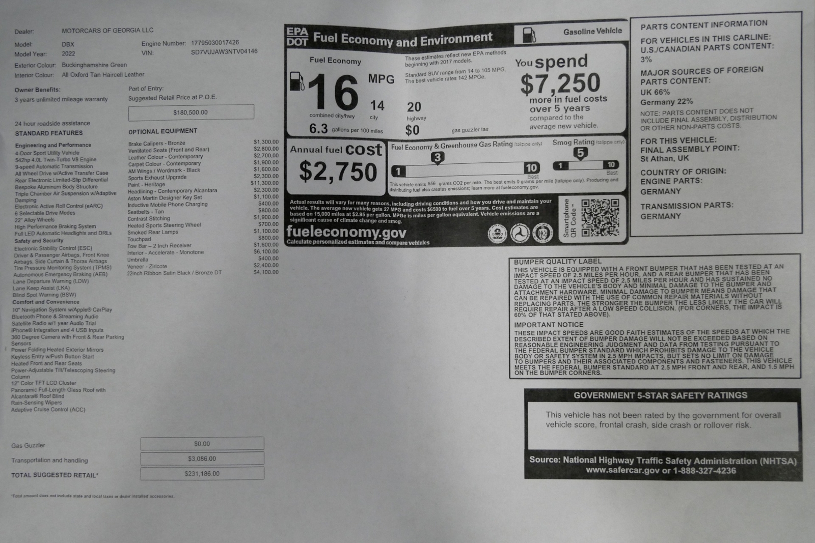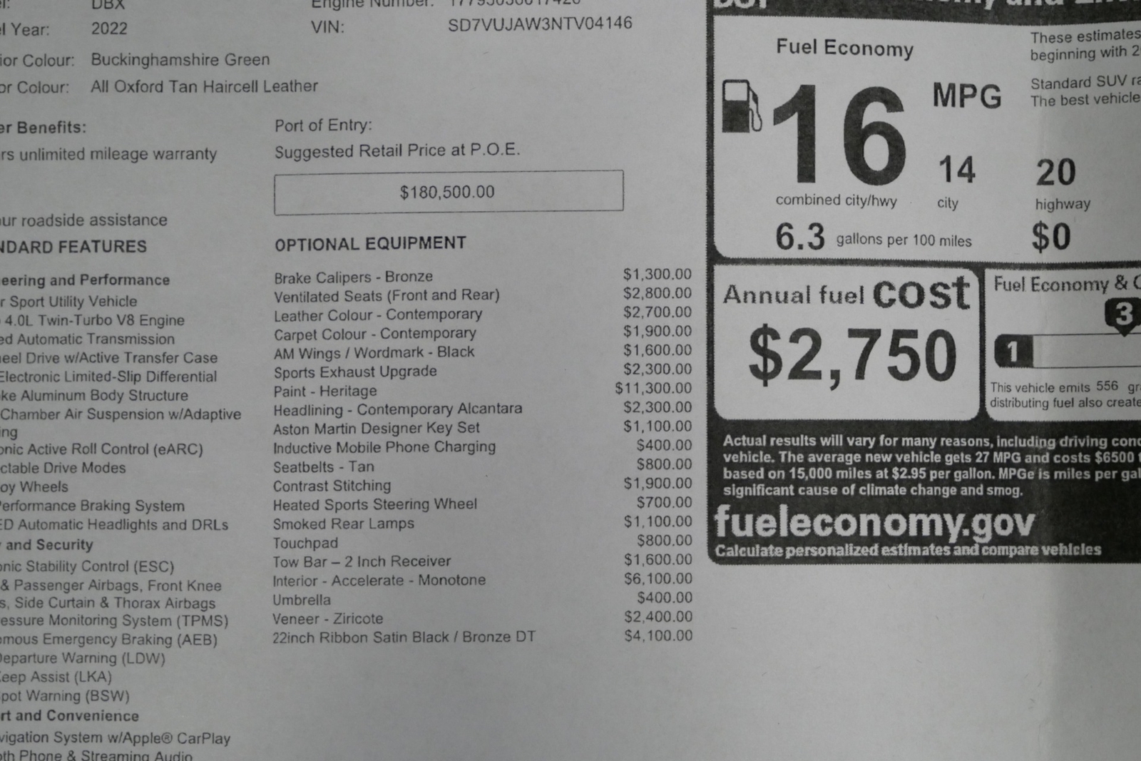 We have just added to our extensive exotic car inventory a beautiful 2022 Aston Martin DBX in Buckinghamshire Green over Oxford Tan Haircell leather with only 13,423 miles. This DBX is loaded with: 4.0 Liter twin turbo V8 with 542 horsepower, 9 speed automatic transmission, satin black and bronze diamond turned 22 inch ribbon wheels, bronze brake calipers, sports exhaust upgrade, heritage paint color, smoked rear lamps, front and rear heated and ventilated seats, AM wings in black, Accelerate monotone interior, ziricote wood veneer, heated sports steering wheel, touchpad, leather color-contemporary, carpet color-contemporary, headlining-contemporary Alcantara, contrast stitching, inductive mobile phone charging, tan seatbelts, Apple CarPlay, front and rear parking sensors with 360 degree camera, tow bar, floor mats, rear cargo mat and much more. The original MSRP was $231,186 with $40,700 in options.