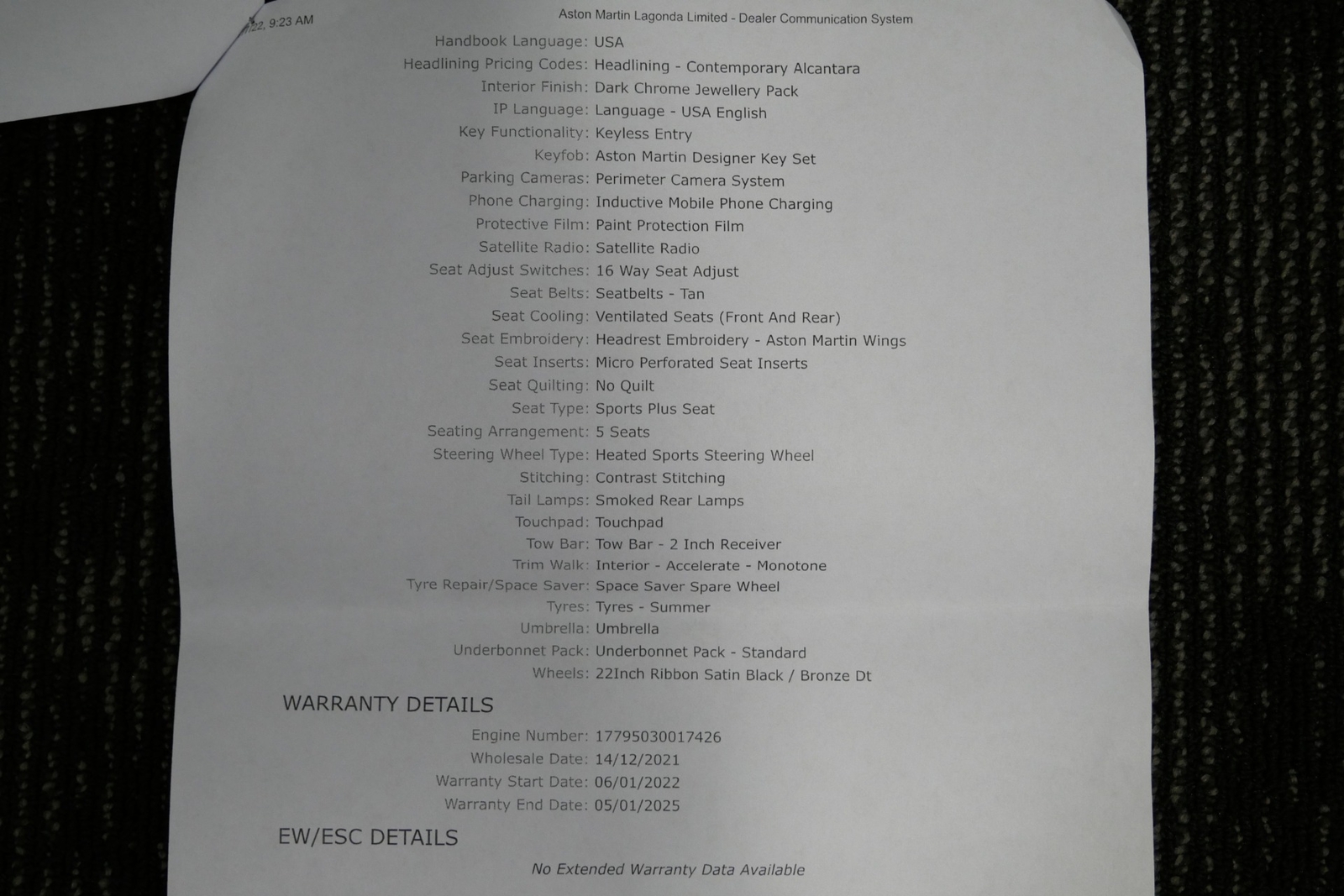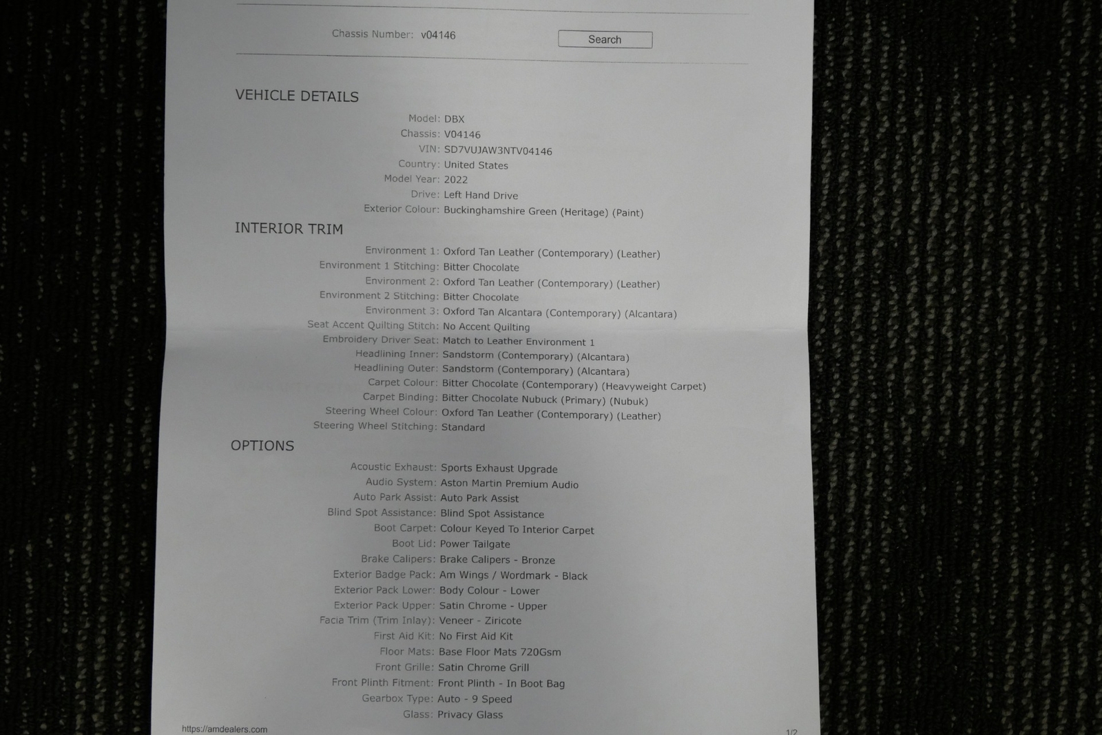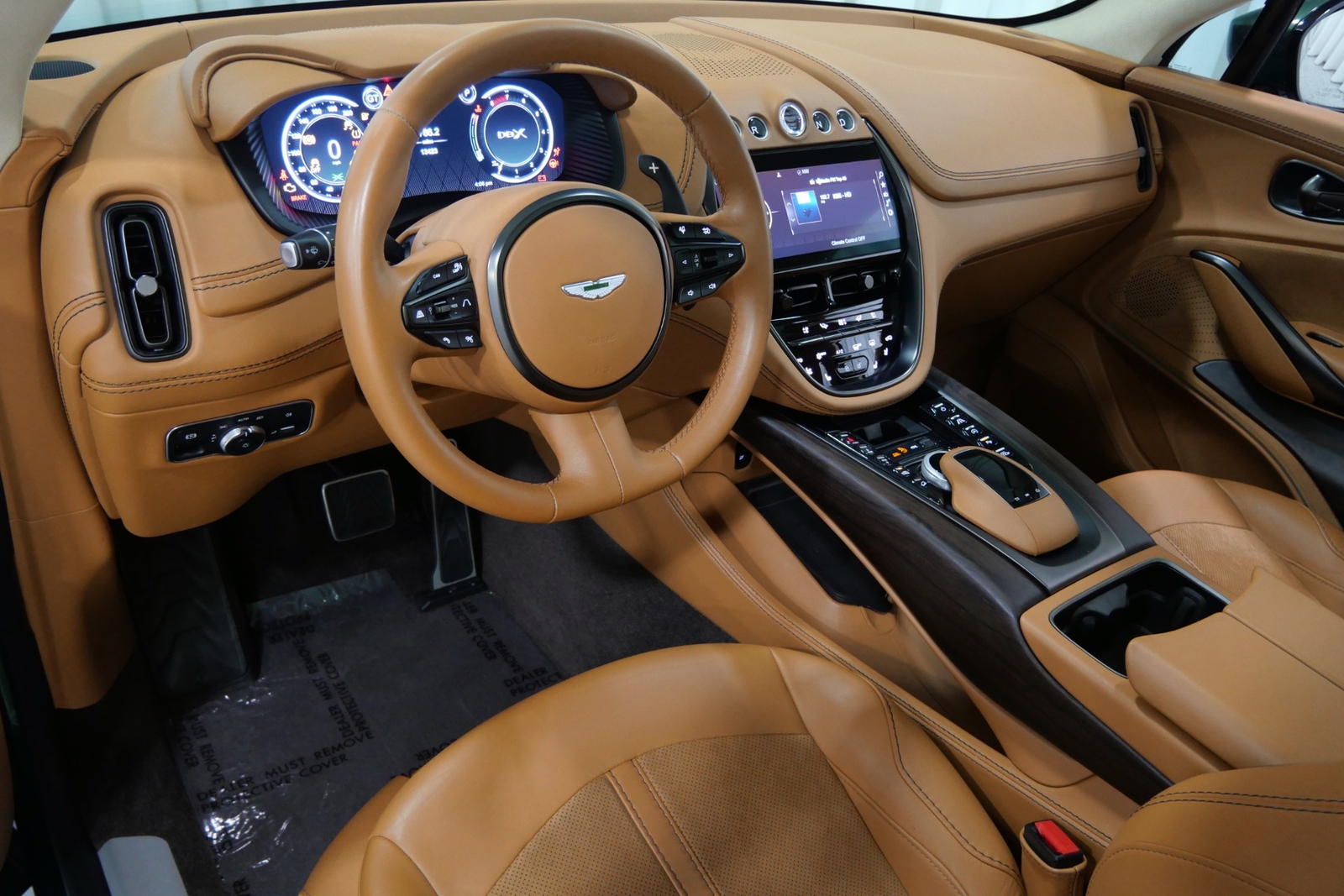 We have just added to our extensive exotic car inventory a beautiful 2022 Aston Martin DBX in Buckinghamshire Green over Oxford Tan Haircell leather with only 13,423 miles. This DBX is loaded with: 4.0 Liter twin turbo V8 with 542 horsepower, 9 speed automatic transmission, satin black and bronze diamond turned 22 inch ribbon wheels, bronze brake calipers, sports exhaust upgrade, heritage paint color, smoked rear lamps, front and rear heated and ventilated seats, AM wings in black, Accelerate monotone interior, ziricote wood veneer, heated sports steering wheel, touchpad, leather color-contemporary, carpet color-contemporary, headlining-contemporary Alcantara, contrast stitching, inductive mobile phone charging, tan seatbelts, Apple CarPlay, front and rear parking sensors with 360 degree camera, tow bar, floor mats, rear cargo mat and much more. The original MSRP was $231,186 with $40,700 in options.
