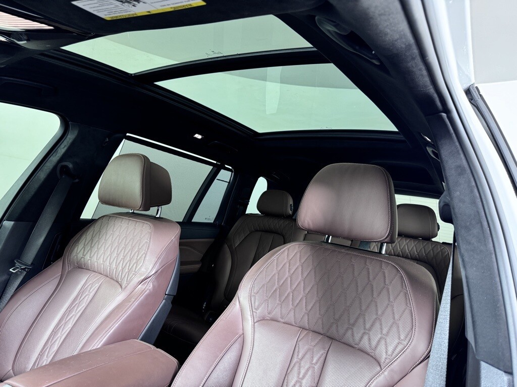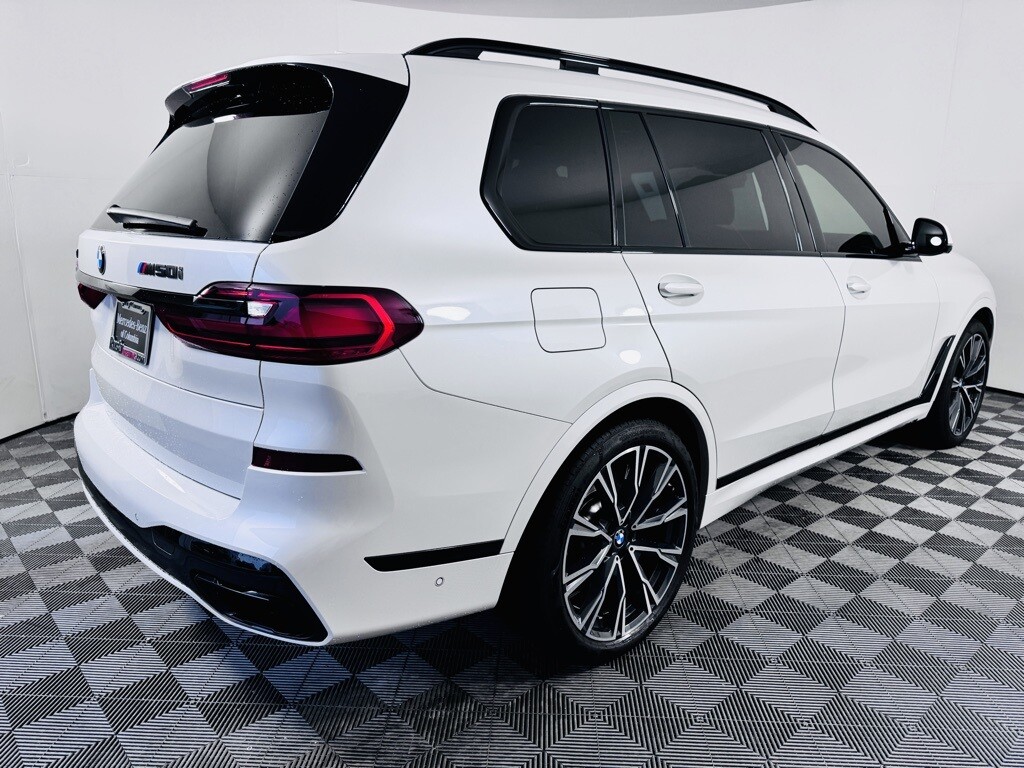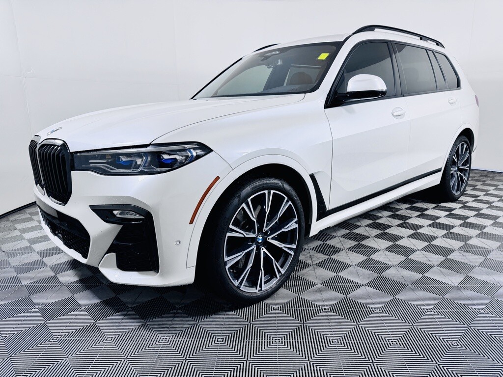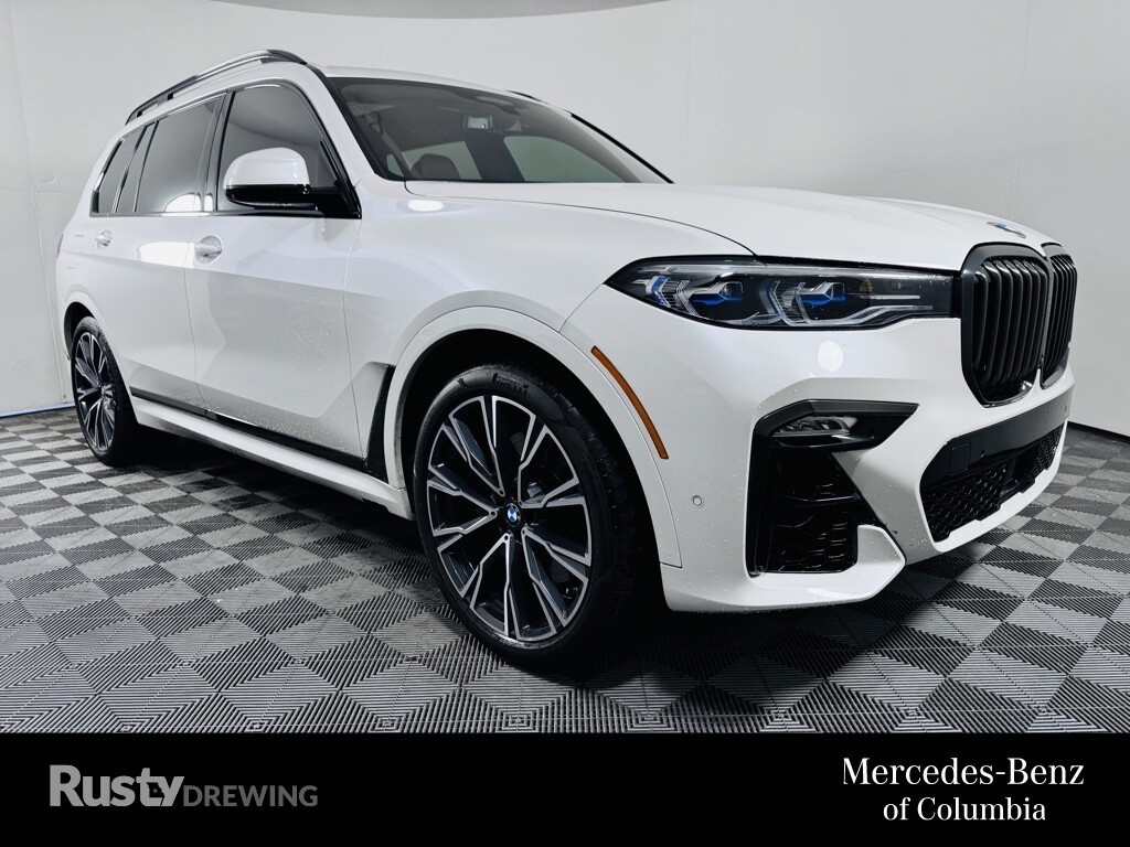 Clean CARFAX. White Metallic 2021 BMW X7 M50i AWD 8-Speed Automatic 4.4L V8 DOHC 32V GPS Navigation, Back Up Camera, Moonroof, Leather, Heated Seats, X7 M50i, 4D Sport Utility, 4.4L V8 DOHC 32V, 8-Speed Automatic, AWD, White Metallic, Coffee Leather, Connected Package Pro, Front Ventilated Seats, Heated front seats, Heated steering wheel, Navigation System, Power moonroof.