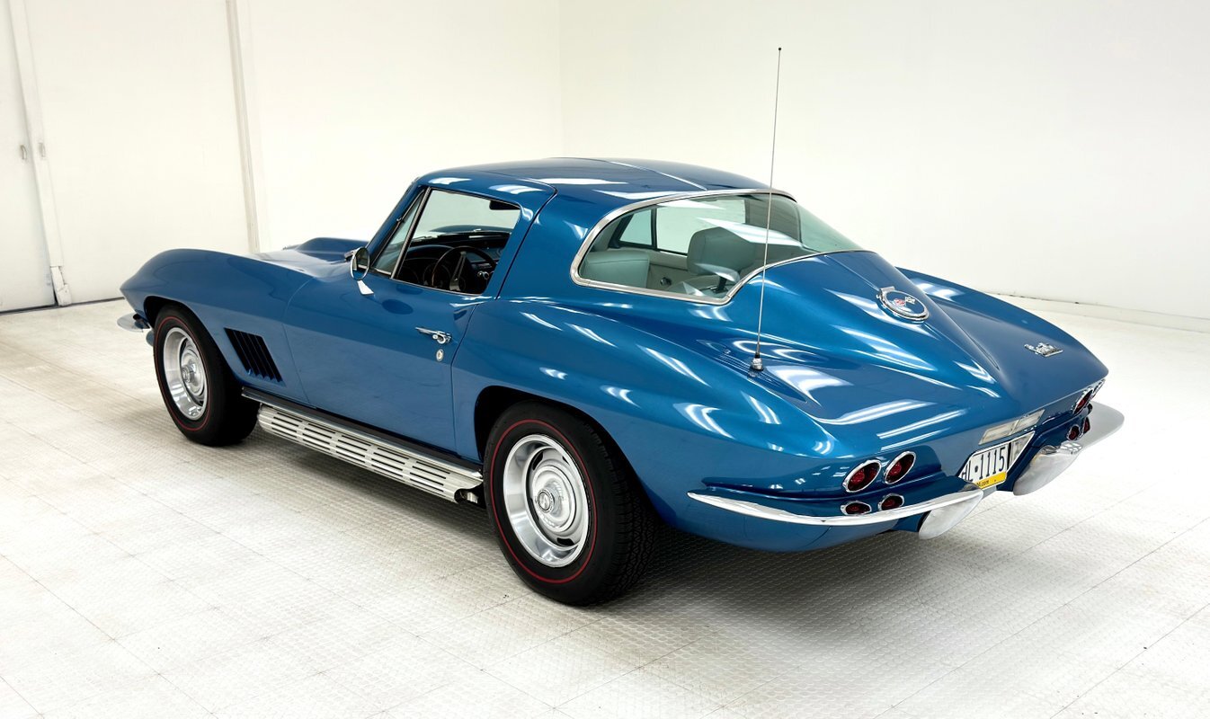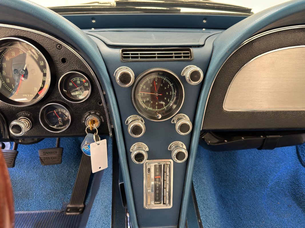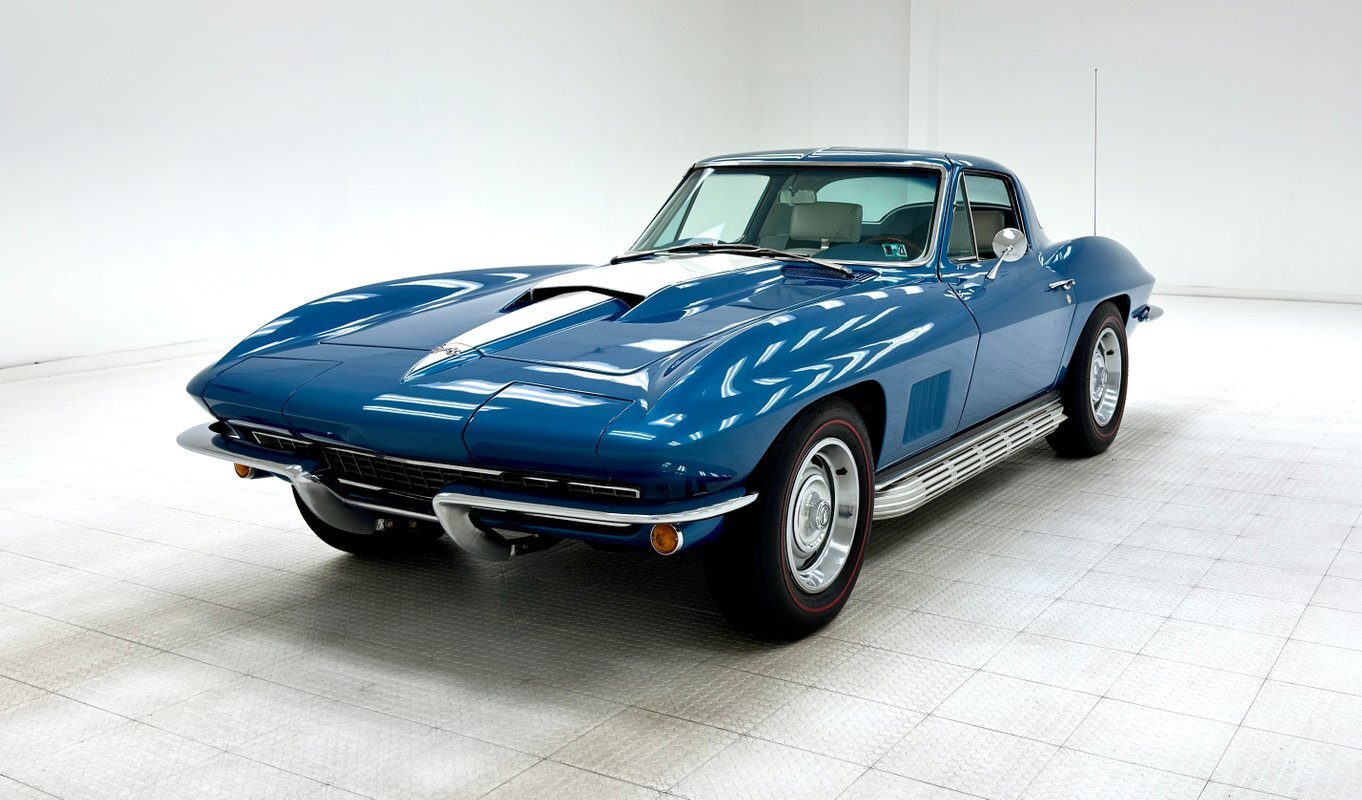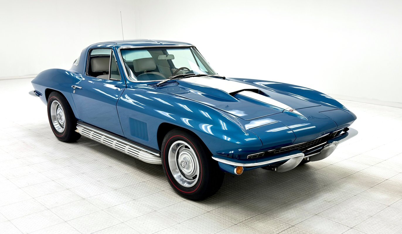For consignment, a 1967 Chevrolet Corvette coupe with a 327 and in the second most common color, Marina Blue. Goodwood Green was produced in the most numbers with 4,293 leaving the factory in green. With only around 23,000 Corvettes built in '67, all of them today are considered uncommon or rare, regardless of color.