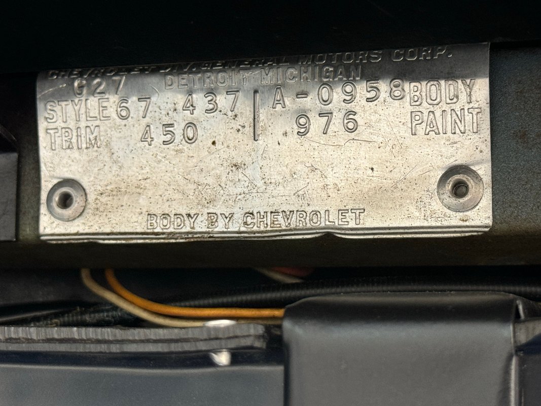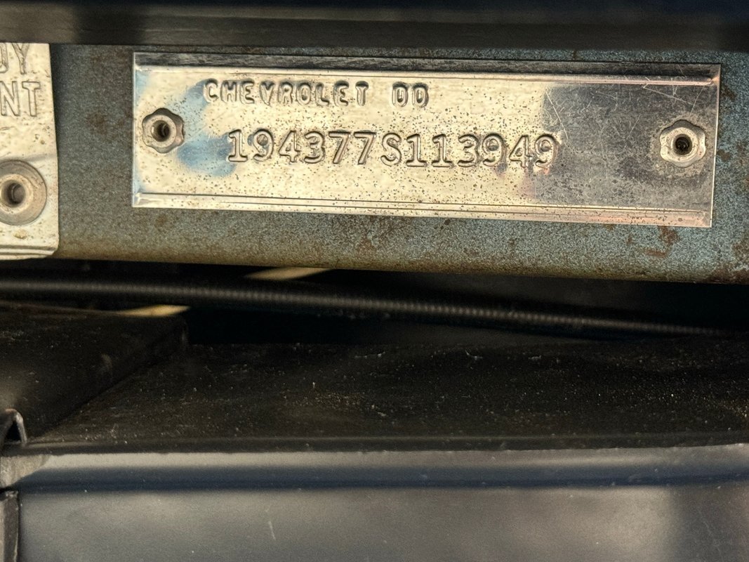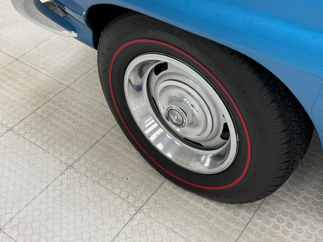 Pulling the hood forward reveals a very clean date-correct 327ci V8 topped by a 4-barrel carburetor and rated at 275 horsepower. It's backed by a Muncie M20 4-speed manual transmission circa 1968-1970 that sends power to the rear wheels and 3.08 gears with Positraction. Power disc brakes are on all four wheels. The A/C belt has been removed.