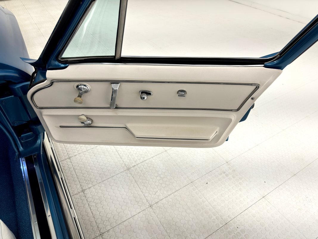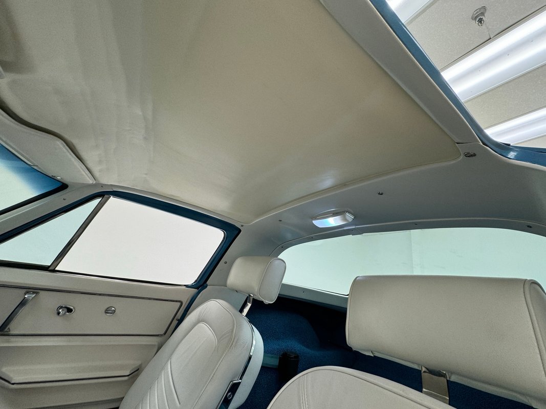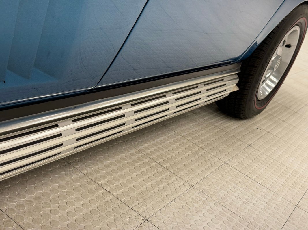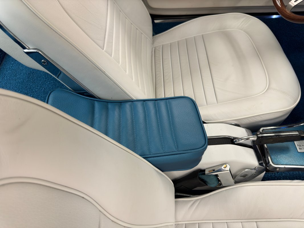 White plastic door panels appear cleanly on each side. Is the white as bright as it was one day one? Probably not but still completely presentable. The white leather bucket seats however, look fresh with some minor compression from use and the desirable headrests which were vinyl from the factory. Bright blue loop carpet covers the floor and the cargo area and is in excellent condition, while the headliner remains tight but shows some underlying texture toward the front. A 3 spoke wood rimmed steering wheel fronts the eyebrow dash which holds a gauge cluster in black plastic and silver rimmed dials arranged in a symmetrical pattern and accompanied by a series of knobs and switches. The center waterfall stack, lined in blue, has a clock, more knobs, and the vertically mounted AM/FM radio. The passenger's eyebrow houses a glove box with a name plate. A Hurst shifter resides in the center console in an aluminum plate that shows some usage and a padded blue armrest.