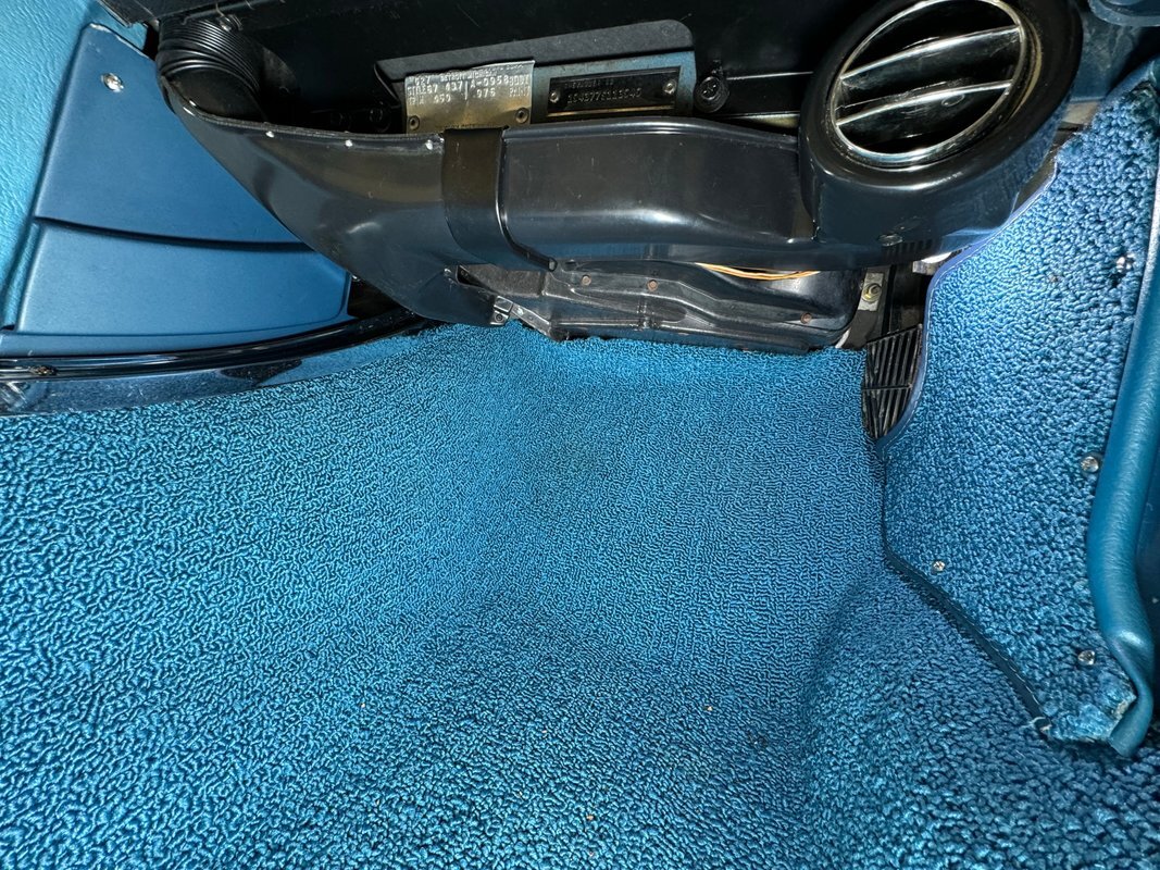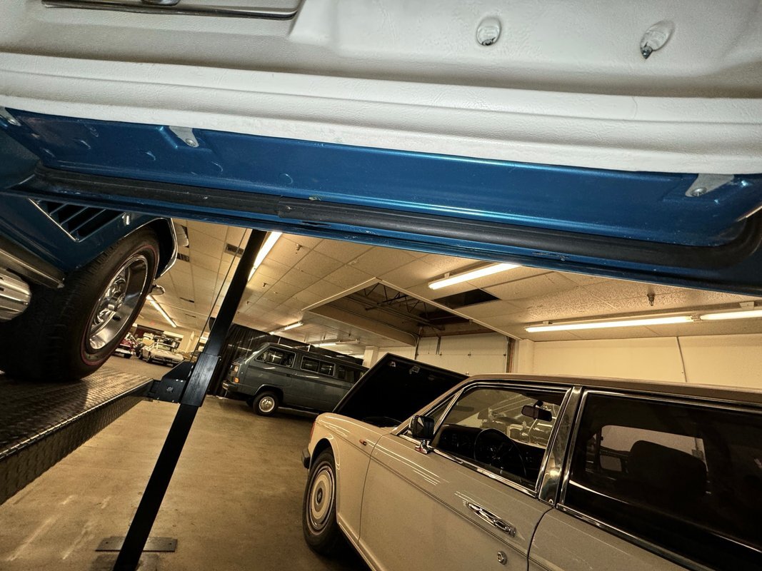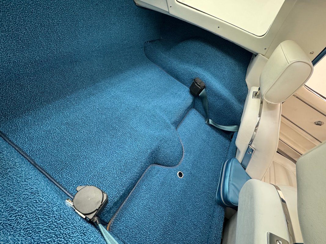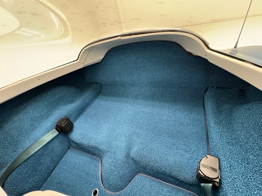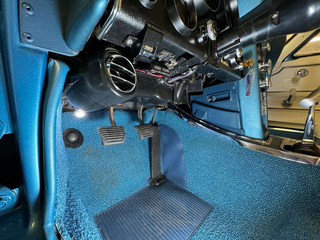 White plastic door panels appear cleanly on each side. Is the white as bright as it was one day one? Probably not but still completely presentable. The white leather bucket seats however, look fresh with some minor compression from use and the desirable headrests which were vinyl from the factory. Bright blue loop carpet covers the floor and the cargo area and is in excellent condition, while the headliner remains tight but shows some underlying texture toward the front. A 3 spoke wood rimmed steering wheel fronts the eyebrow dash which holds a gauge cluster in black plastic and silver rimmed dials arranged in a symmetrical pattern and accompanied by a series of knobs and switches. The center waterfall stack, lined in blue, has a clock, more knobs, and the vertically mounted AM/FM radio. The passenger's eyebrow houses a glove box with a name plate. A Hurst shifter resides in the center console in an aluminum plate that shows some usage and a padded blue armrest.