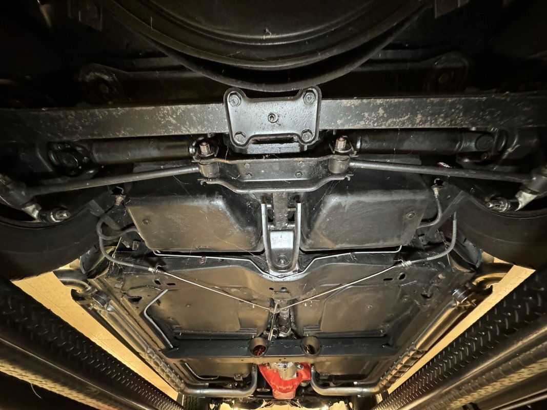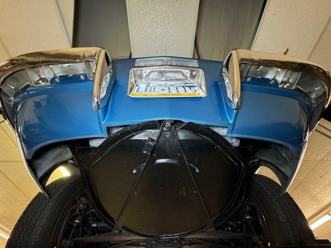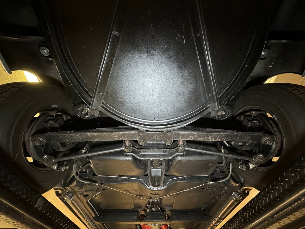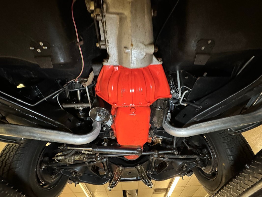 All clean underneath with no surface rust nor leaks to speak of. The dual exhaust flow directly to the side pipes and suspension consists of coil springs up front and Corvette's system of a frame mounted differential, tubular axle drive shafts, transverse strut rods, torque control arms, and transverse leaf springs.