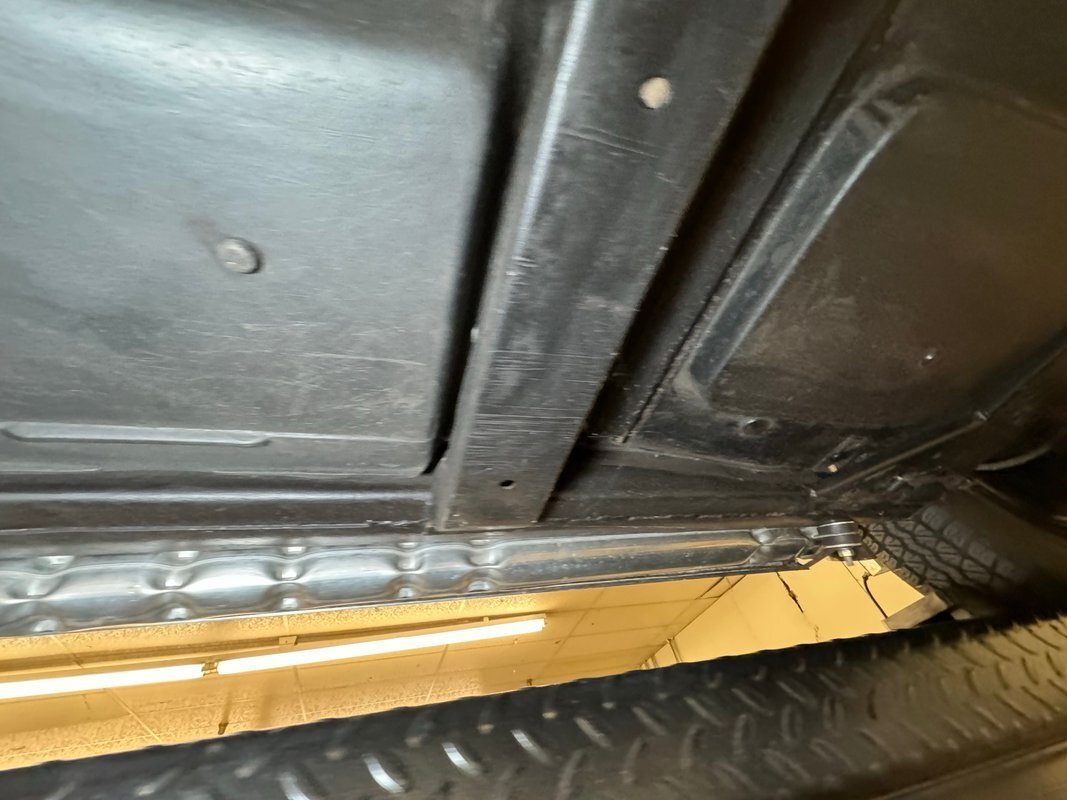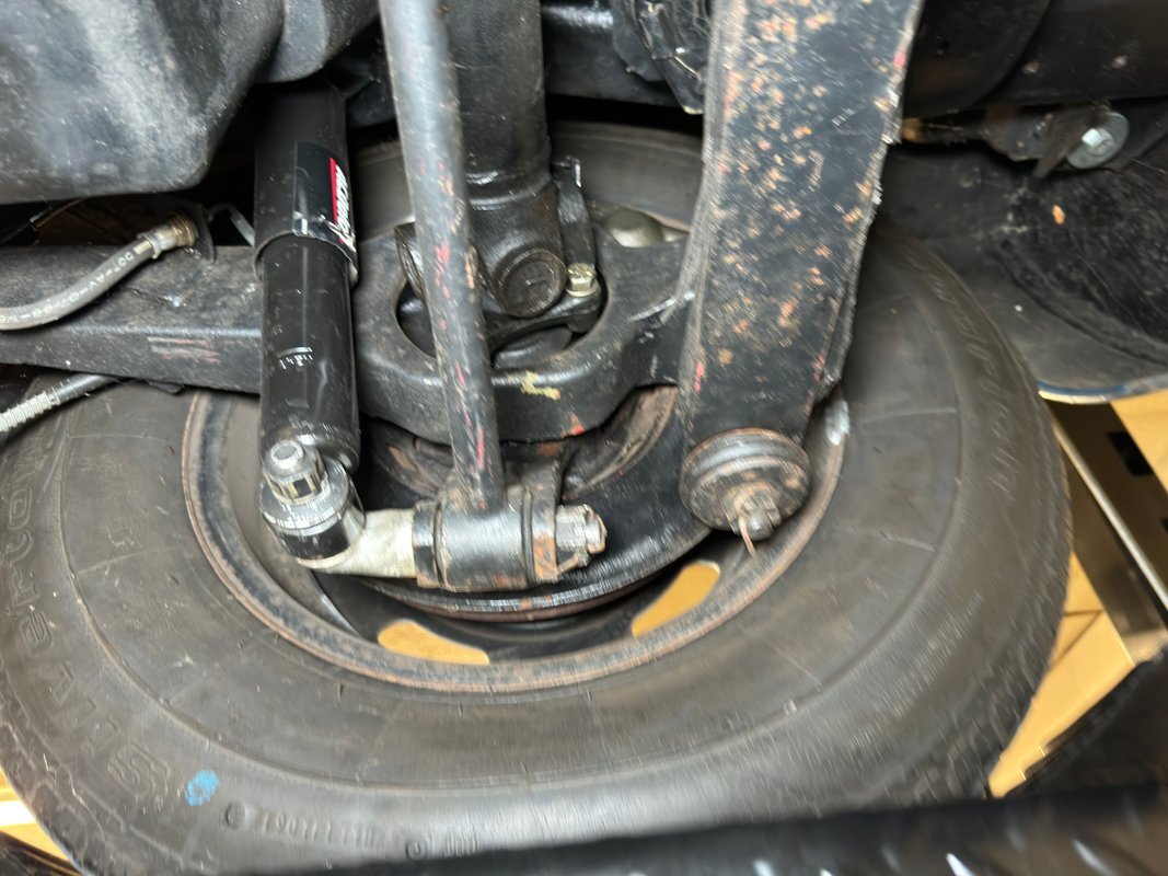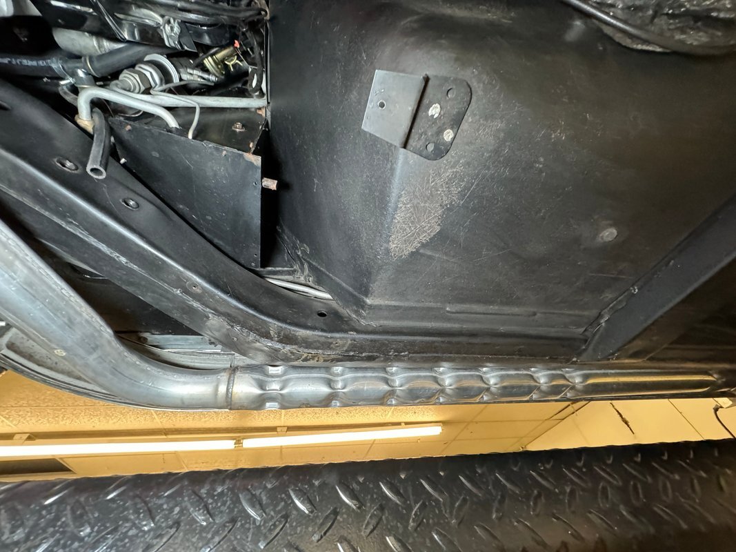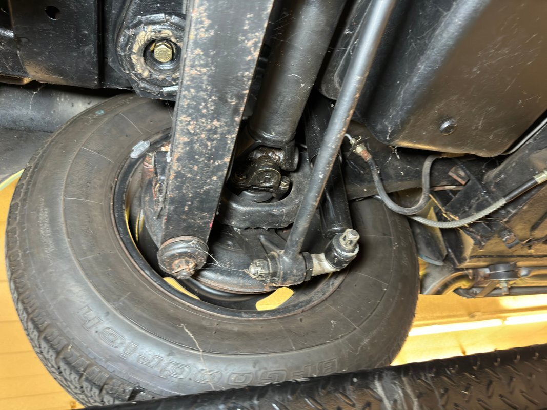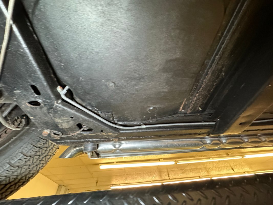 All clean underneath with no surface rust nor leaks to speak of. The dual exhaust flow directly to the side pipes and suspension consists of coil springs up front and Corvette's system of a frame mounted differential, tubular axle drive shafts, transverse strut rods, torque control arms, and transverse leaf springs.