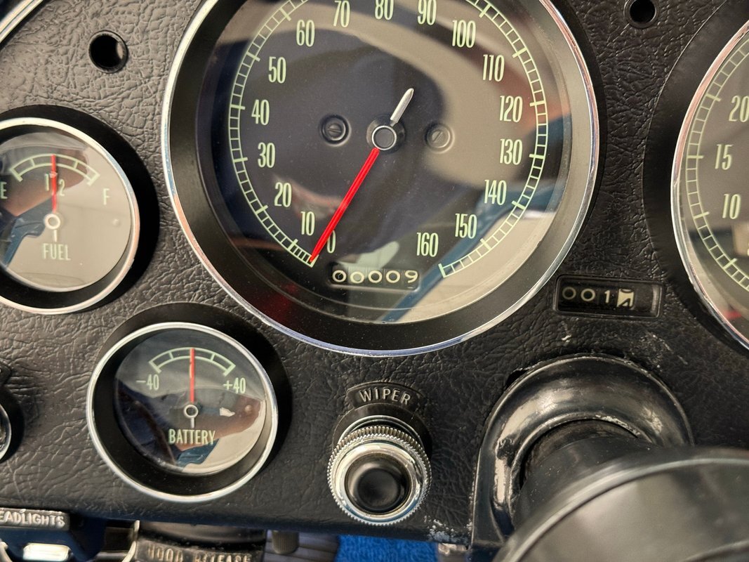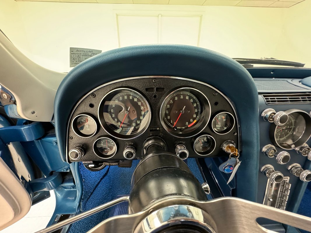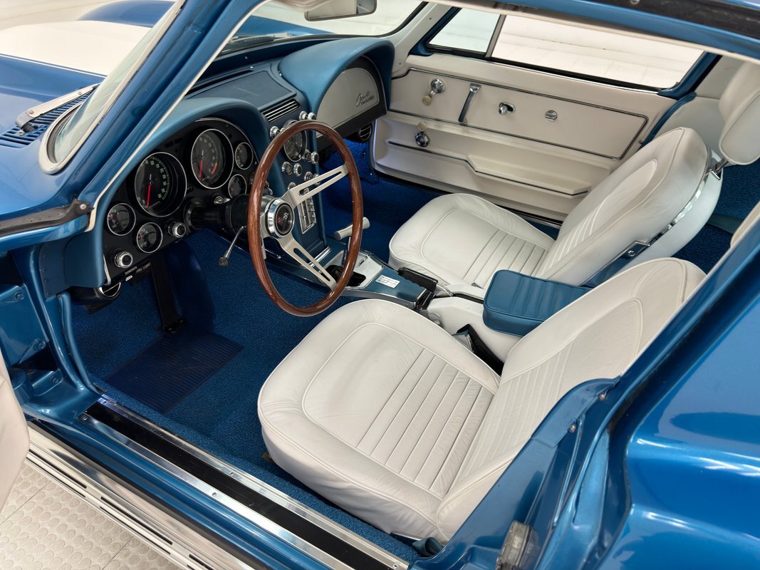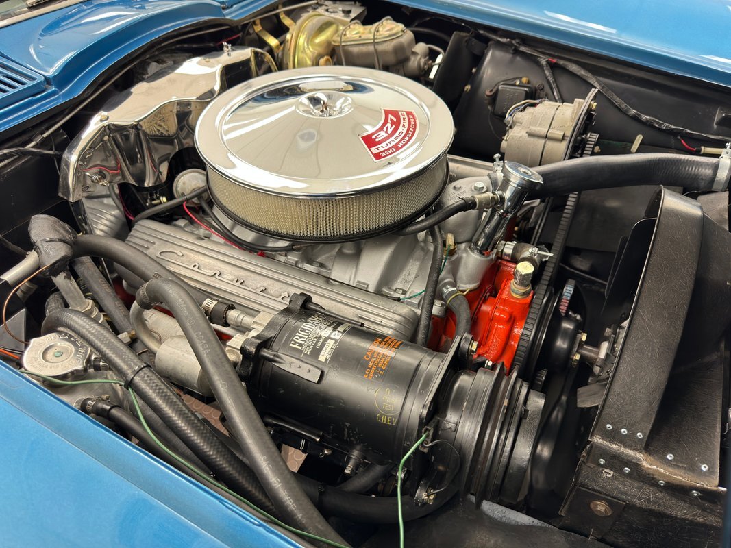Never a dull moment when you're piloting a 4-speed C2. The wonderfully white and blue interior creates an airy environment and the 327 makes a glorious noise it emits from the side pipes. Great acceleration, handling, and braking were observed, and we then proceeded with the functionality test. The following items were inoperable during our test: the horn, the wipers, speedometer, odometer, trip odometer, and radio. And of course, with no belt attached to the compressor, A/C would not work. All other functions worked as they should. While Classic Auto Mall represents that these functions were working at the time of our test drive, we cannot guarantee these functions will be working at the time of your purchase.