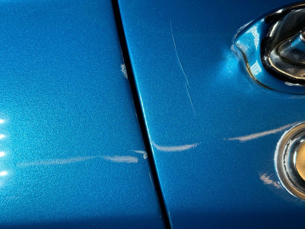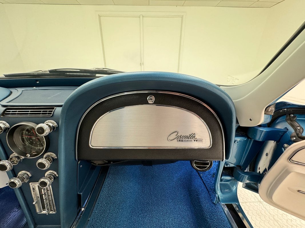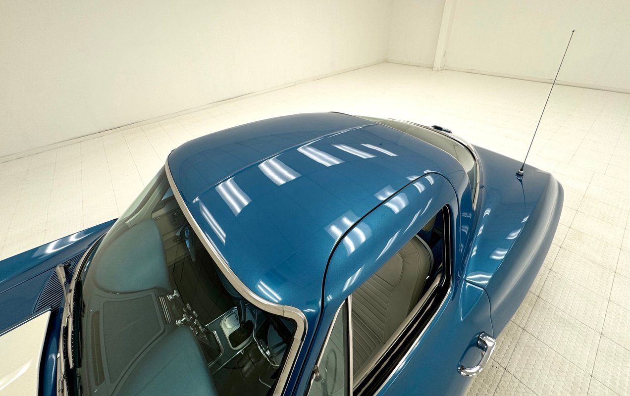 If you said this is the most beautiful American car ever designed you'd have a solid case. The lines molded into the fiberglass simply all work together is a sinuous flow of bulges and curves, and the Marina Blue does well to highlight it. Raised fenders flow back to a shoulder line that accentuates the sloping rear which ends in the point of a spear, borrowing depth from the curved rear window. Side pipes and their vented covers provide the sleek sports car with a muscular attitude and the 15-inch Chevrolet Rally wheels are the perfect fit. The Sting Ray hood is embellished with a white stinger but the rest of the car is adorned in blue and along with the metal work and well minded panel gaps, looks fantastic. Imperfections are limited to a couple of minor scratches and chips.