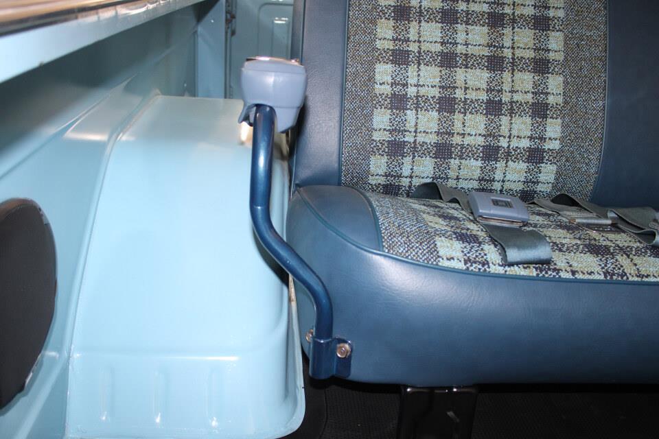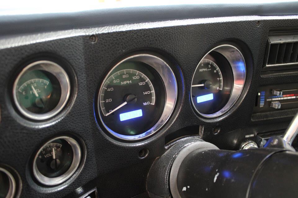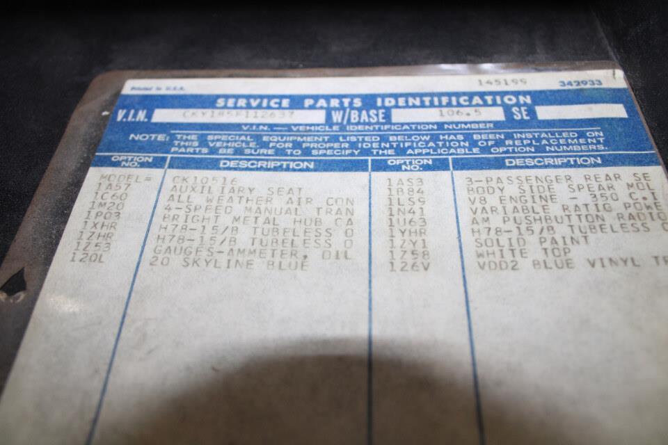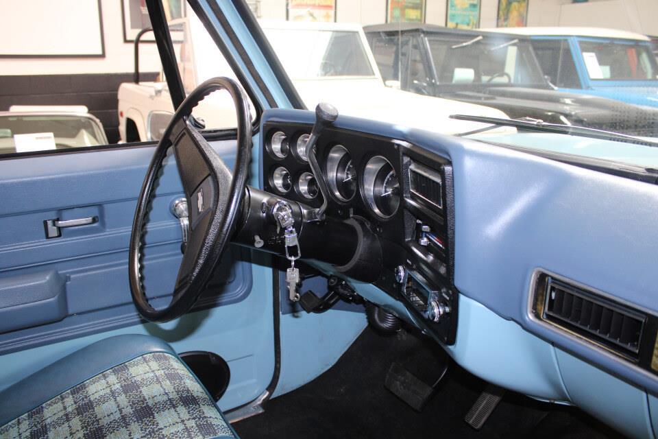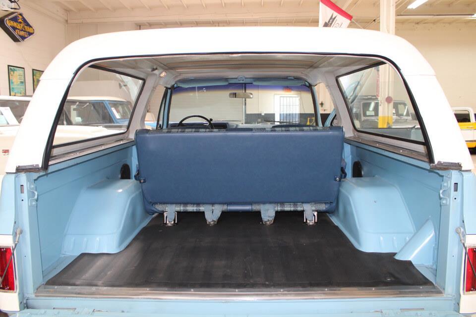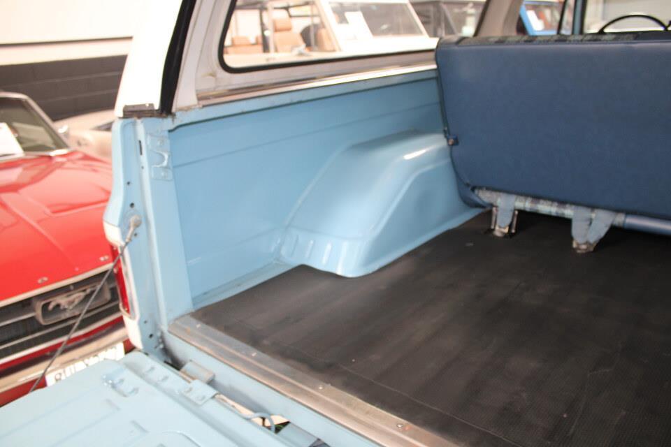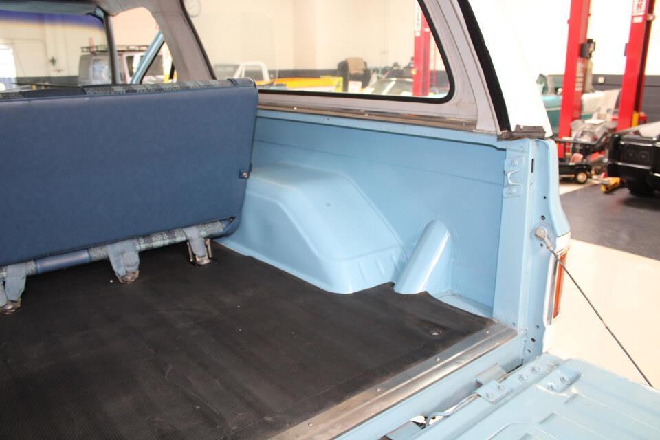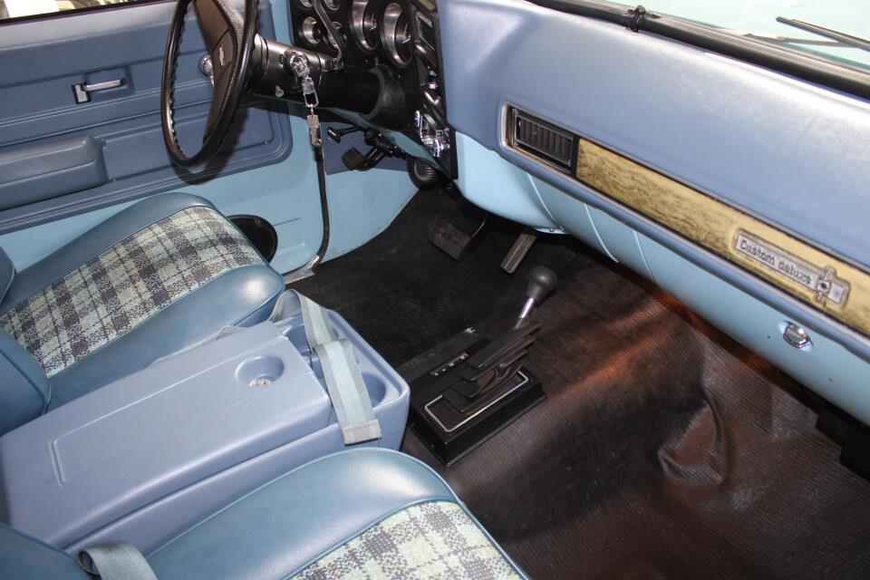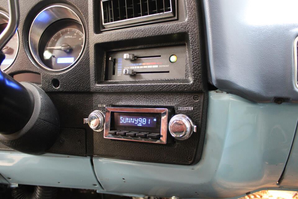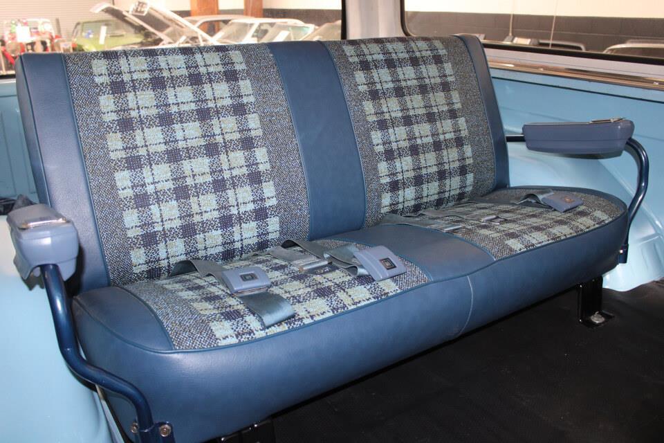 The front bucket seats and rear bench were reupholstered in blue vinyl with plaid cloth inserts under current ownership. Additional work reportedly included applying Kilmat sound deadener. Amenities consist of a center console with cupholders, an Old Air Products HVAC system, and a RetroSound stereo feeding four 6x9? Alpine speakers.