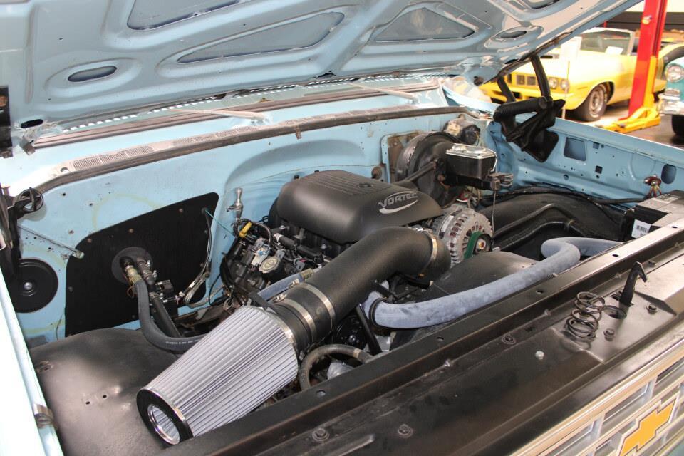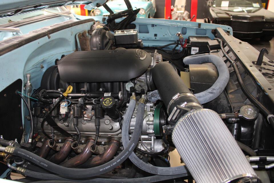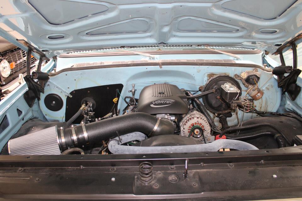 The 6.0-liter LQ4 V8 and 4L65E automatic transmission are said to have been sourced from a GMC Yukon Denali. Engine modifications include a BTR Truck Norris camshaft and valve springs, Speed Engineering long-tube headers feeding a dual exhaust system, and a custom ECU tune.