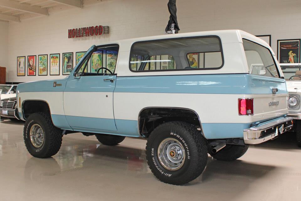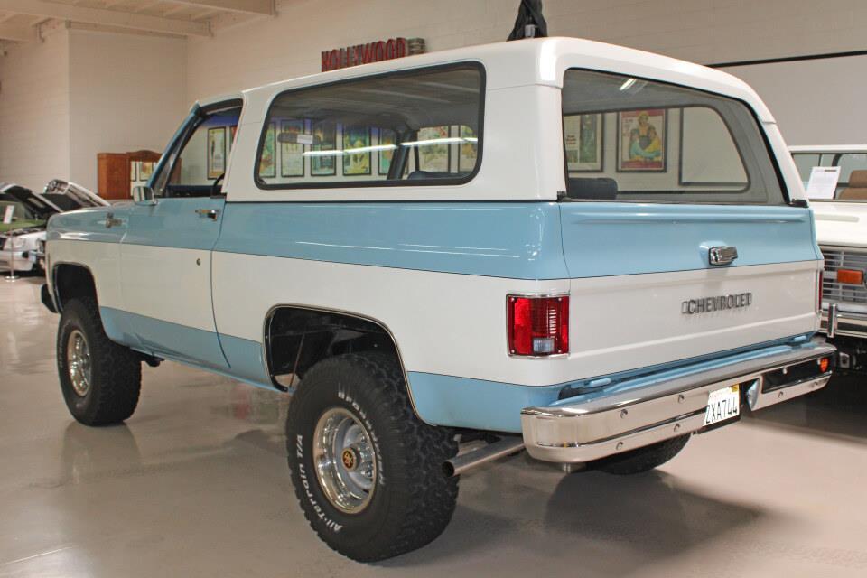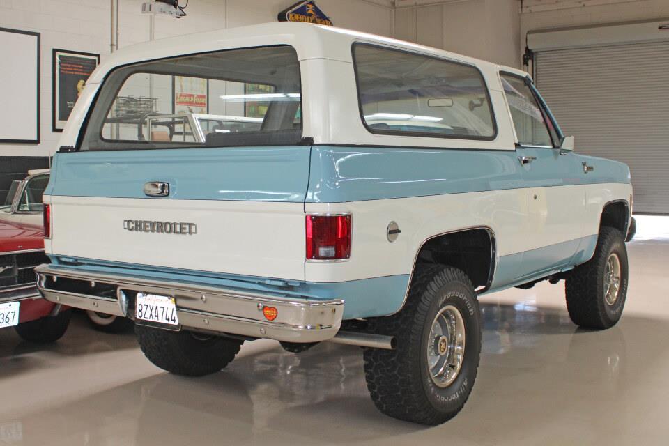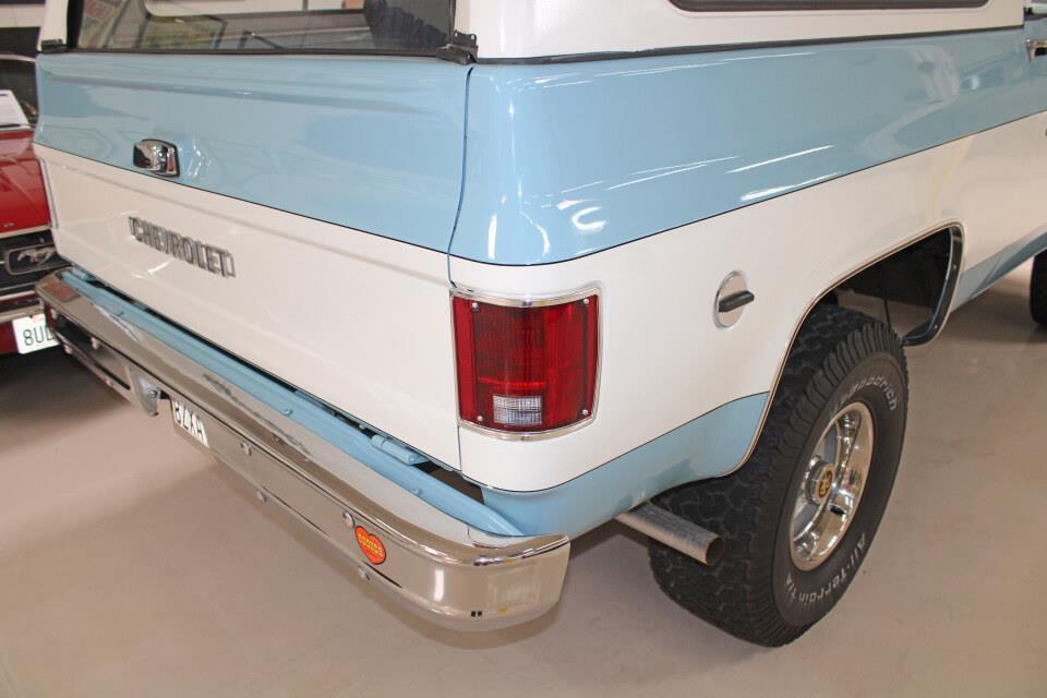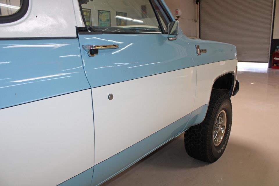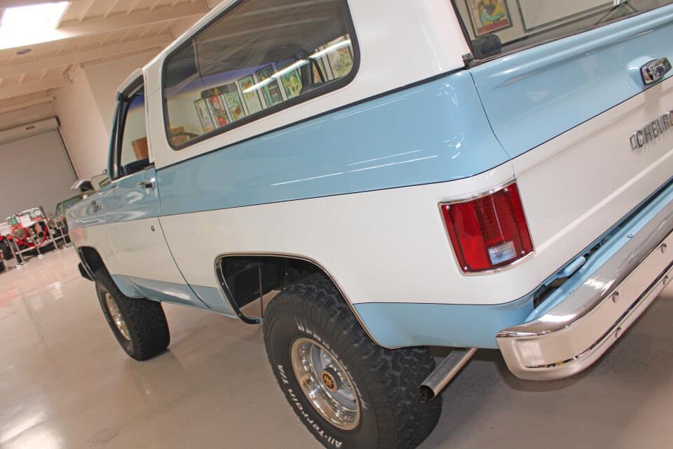 The truck was refinished in blue and white with black pinstripes under previous ownership. Features include a white removable hardtop, chrome bumpers, and K5 Blazer fender badges.