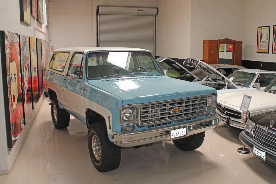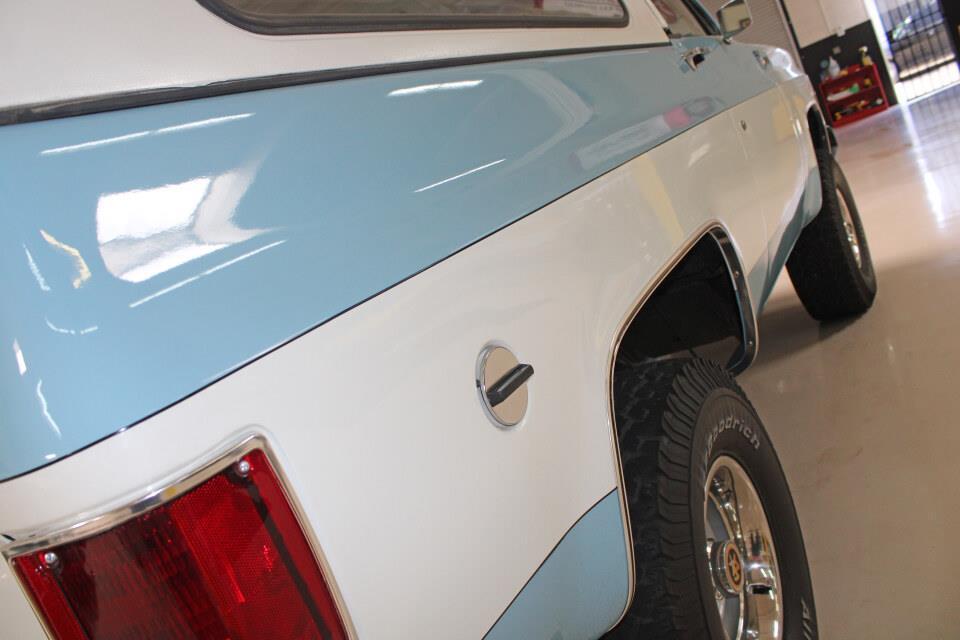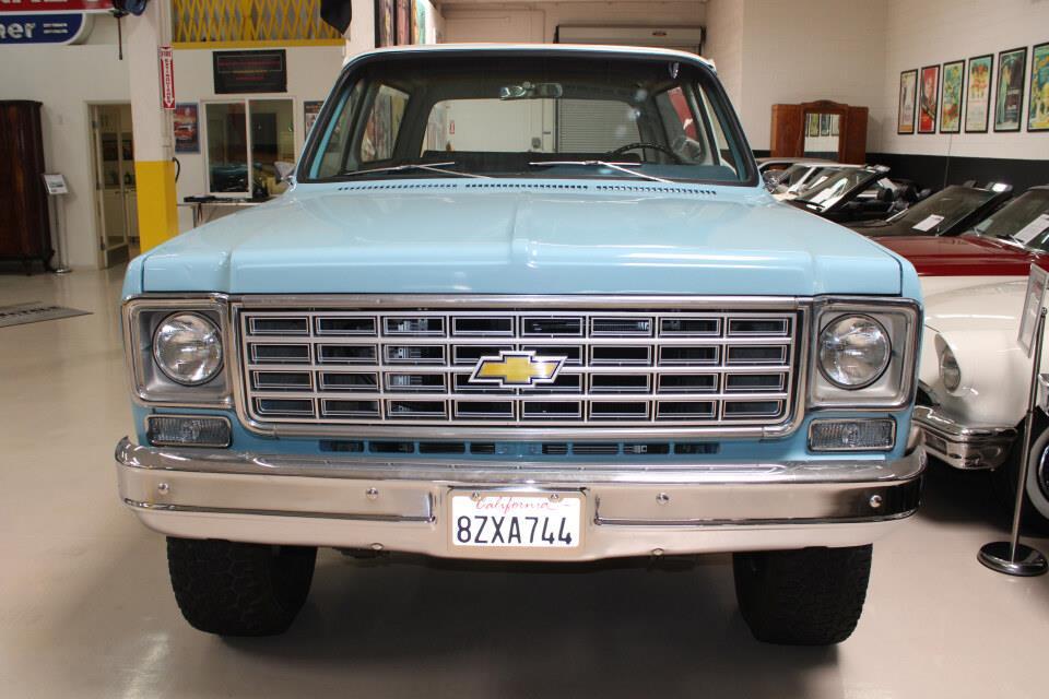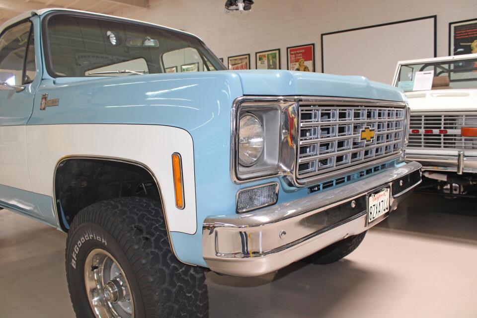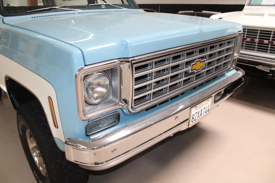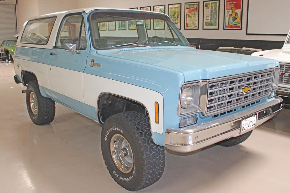 The truck was refinished in blue and white with black pinstripes under previous ownership. Features include a white removable hardtop, chrome bumpers, and K5 Blazer fender badges.