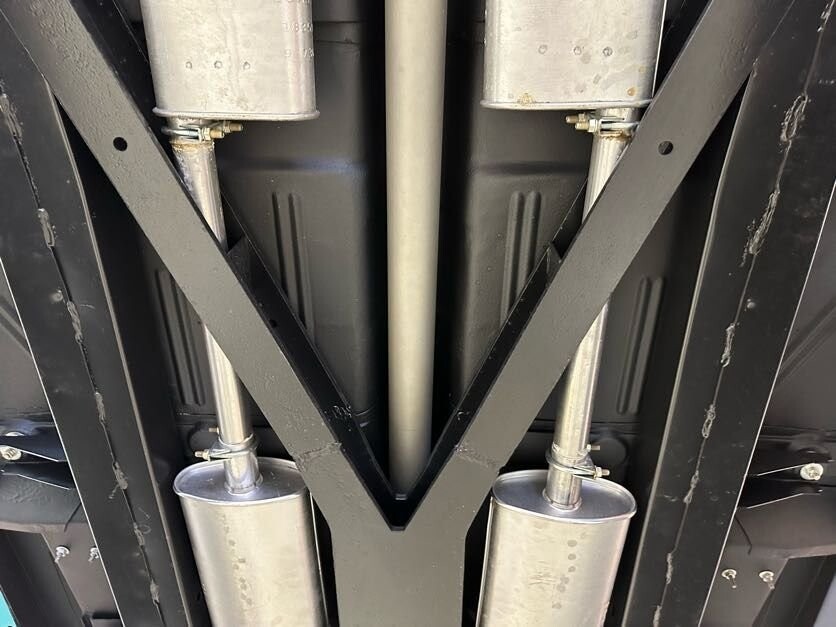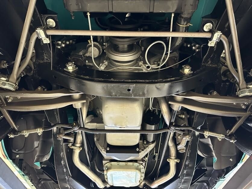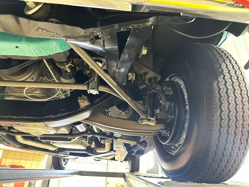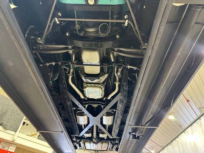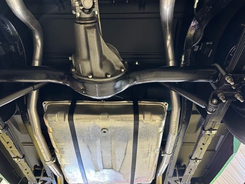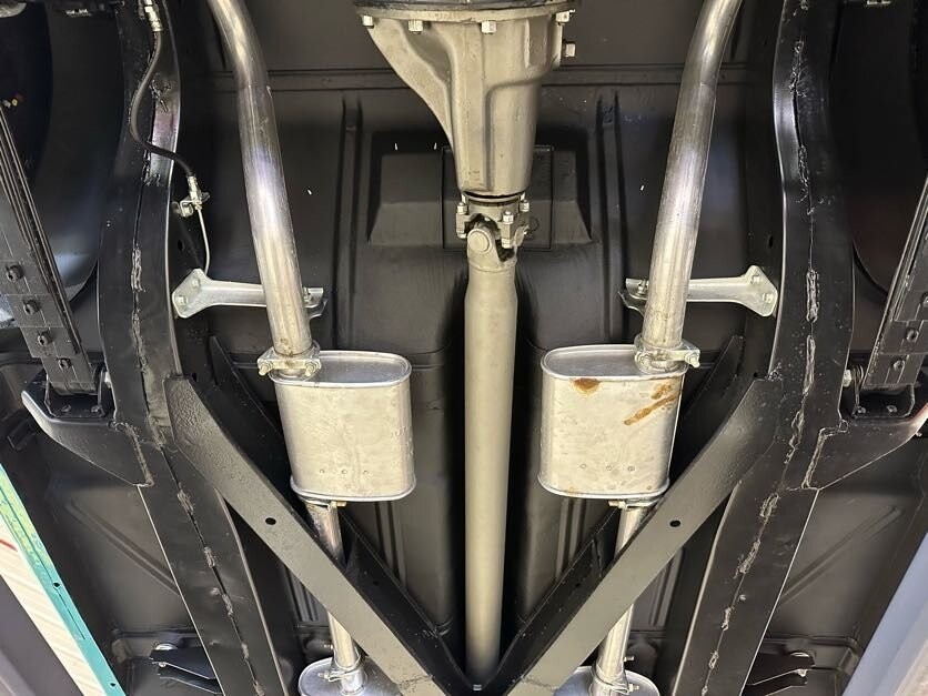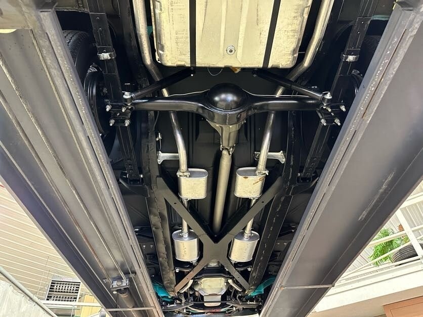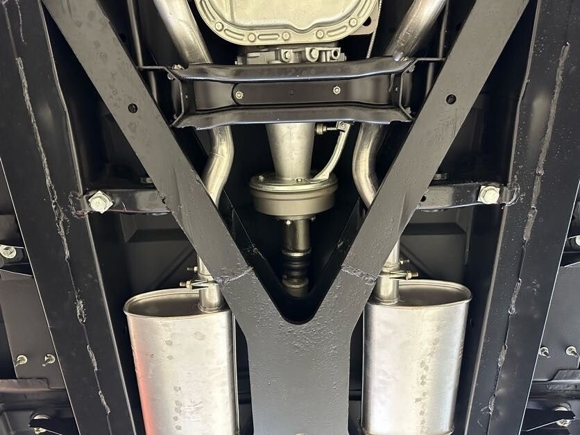 UNDERSIDE: This is one of the cleanest undercarriages we may have ever had. The body was off the frame and literally every component was restored and detailed. The chassis with stripped and painted semi-gloss black. The floors are pristine, clean smooth metal painted satin black. It has the correct dual exhaust system with mufflers and resonators. The fuel system was completely replaced. All the suspension and steering was rebuilt. The brake system was restored, e-brake is hooked up. Bottom of the motor is spotless. The Torqueflite 3-speed automatic trans looks like new. The driveshaft and rear end were restored.