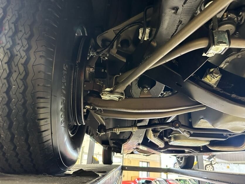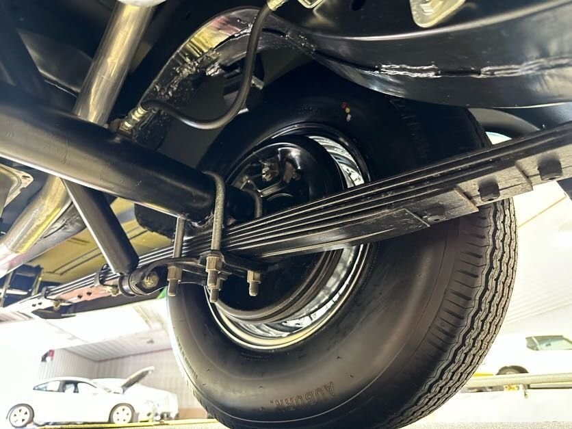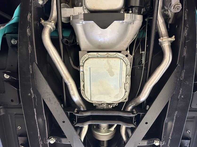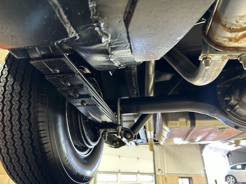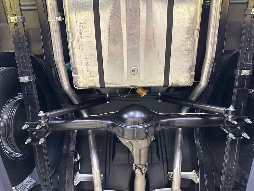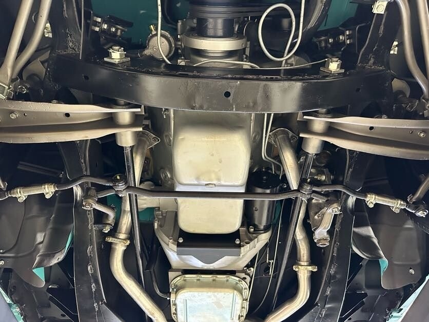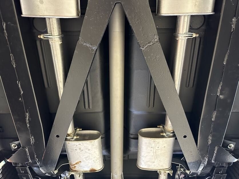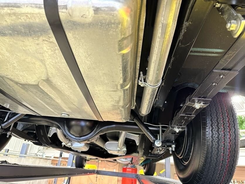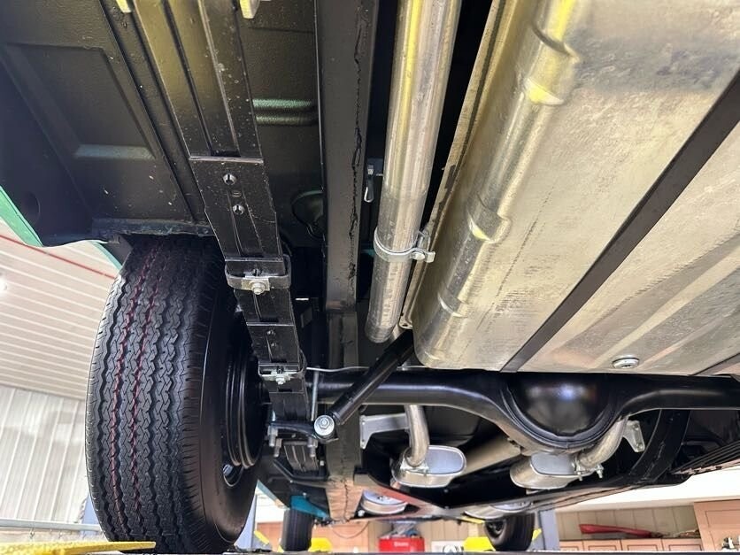 UNDERSIDE: This is one of the cleanest undercarriages we may have ever had. The body was off the frame and literally every component was restored and detailed. The chassis with stripped and painted semi-gloss black. The floors are pristine, clean smooth metal painted satin black. It has the correct dual exhaust system with mufflers and resonators. The fuel system was completely replaced. All the suspension and steering was rebuilt. The brake system was restored, e-brake is hooked up. Bottom of the motor is spotless. The Torqueflite 3-speed automatic trans looks like new. The driveshaft and rear end were restored.