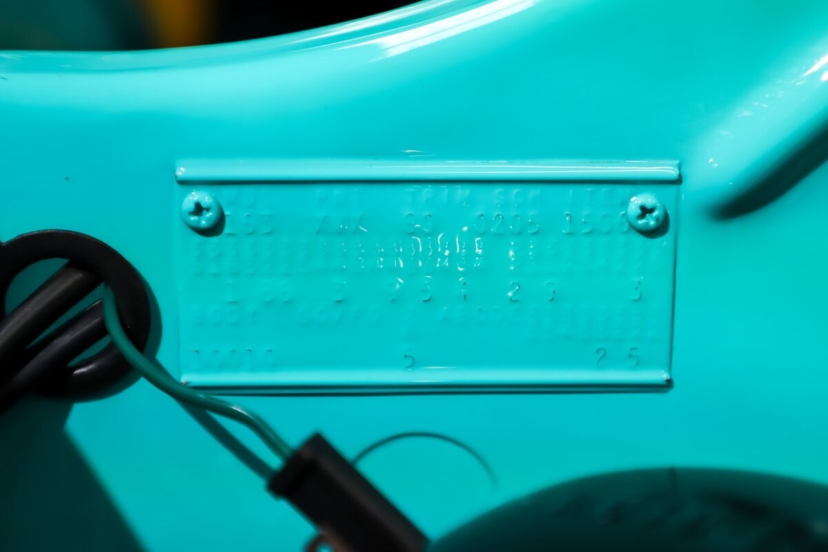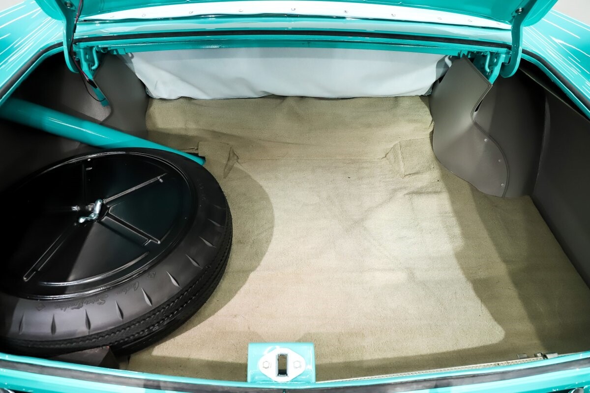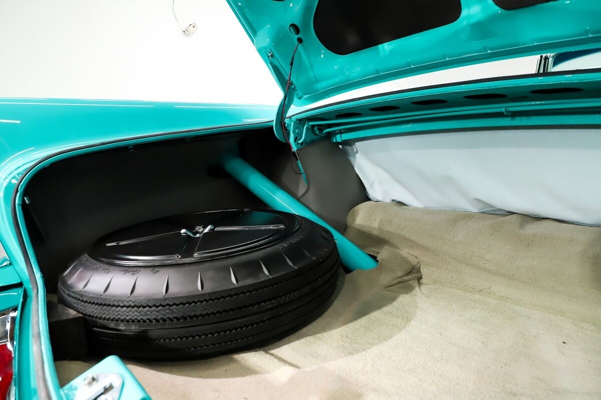 TRUNK COMPARTMENT: Inside this ginormous trunk is completely restored. The turquoise is painted as slick as the exterior. It has the complete liner kit including the carpeted floor and side panels. The latches, stickers, weather strip look like new. The white wall spare has never been used. The rim and jack are restored like new and secured properly.