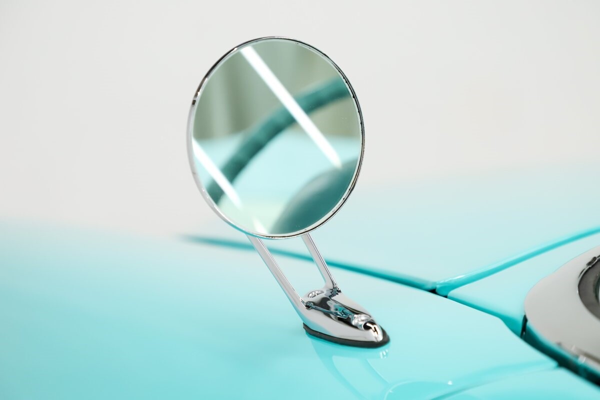 EXTERIOR: How can you top this? If this doesn't impress I don't know what will! It is restored beyond factory specifications. The body is literally laser straight, every square inch. There's zero rust, zero damage. Repainted gorgeous Indian Turquoise is polished like glass. Every piece of chrome and trim is restored to show quality. All new glass with rechromed frames. Bright white power top. We just installed brand new radial whitewalls and wire wheels. The correct hubcaps in pristine shape are included too.