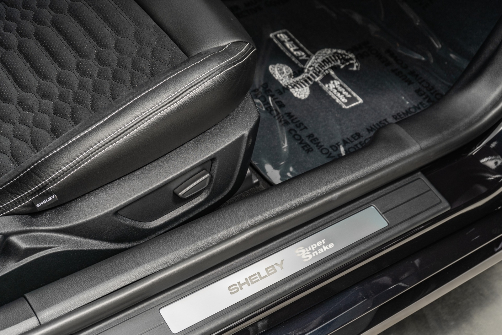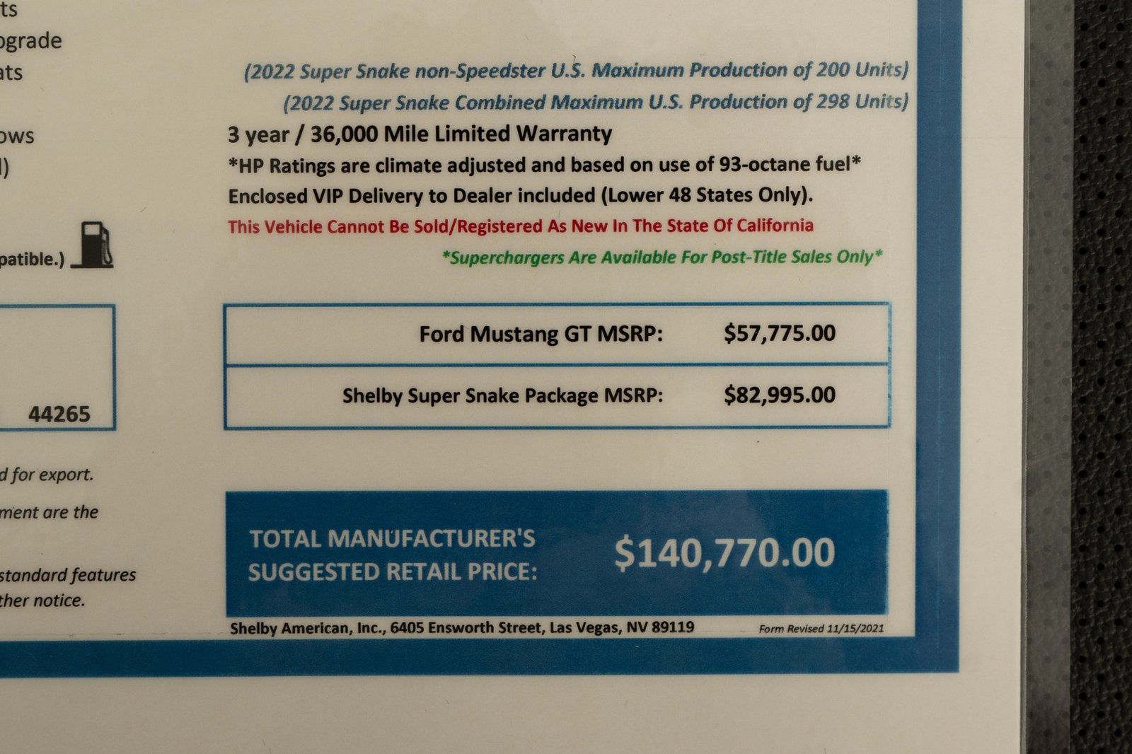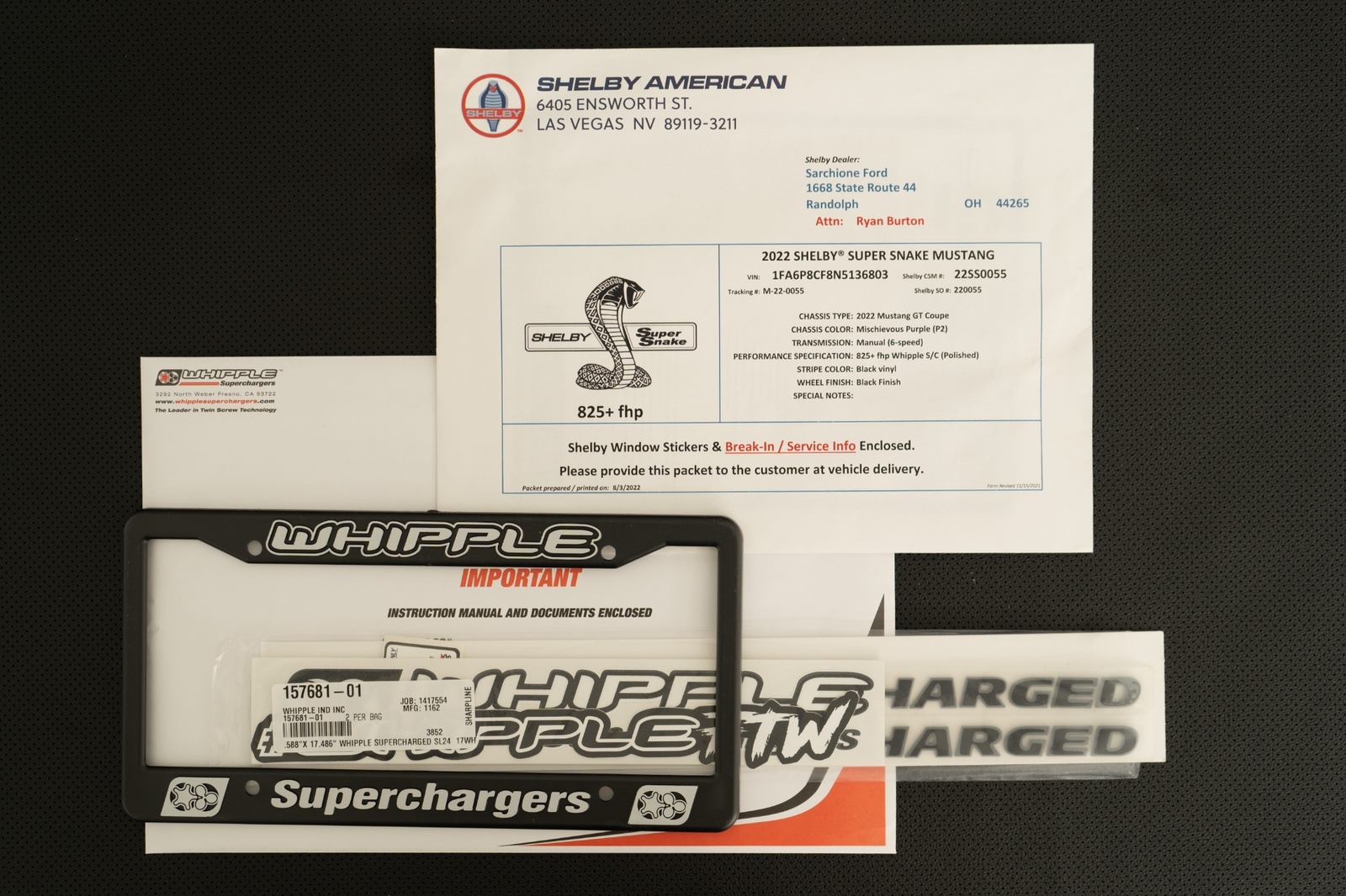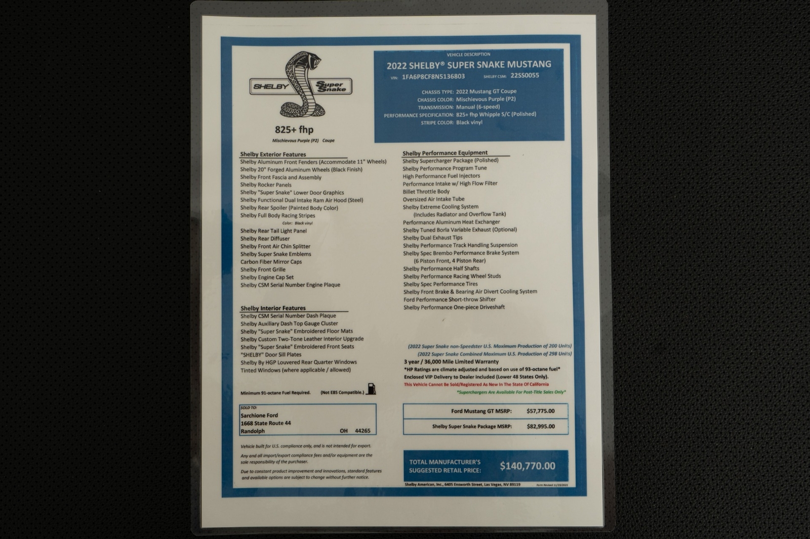 We have just added to our extensive exotic car inventory a beautiful 2022 Ford Shelby Super Snake in Mischevous Purple over Ebony leather interior and only 201 miles. This Super Snake is loaded with the Shelby Super Snake Package which includes: Shelby Whipple-supercharged 5 liter V8 with more than 825 horsepower, 6 speed manual transmission, a polished supercharger, a high flow billet throttle body, a heavy duty cooling system, larger halfshafts, a VERY short throw shifter, Brembo performance 6 piston front and 4 piston rear brakes, Shelby ECU tune, Shelby body kit with wider front fenders to accommodate 11 inch wide wheels, Super Snake graphics, Shelby specific badging, custom Shelby two-tone leather and Alcantara, 20" forged aluminum wheels, Shelby floor mats and much more. The car is built on a Mustang GT Premium which incudes option package 401A (premier interior trim, Ford safe and smart package, adaptive cruise control, voice activated touchscreen navigation), heated and ventilated front seats, Magneride suspension, the GT Performance package with a Torsen rear differential, a 12 speaker Bang and Olufsen audio system and more. The Super Snake package added $82,995 to the price of the base car for a total cost of $140,770.