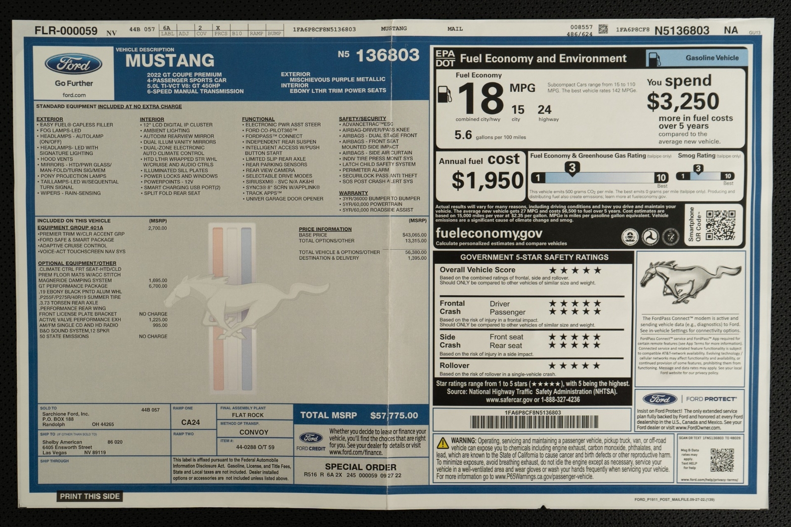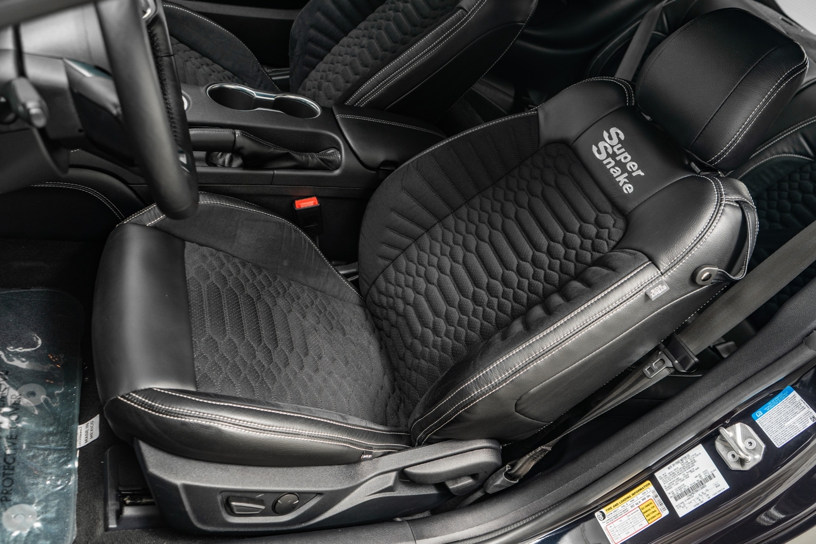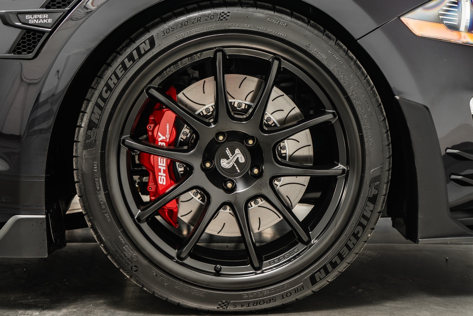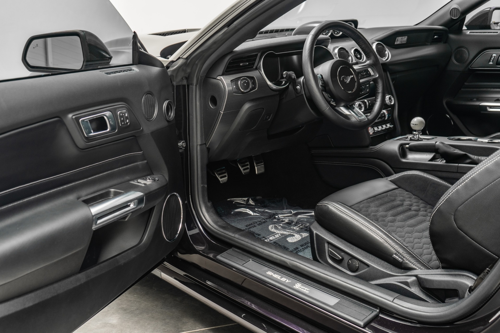 We have just added to our extensive exotic car inventory a beautiful 2022 Ford Shelby Super Snake in Mischevous Purple over Ebony leather interior and only 201 miles. This Super Snake is loaded with the Shelby Super Snake Package which includes: Shelby Whipple-supercharged 5 liter V8 with more than 825 horsepower, 6 speed manual transmission, a polished supercharger, a high flow billet throttle body, a heavy duty cooling system, larger halfshafts, a VERY short throw shifter, Brembo performance 6 piston front and 4 piston rear brakes, Shelby ECU tune, Shelby body kit with wider front fenders to accommodate 11 inch wide wheels, Super Snake graphics, Shelby specific badging, custom Shelby two-tone leather and Alcantara, 20" forged aluminum wheels, Shelby floor mats and much more. The car is built on a Mustang GT Premium which incudes option package 401A (premier interior trim, Ford safe and smart package, adaptive cruise control, voice activated touchscreen navigation), heated and ventilated front seats, Magneride suspension, the GT Performance package with a Torsen rear differential, a 12 speaker Bang and Olufsen audio system and more. The Super Snake package added $82,995 to the price of the base car for a total cost of $140,770.