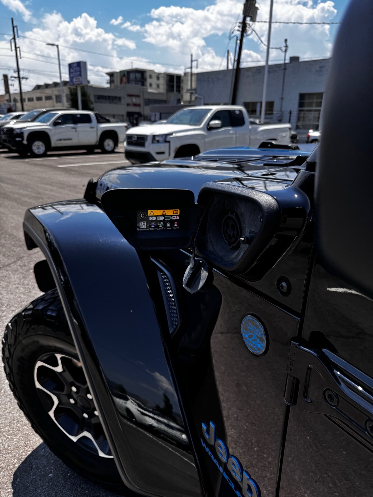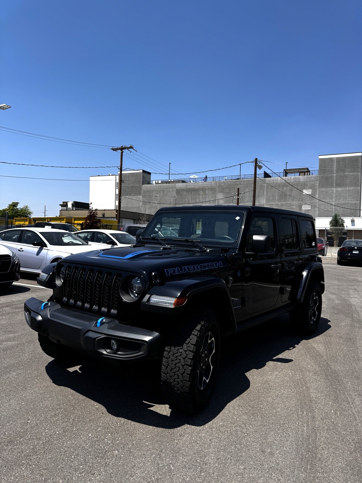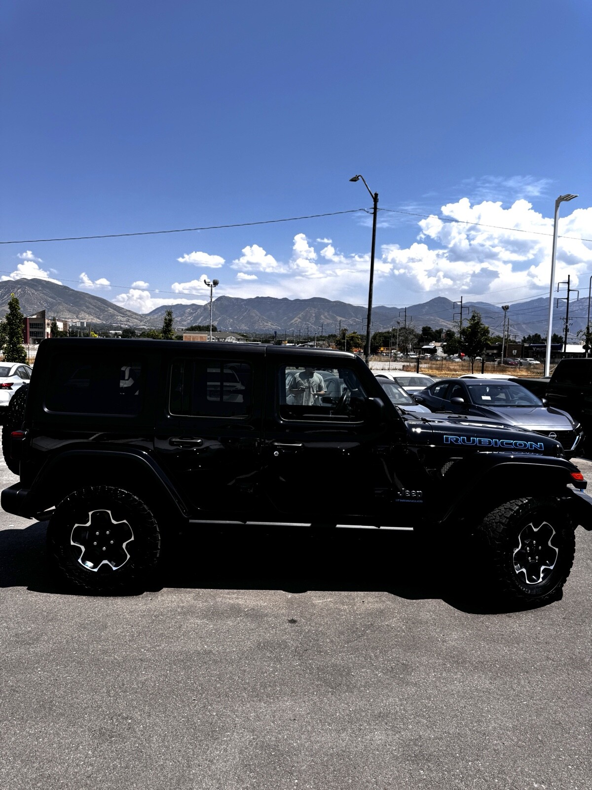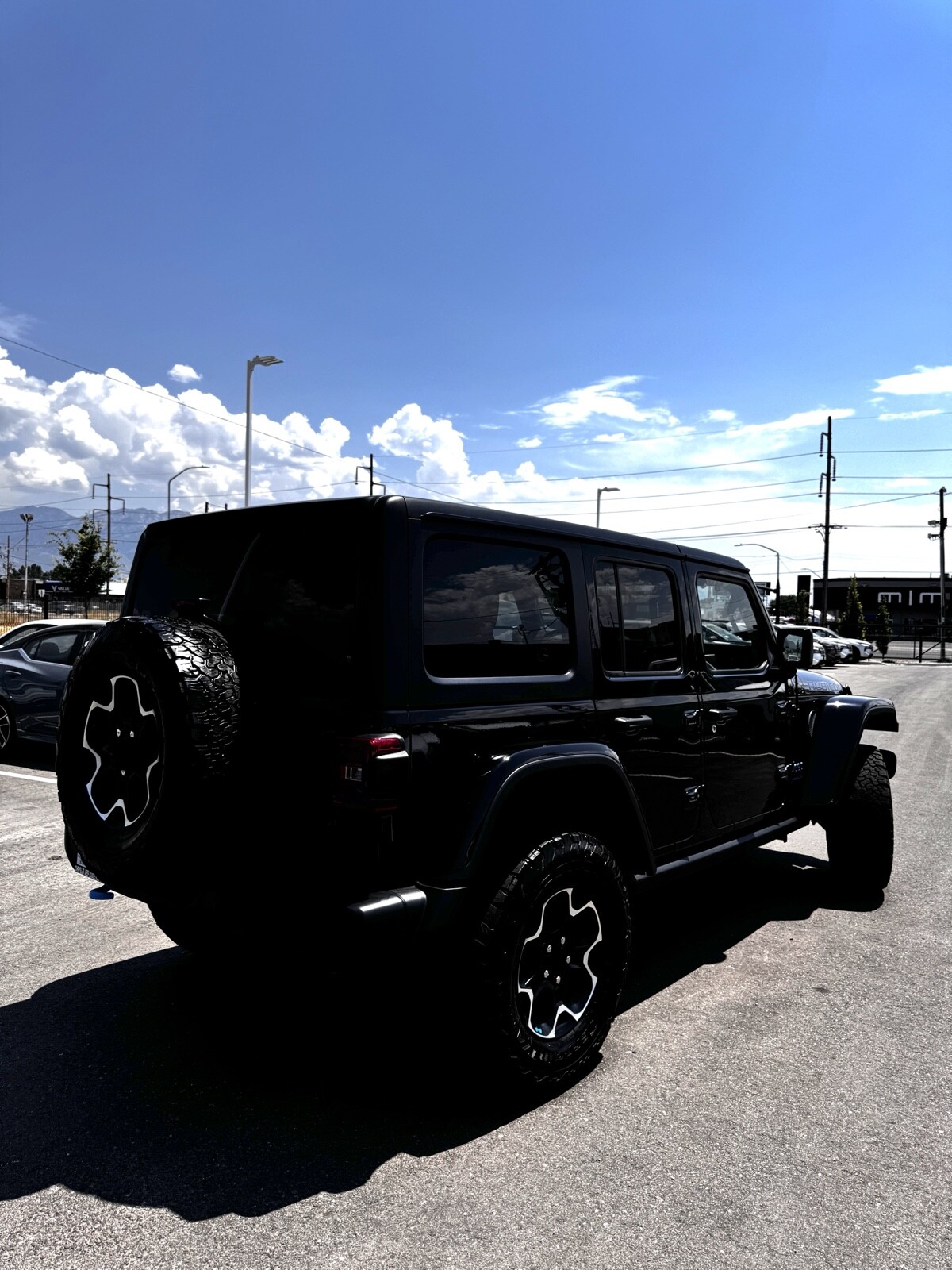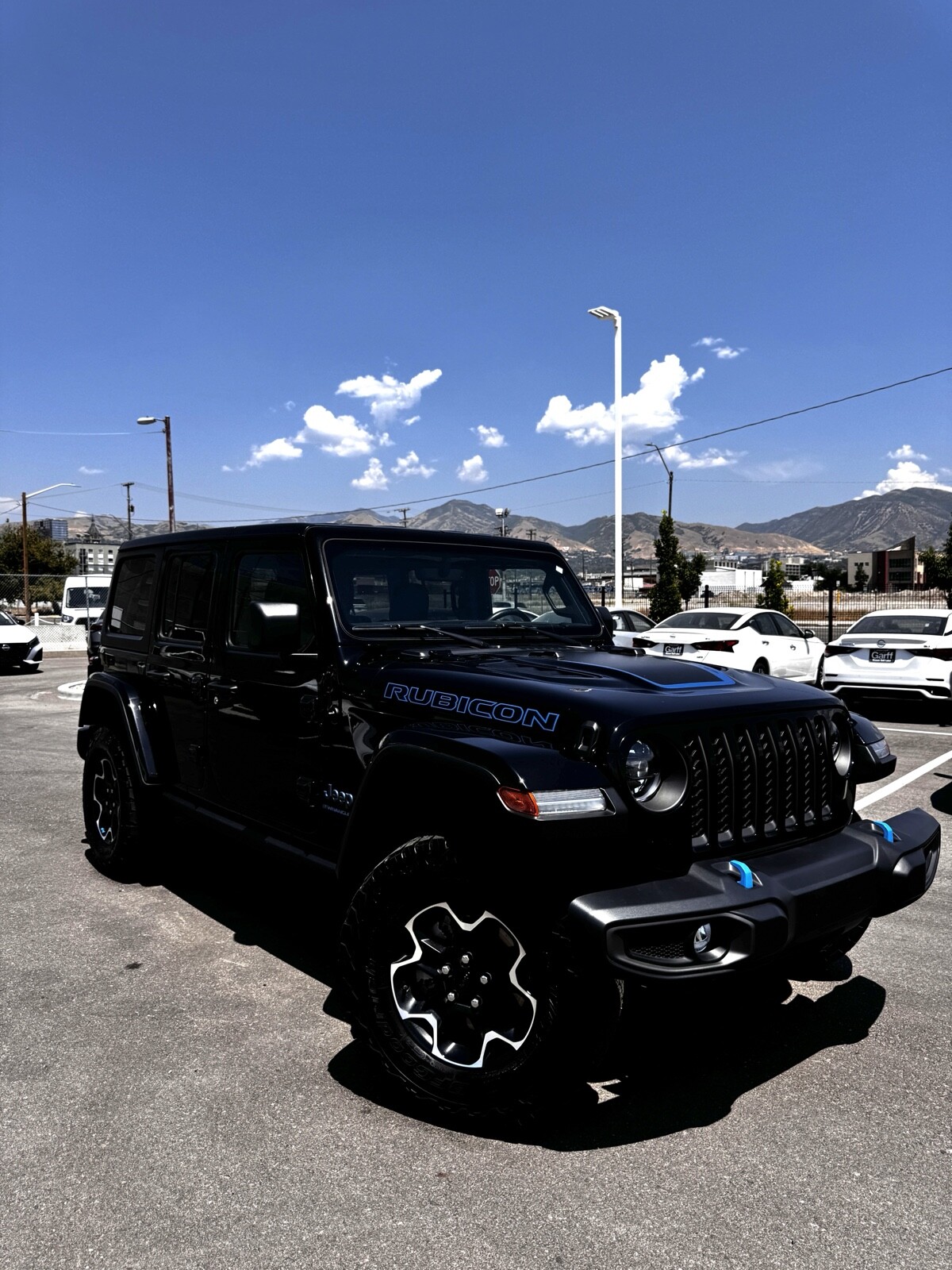 The 2023 Jeep Wrangler Rubicon 4xe is a 4WD hybrid SUV with a 2.0L turbocharged engine and electric motors that produce 375 horsepower and 470 pound-feet of torque. It has an 8-speed automatic transmission and three e-Selec driving modes, including Hybrid Mode, which combines the engine and electric motors for maximum acceleration.