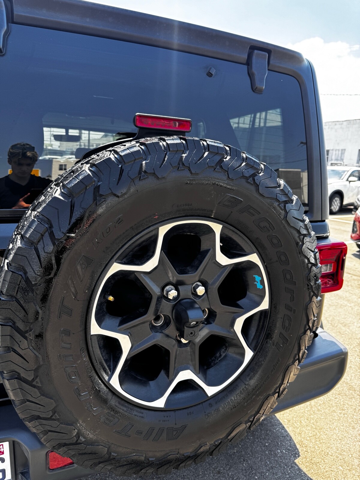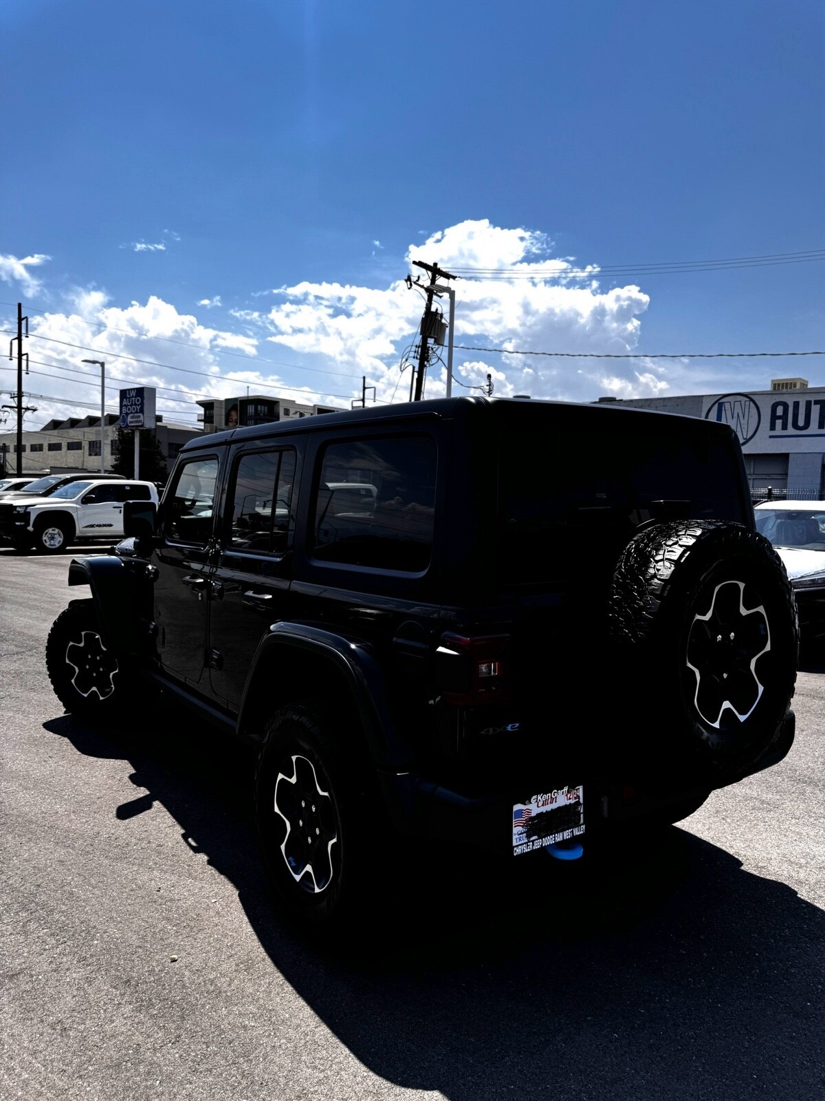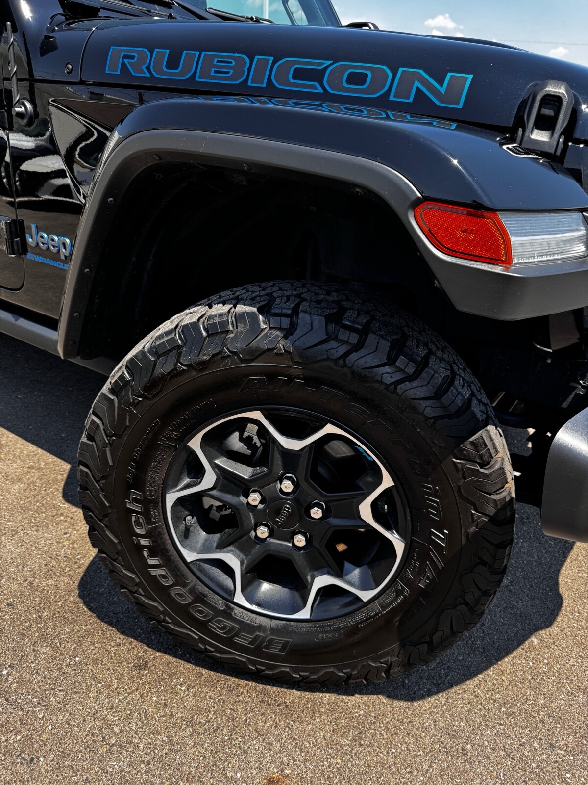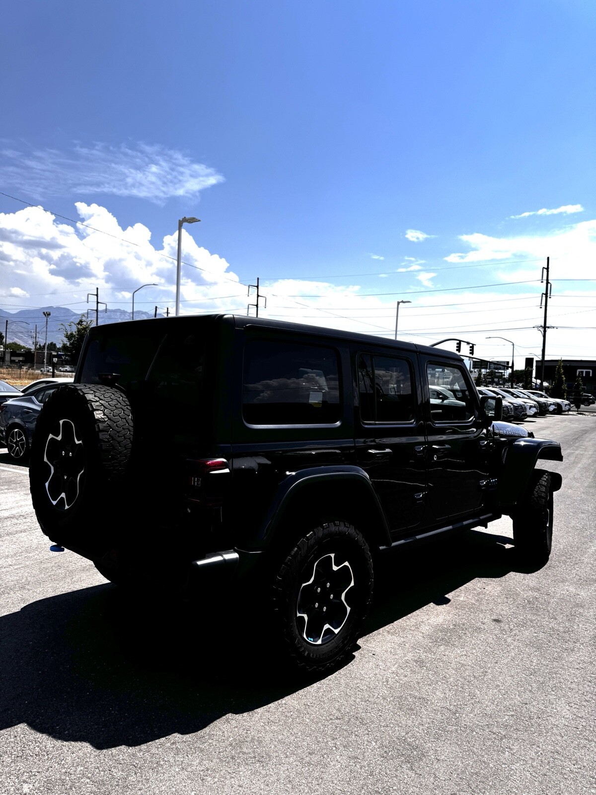 The 2023 Jeep Wrangler Rubicon 4xe is a 4WD hybrid SUV with a 2.0L turbocharged engine and electric motors that produce 375 horsepower and 470 pound-feet of torque. It has an 8-speed automatic transmission and three e-Selec driving modes, including Hybrid Mode, which combines the engine and electric motors for maximum acceleration.